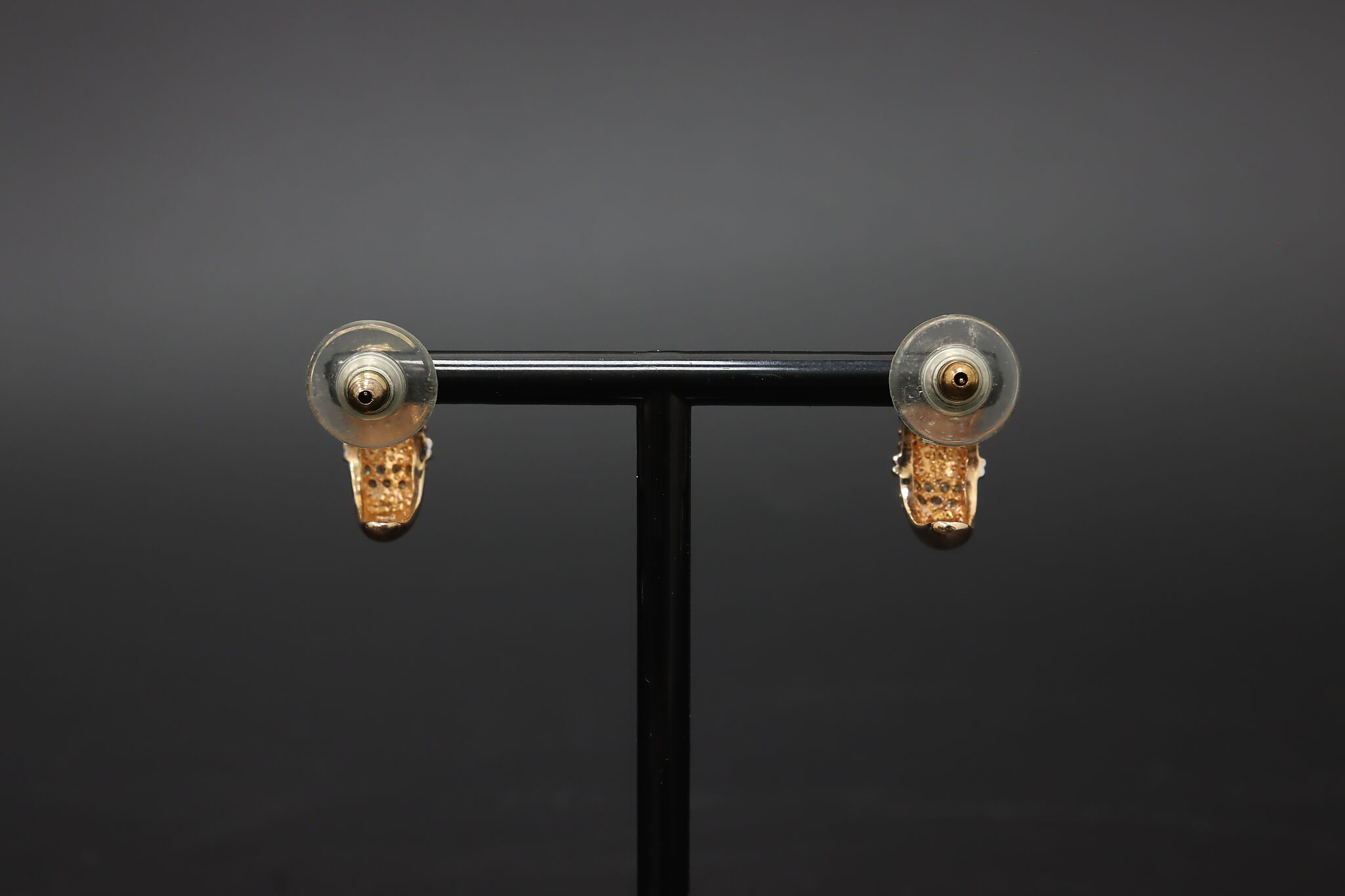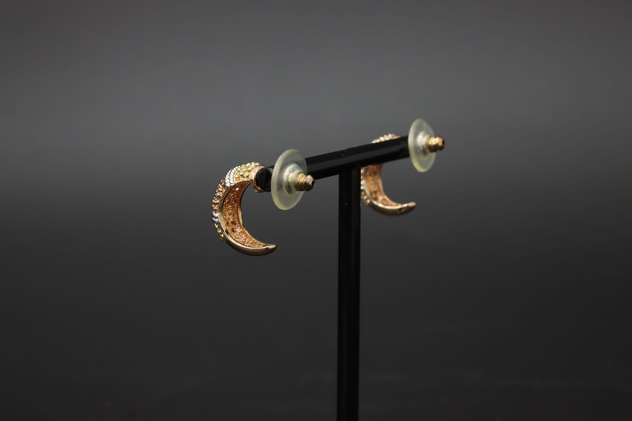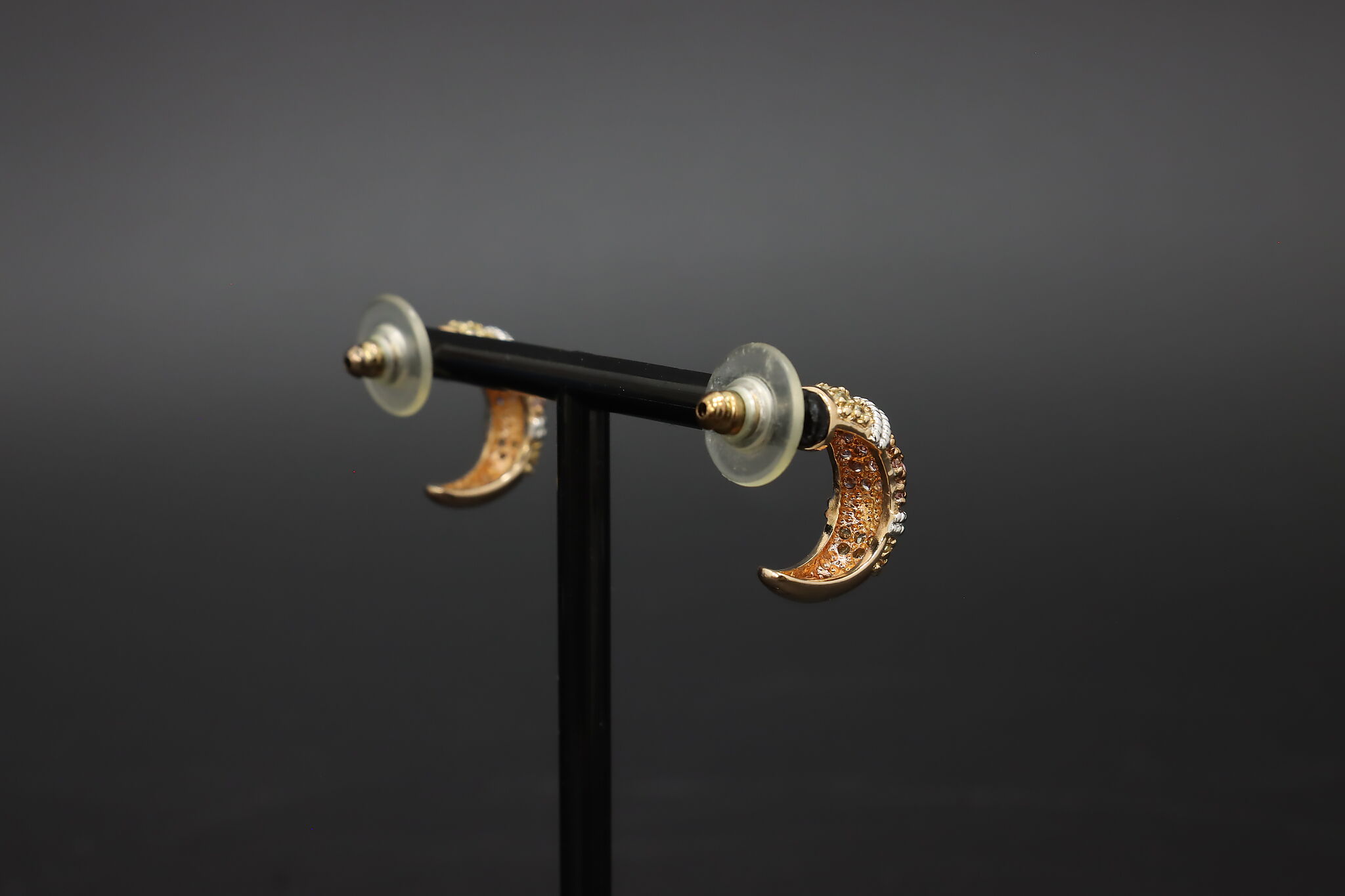 Stylish sterling silver hoop earrings with gold and rose tone accents and sparkling pave set cubic zirconia stones for a bold, luxury-inspired look.