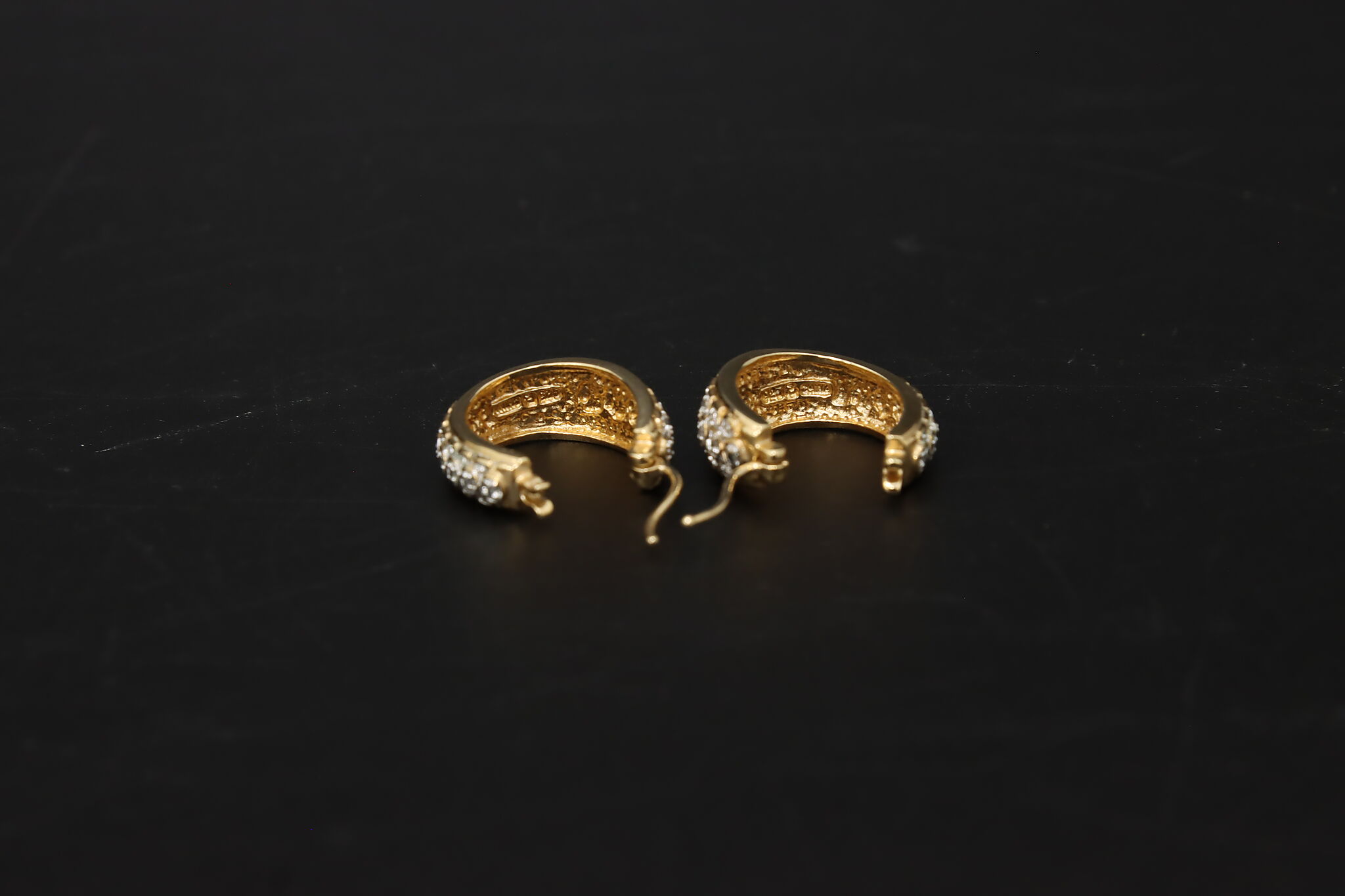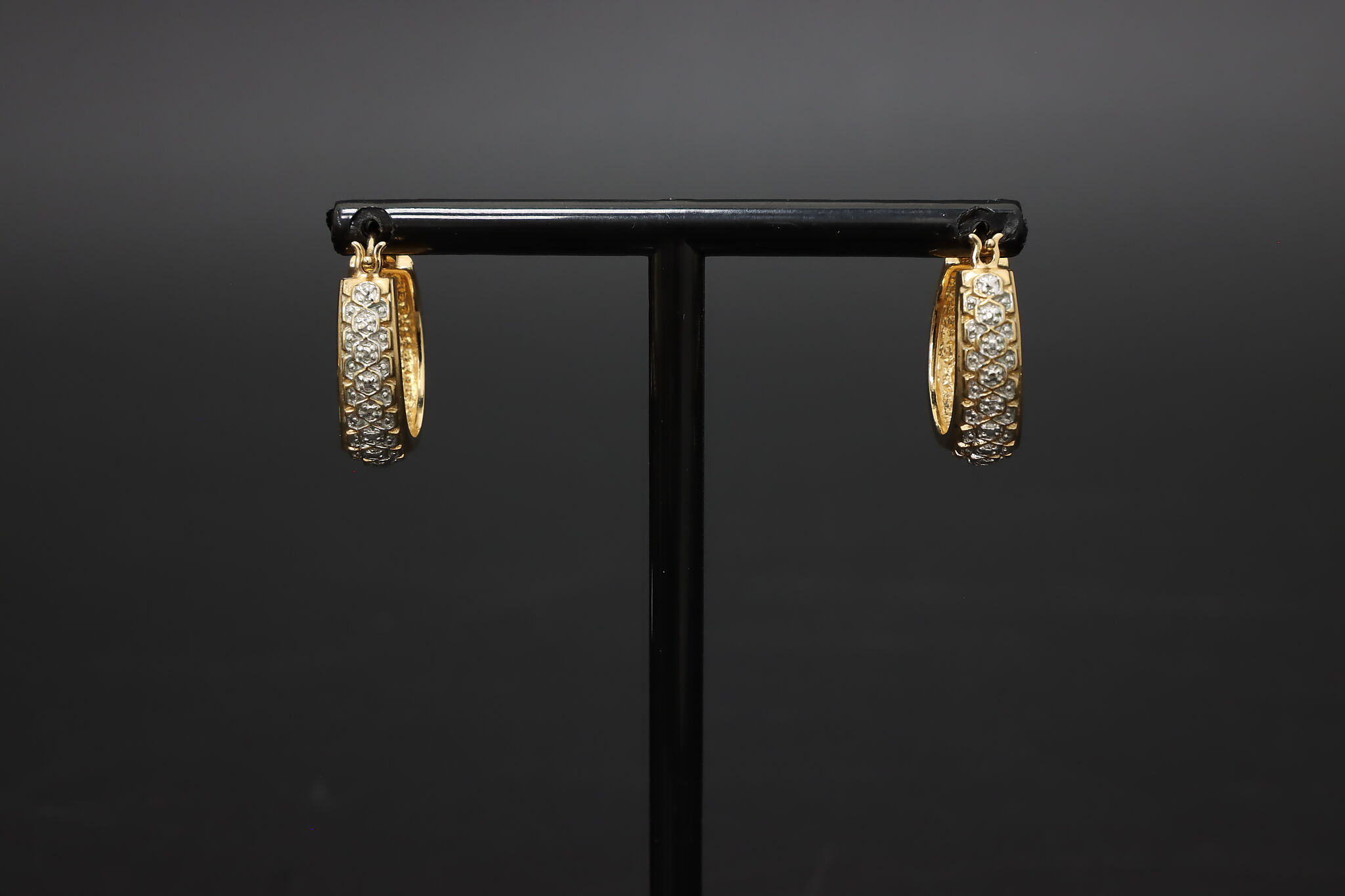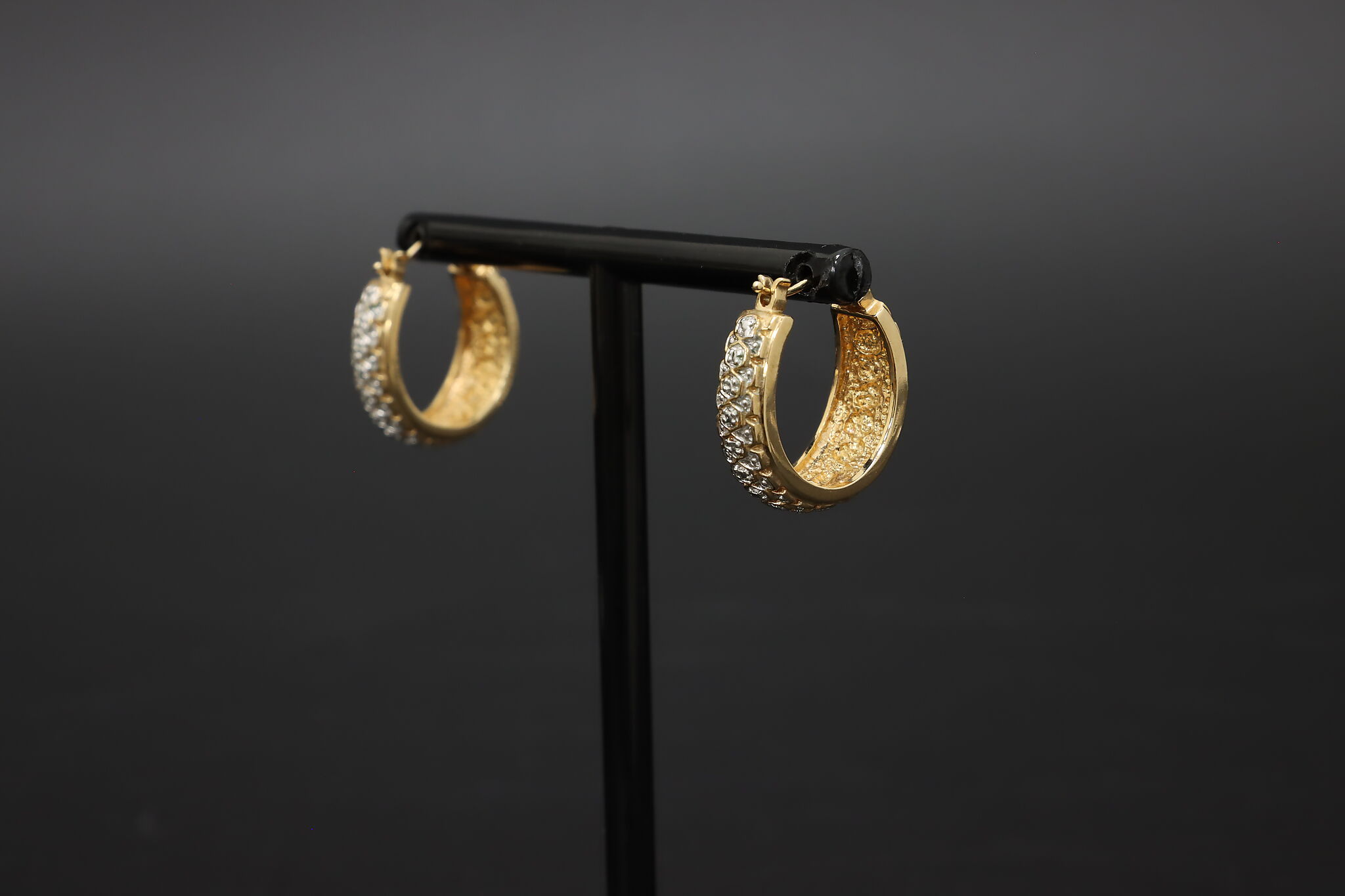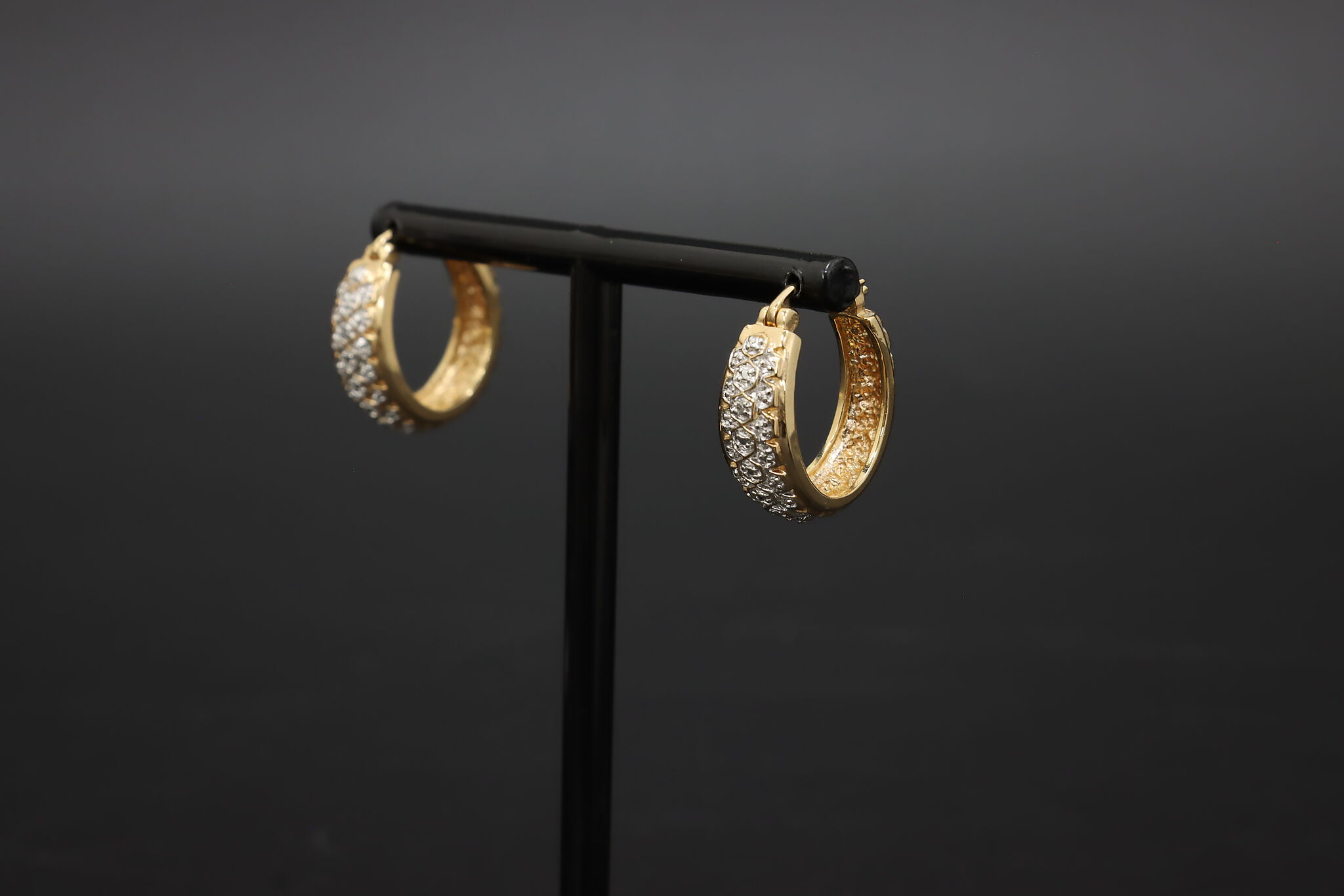 Bold sterling silver hoop earrings with rich gold tone finish and sparkling pave set cubic zirconia stones for a bright, luxury inspired look.