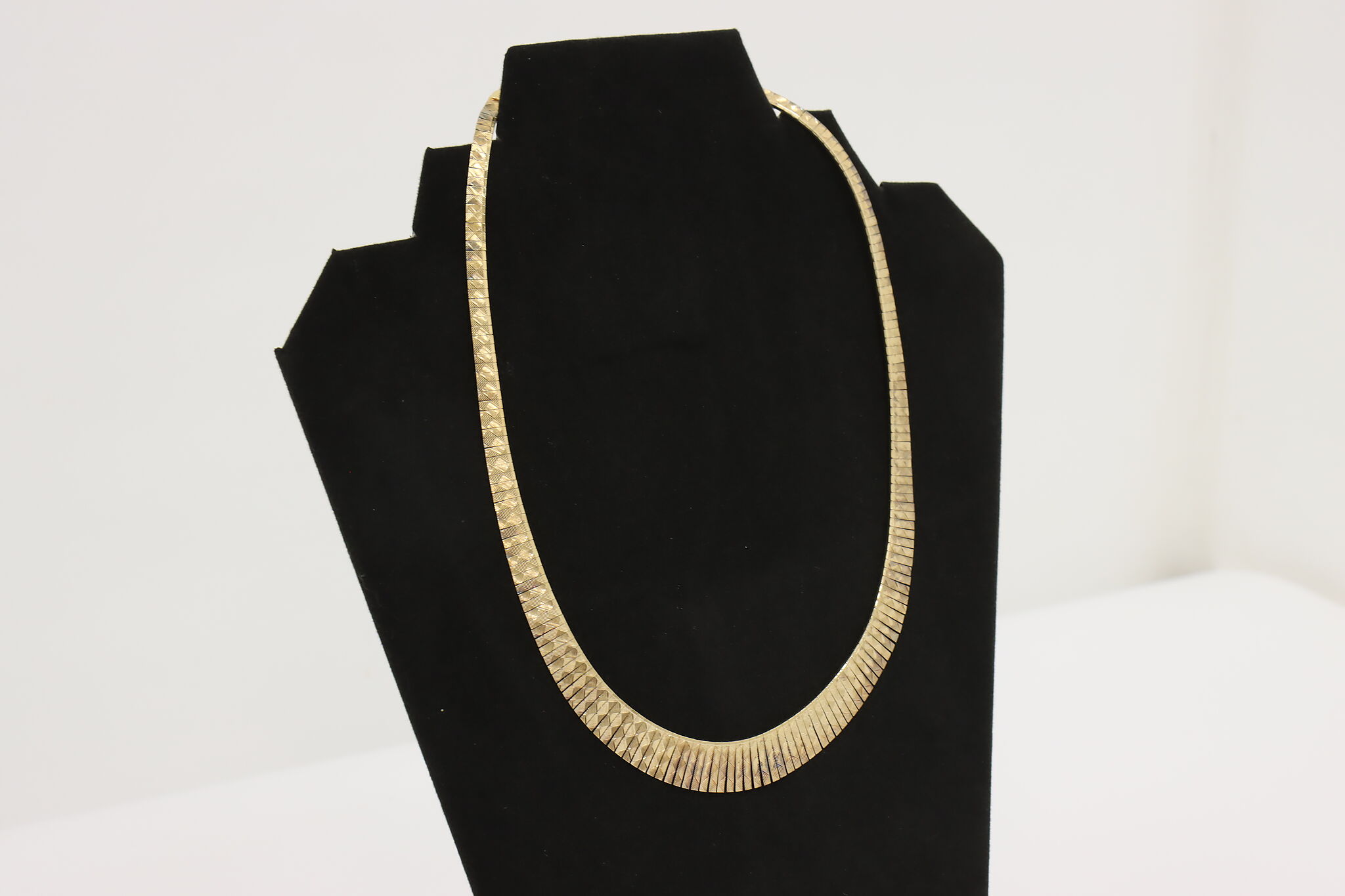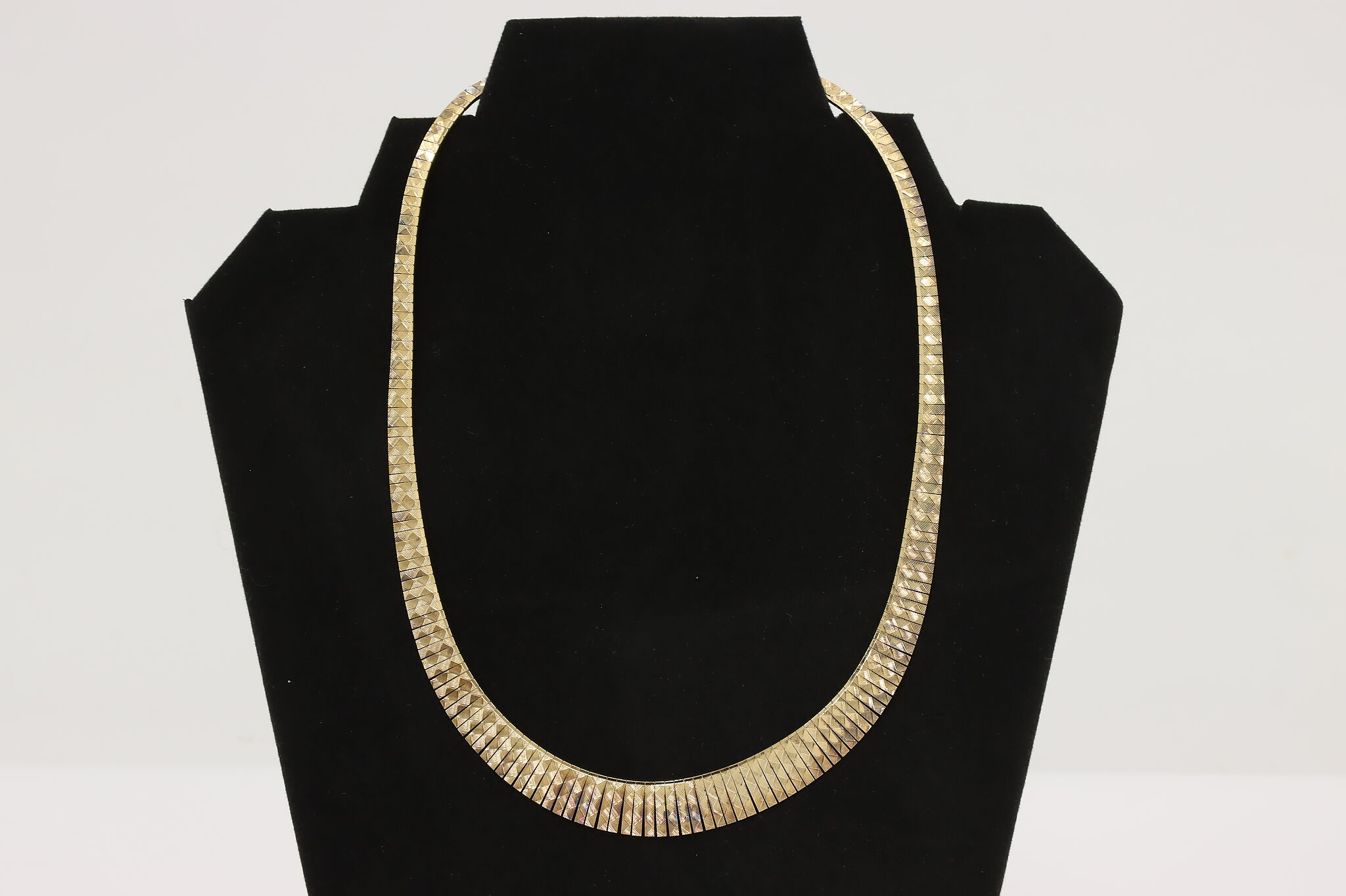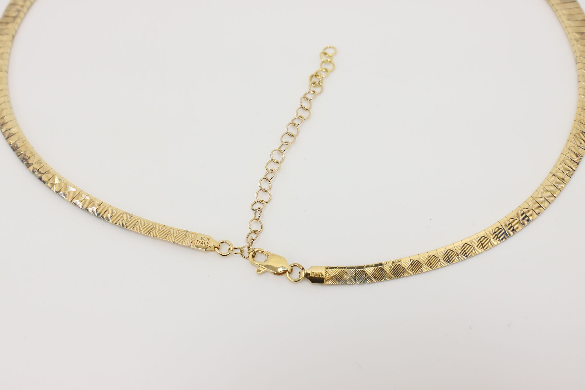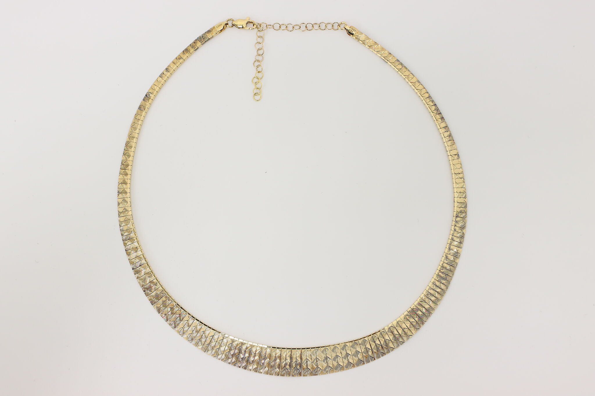 A bold gold-plated sterling silver collar-style necklace featuring an intricate engraved pattern with a high-shine finish.