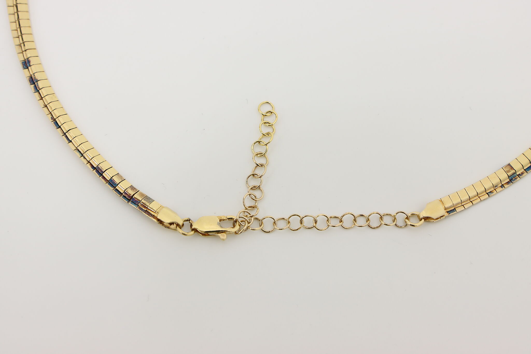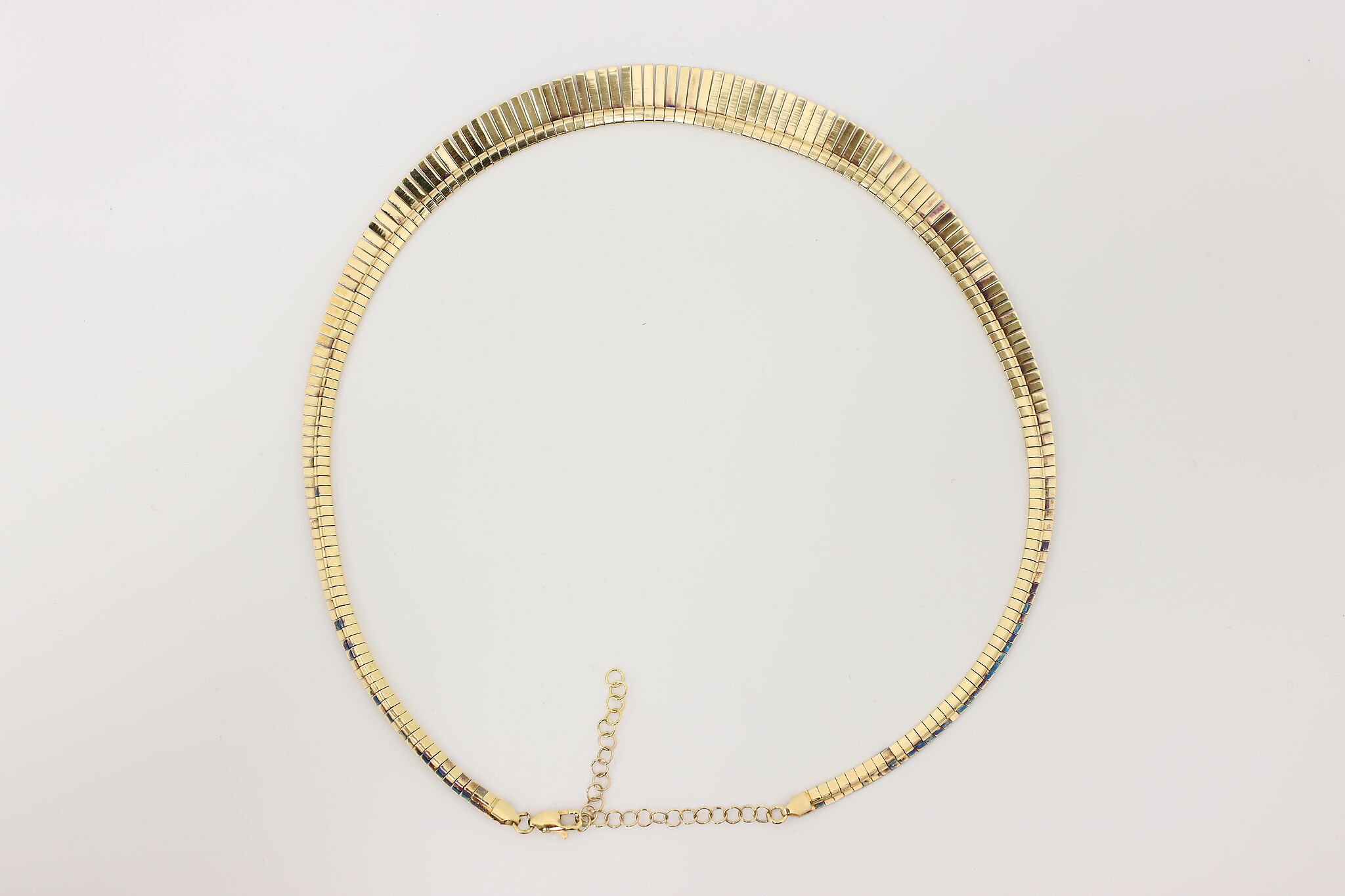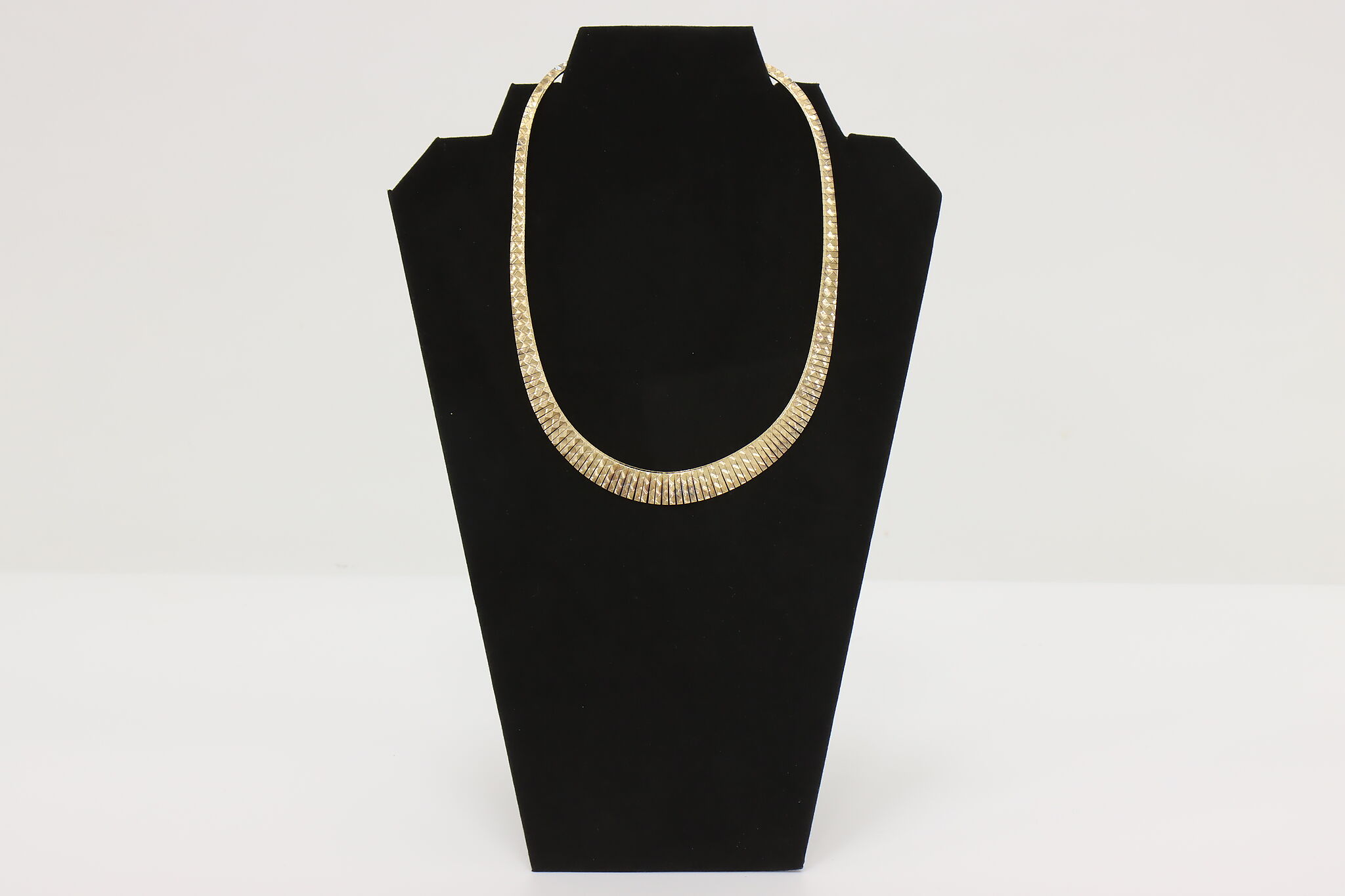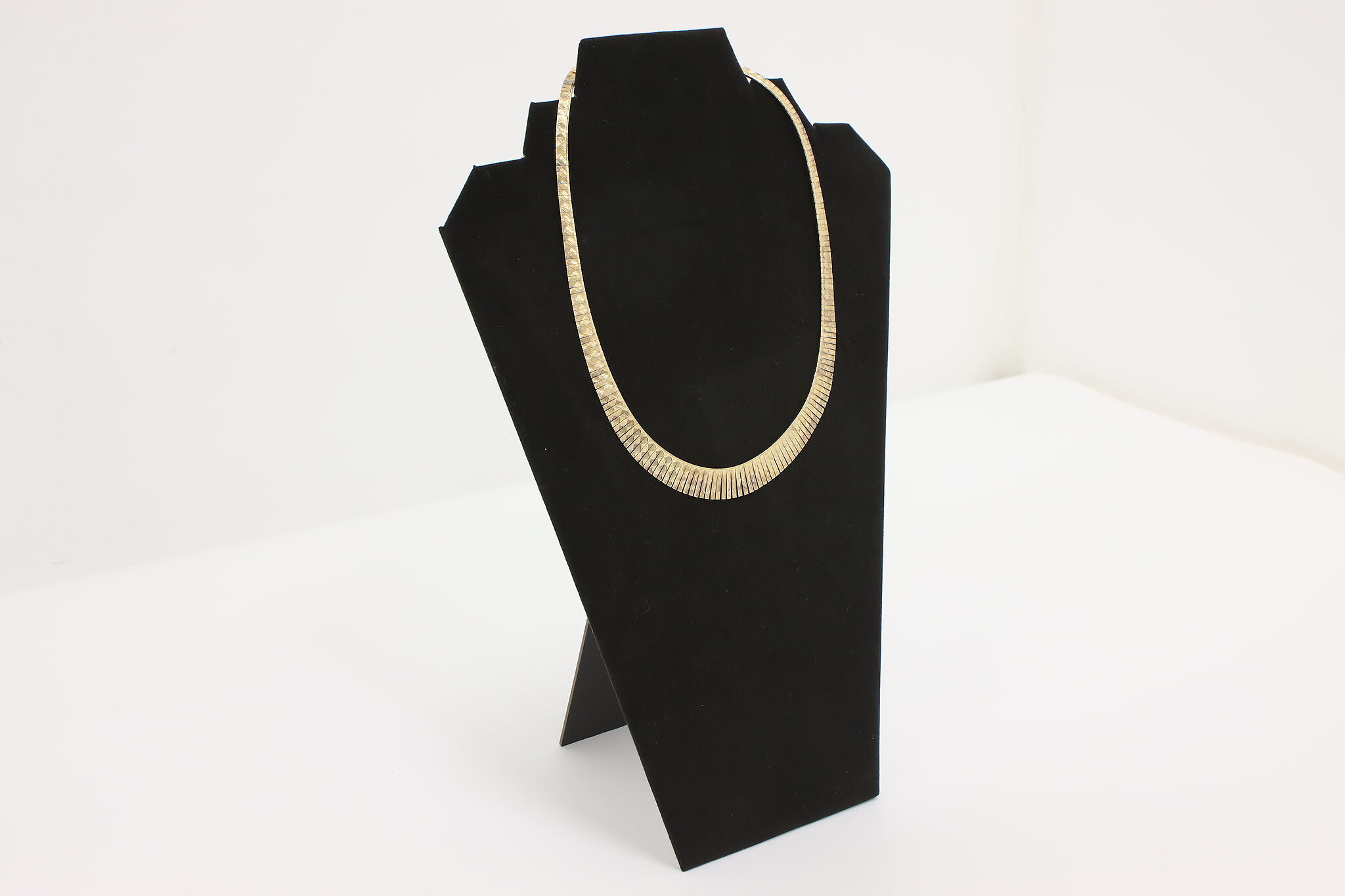 A bold gold-plated sterling silver collar-style necklace featuring an intricate engraved pattern with a high-shine finish.