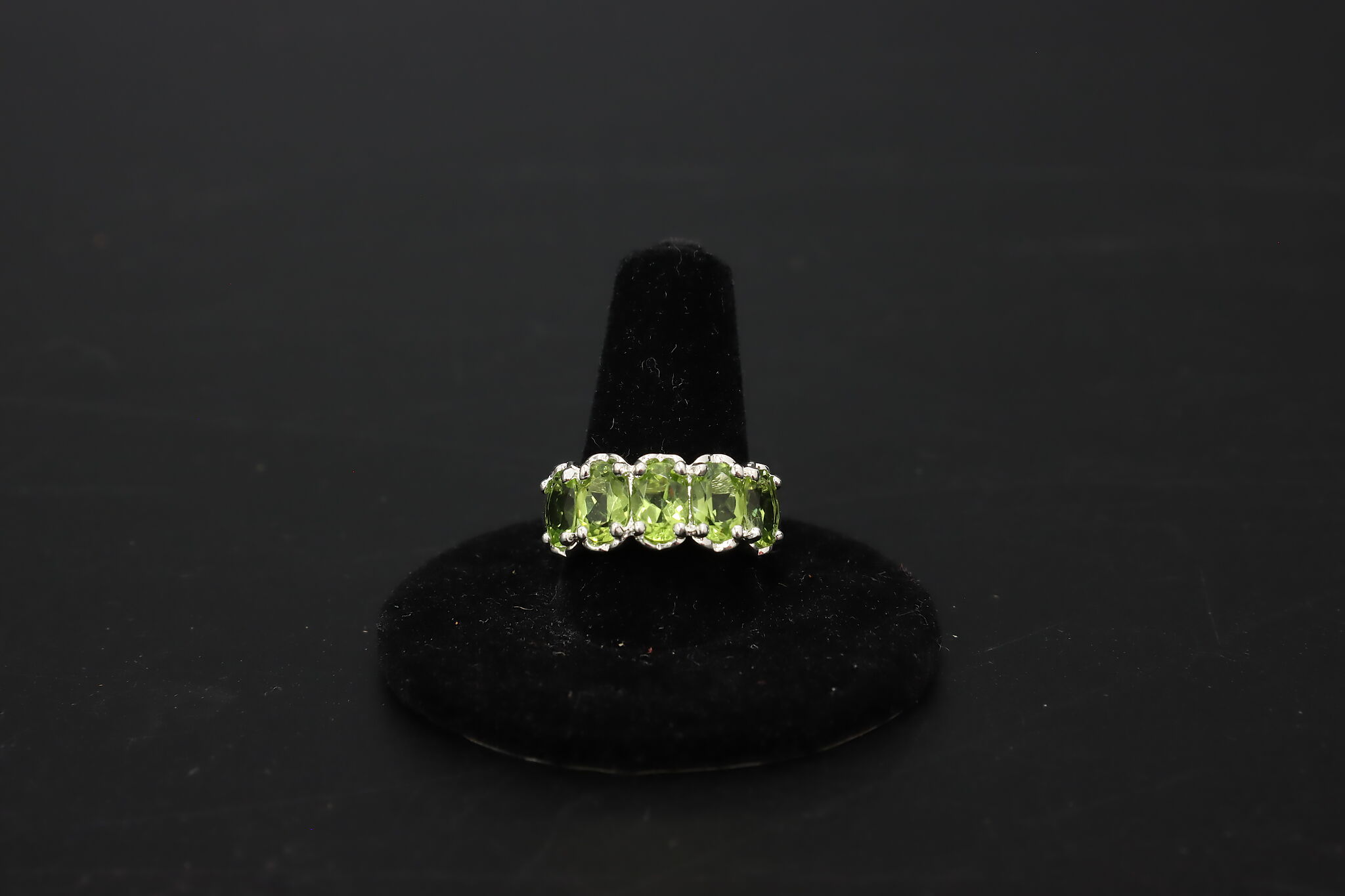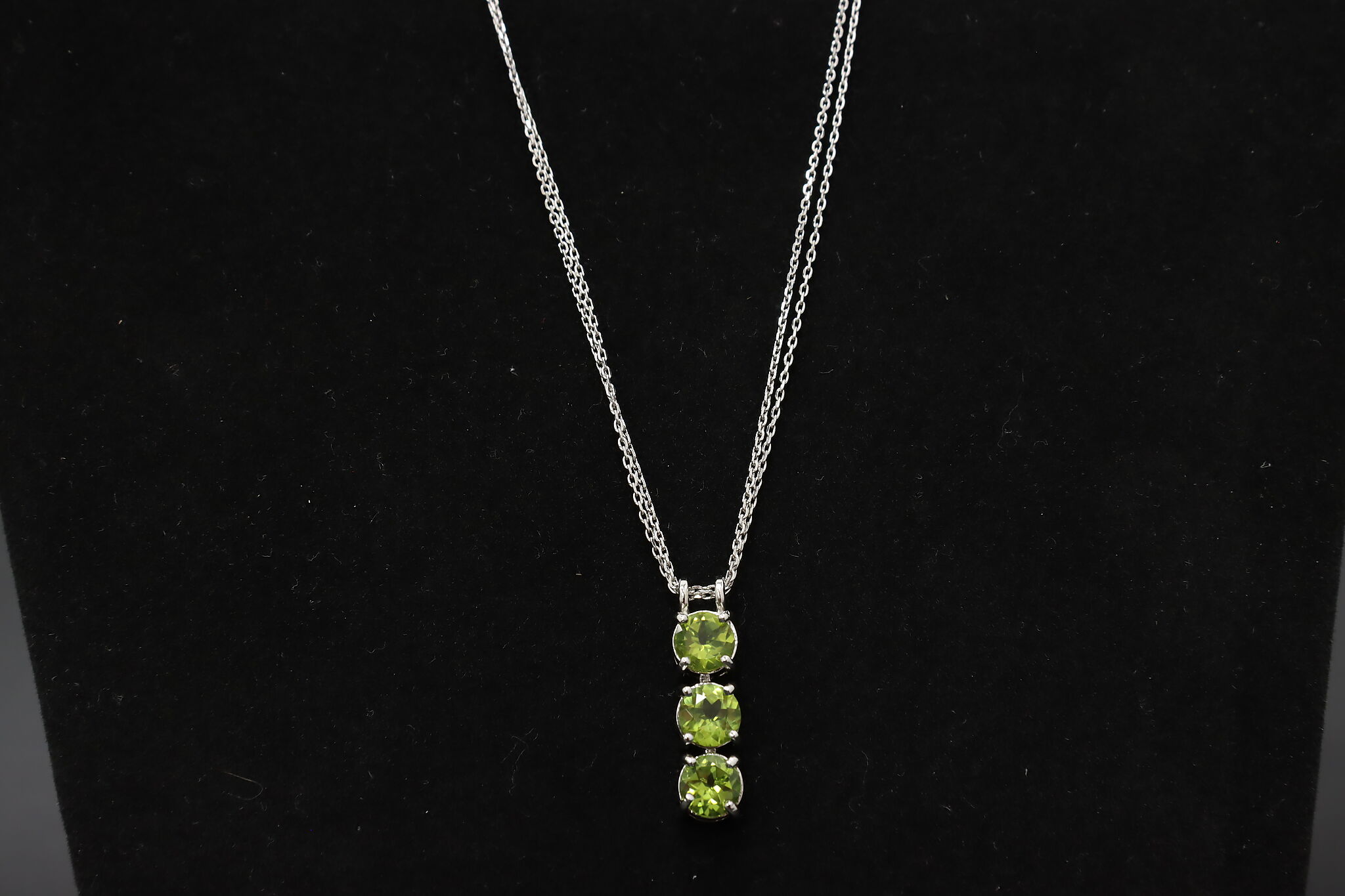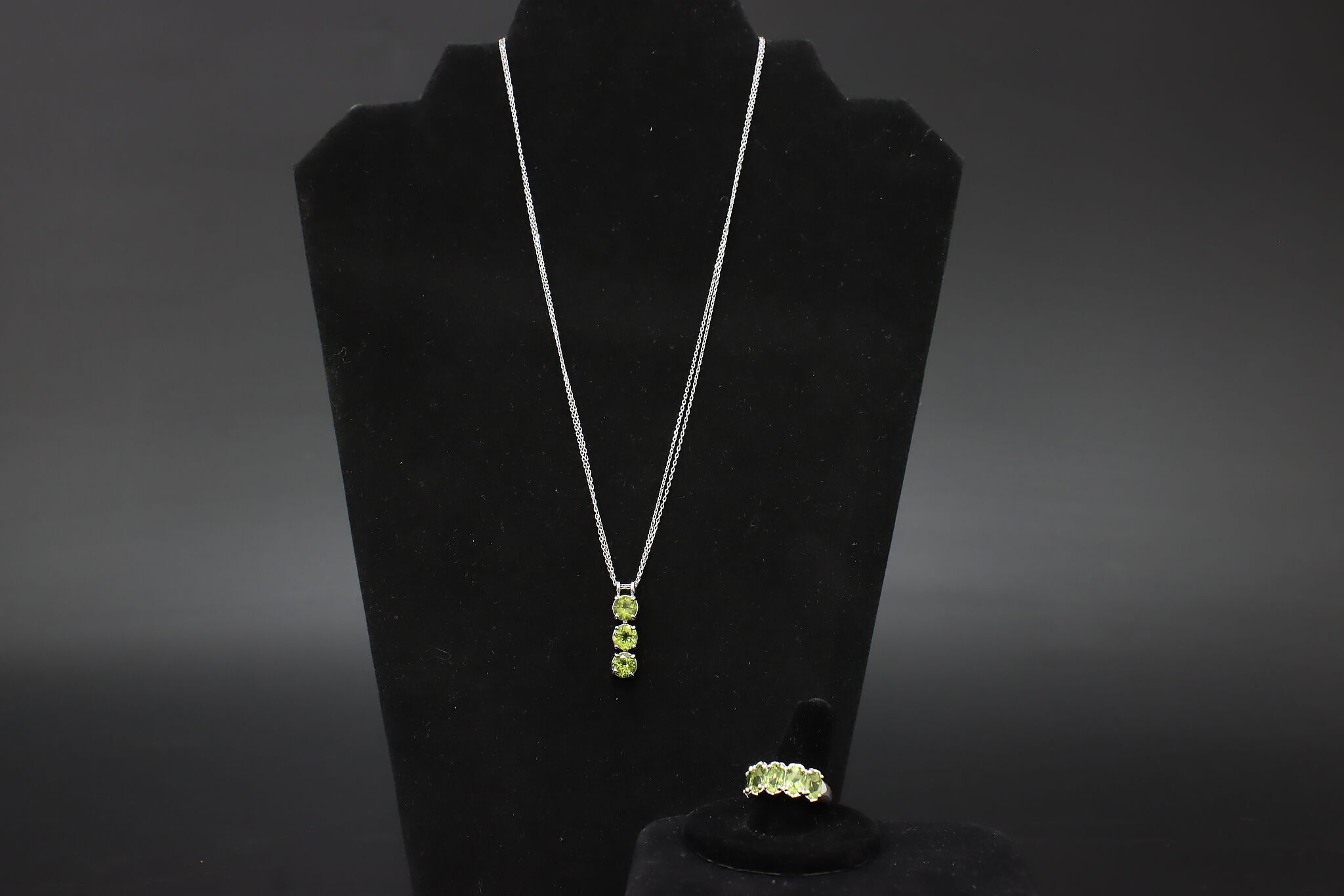 Elegant sterling silver jewelry set featuring vibrant faceted green peridot gemstones in a vertical drop pendant and matching multi-stone band ring. The bright olive-green sparkle of peridot makes this a beautiful everyday or dress jewelry set.
