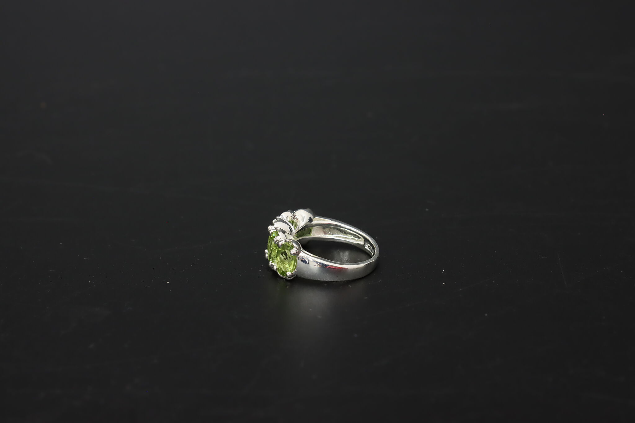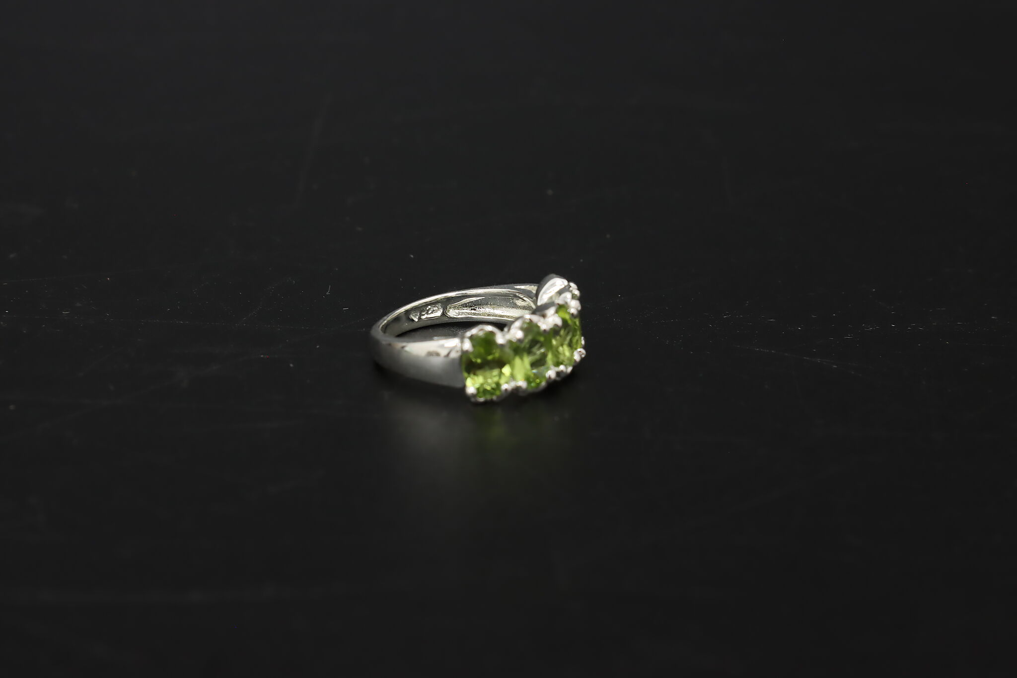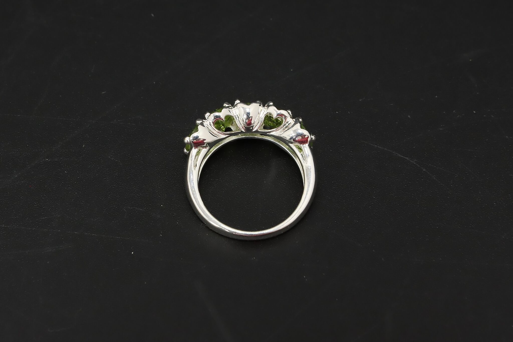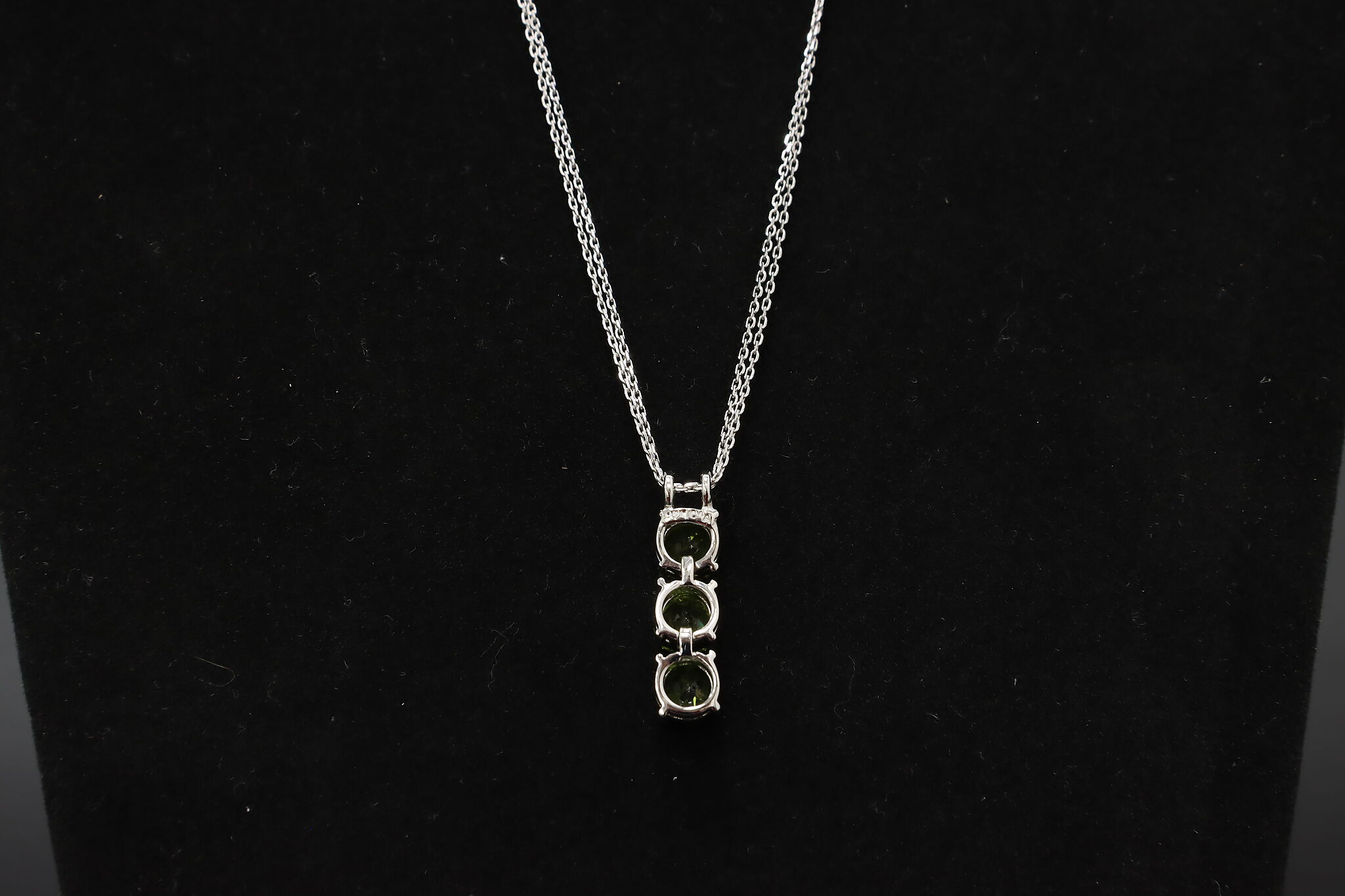 Elegant sterling silver jewelry set featuring vibrant faceted green peridot gemstones in a vertical drop pendant and matching multi-stone band ring. The bright olive-green sparkle of peridot makes this a beautiful everyday or dress jewelry set.