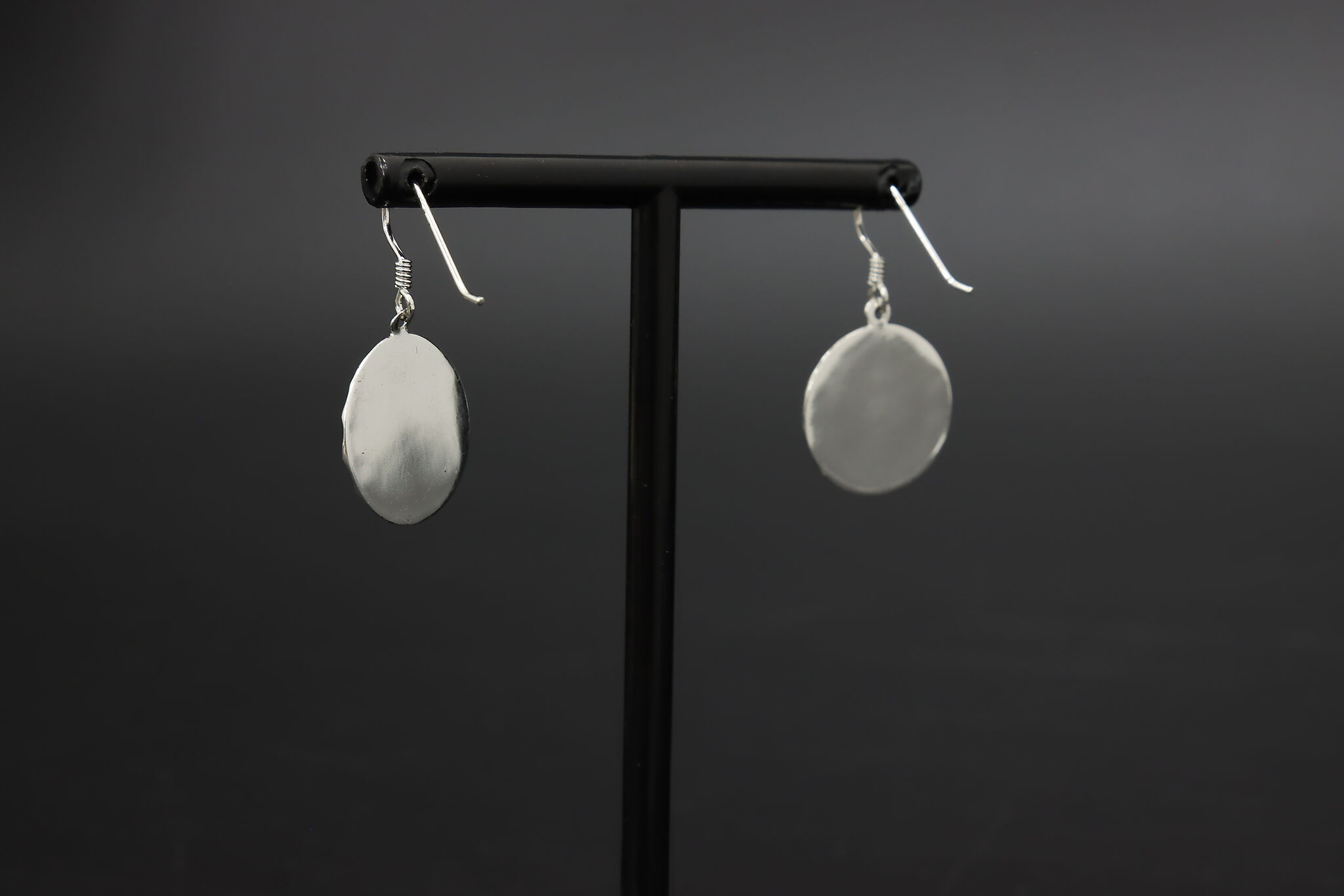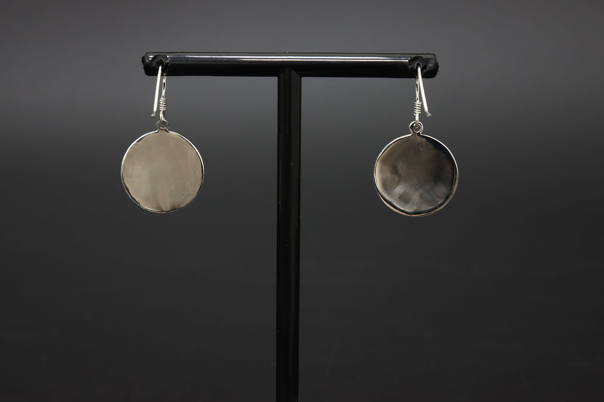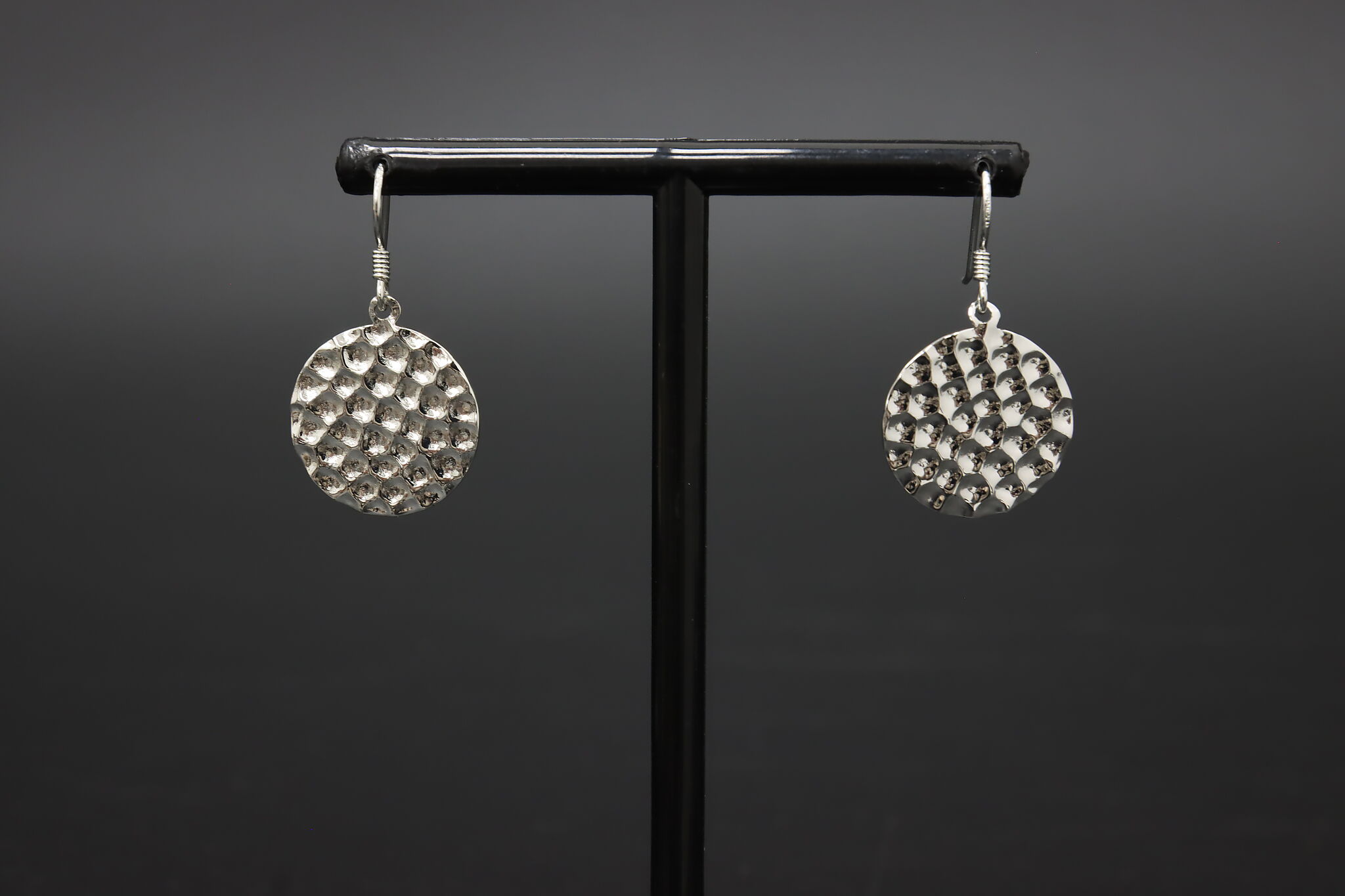 Classic sterling silver dangle earrings featuring hammered textured round disc pendants for a bright, reflective artisan look.