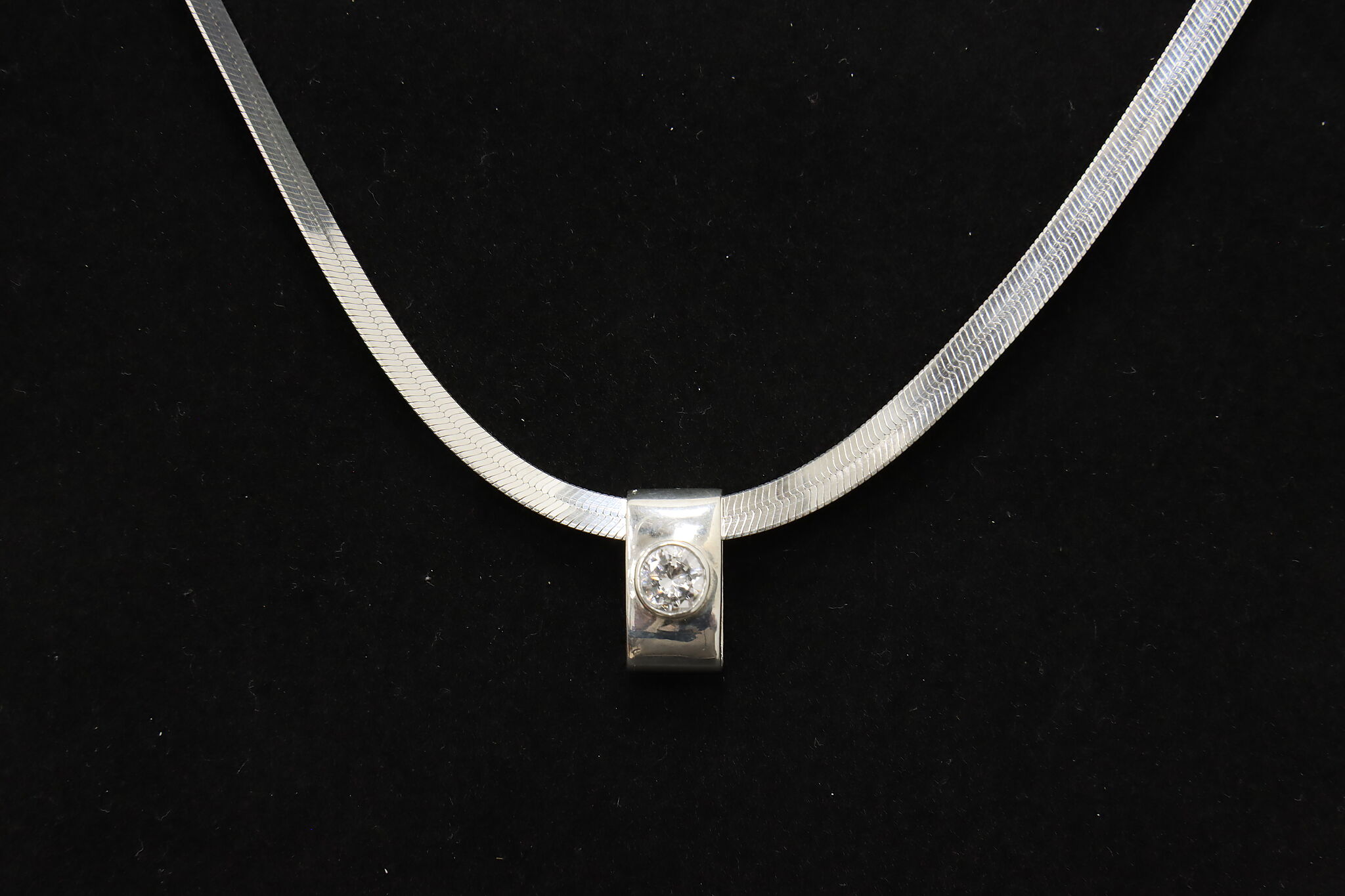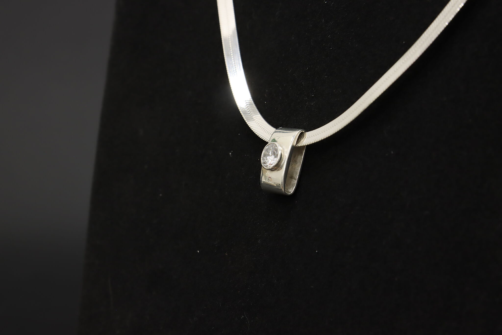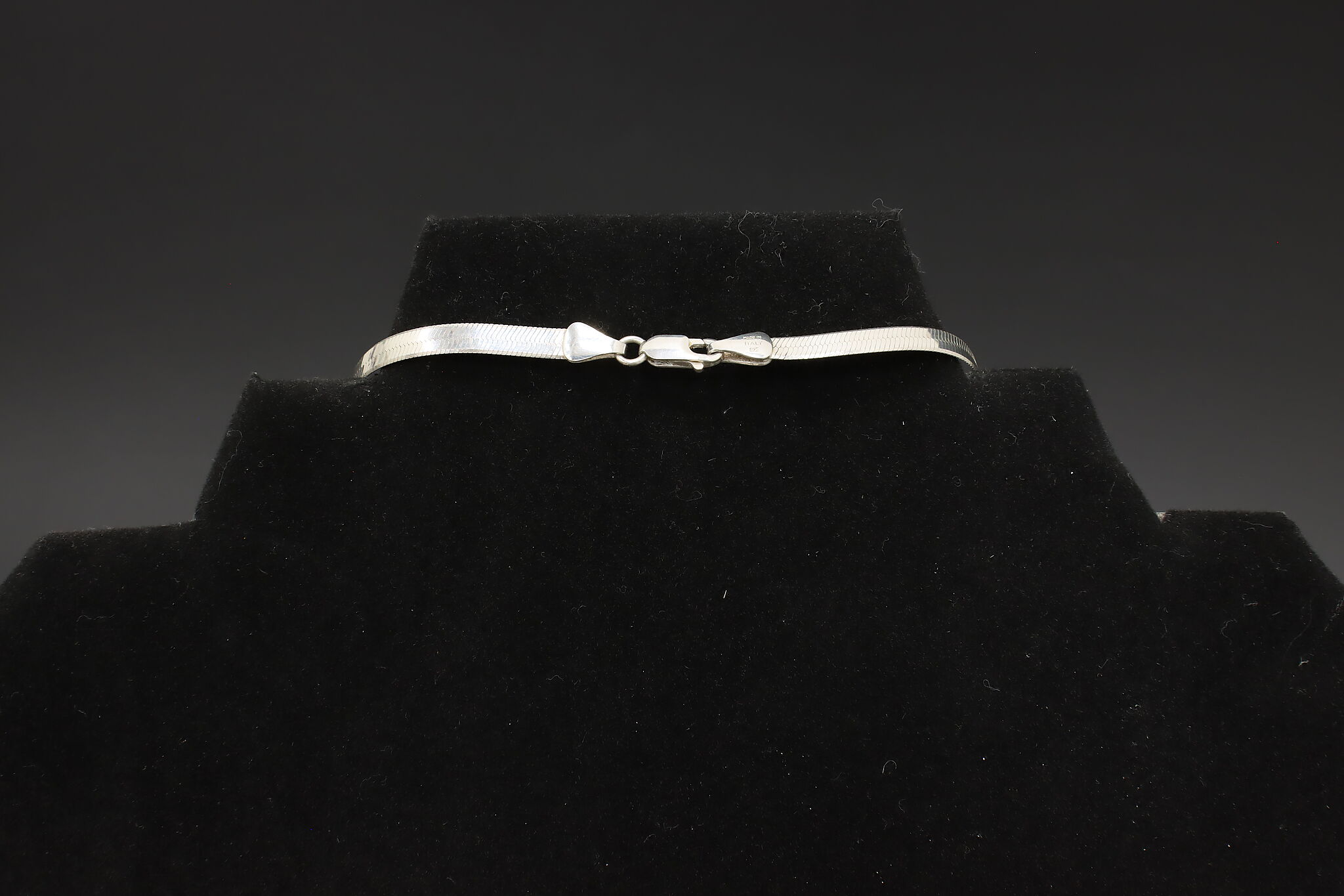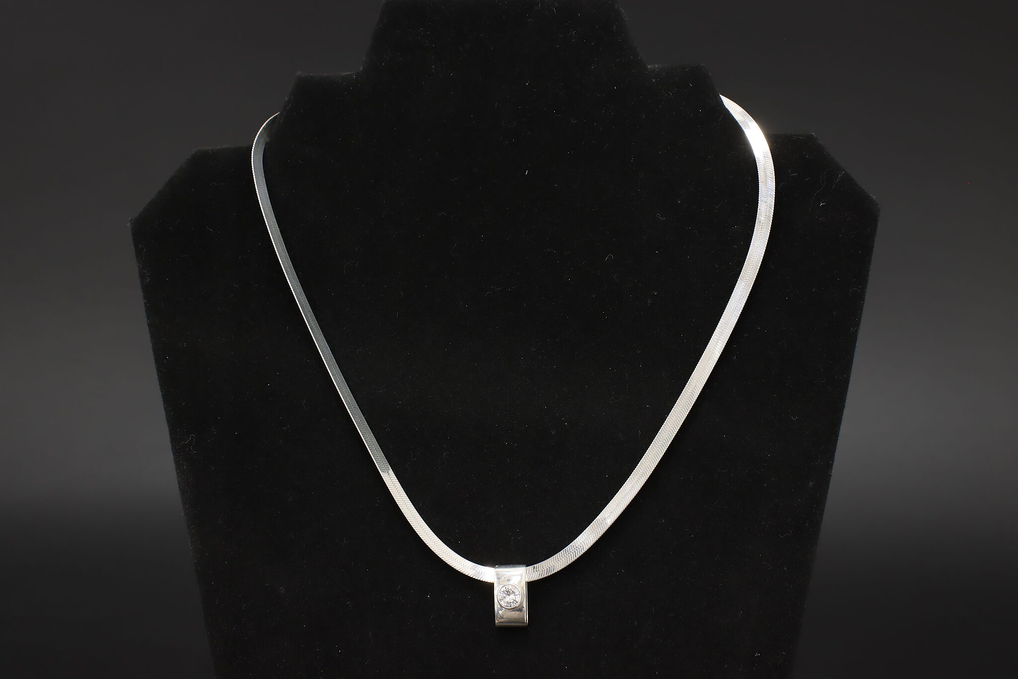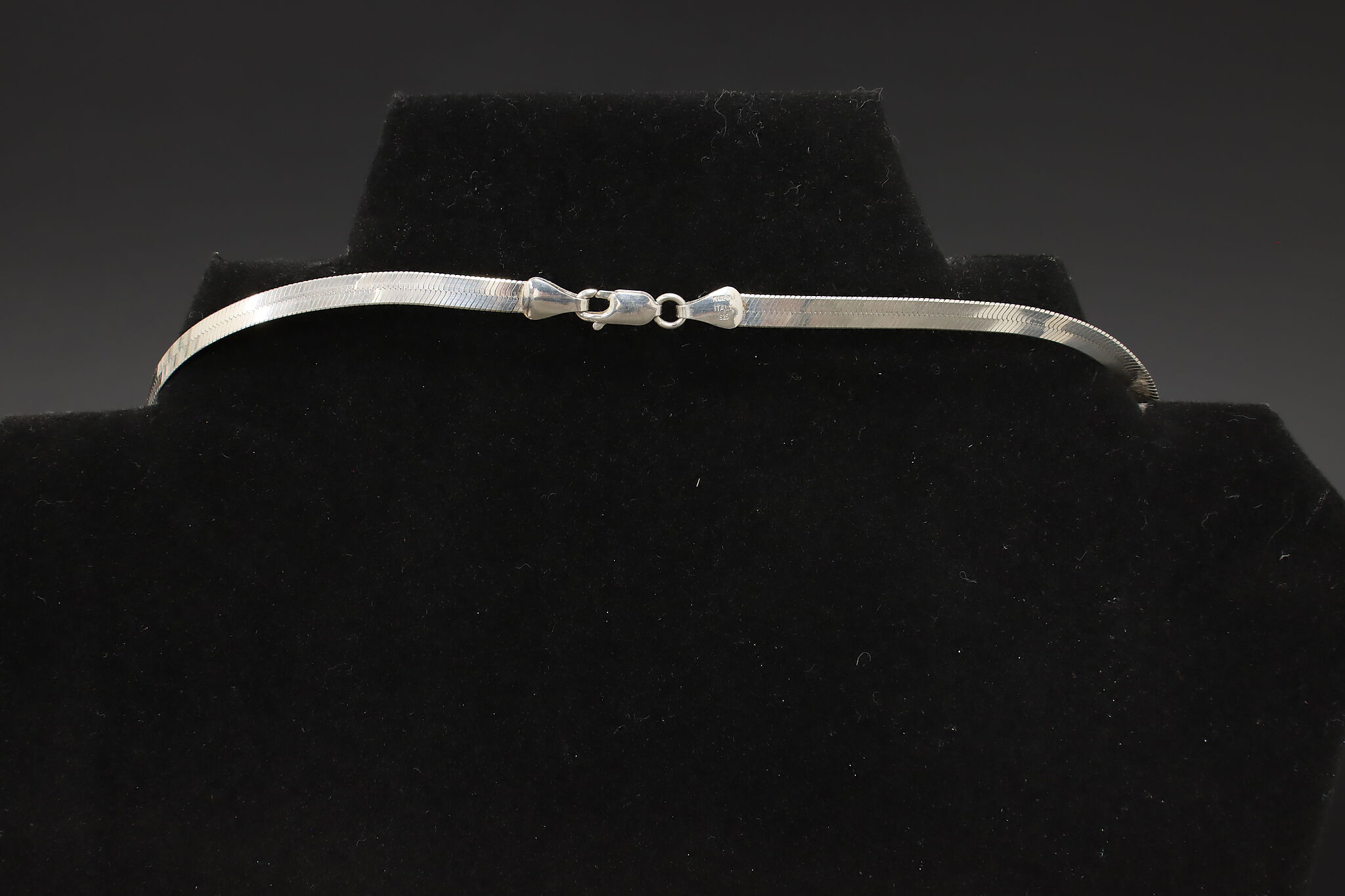 Classic sterling silver herringbone chain necklace featuring a smooth reflective finish and small accent pendant.