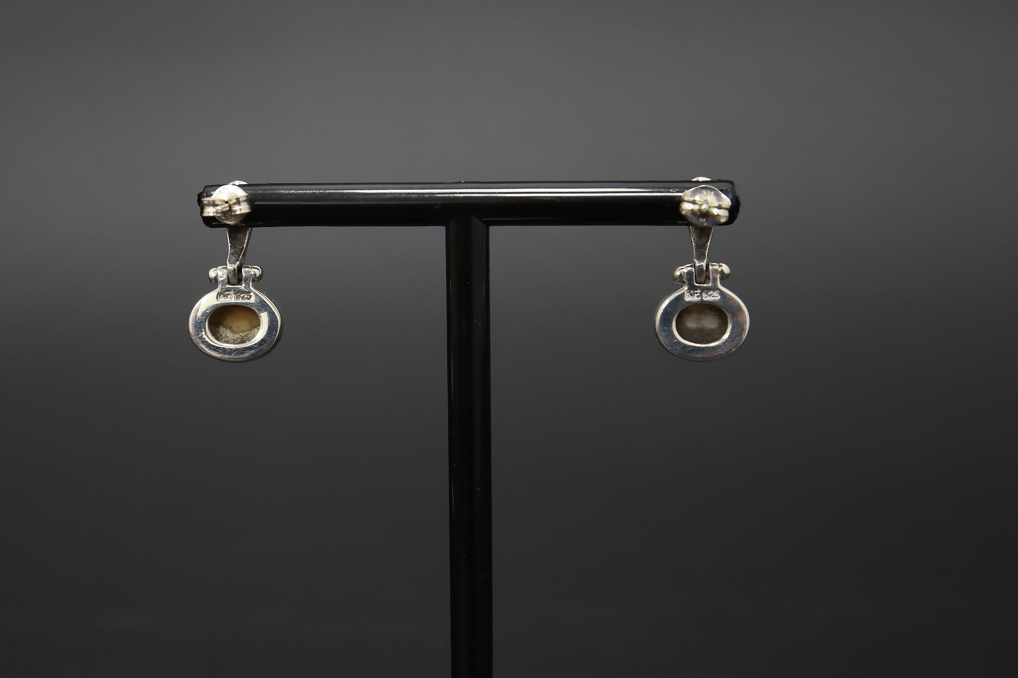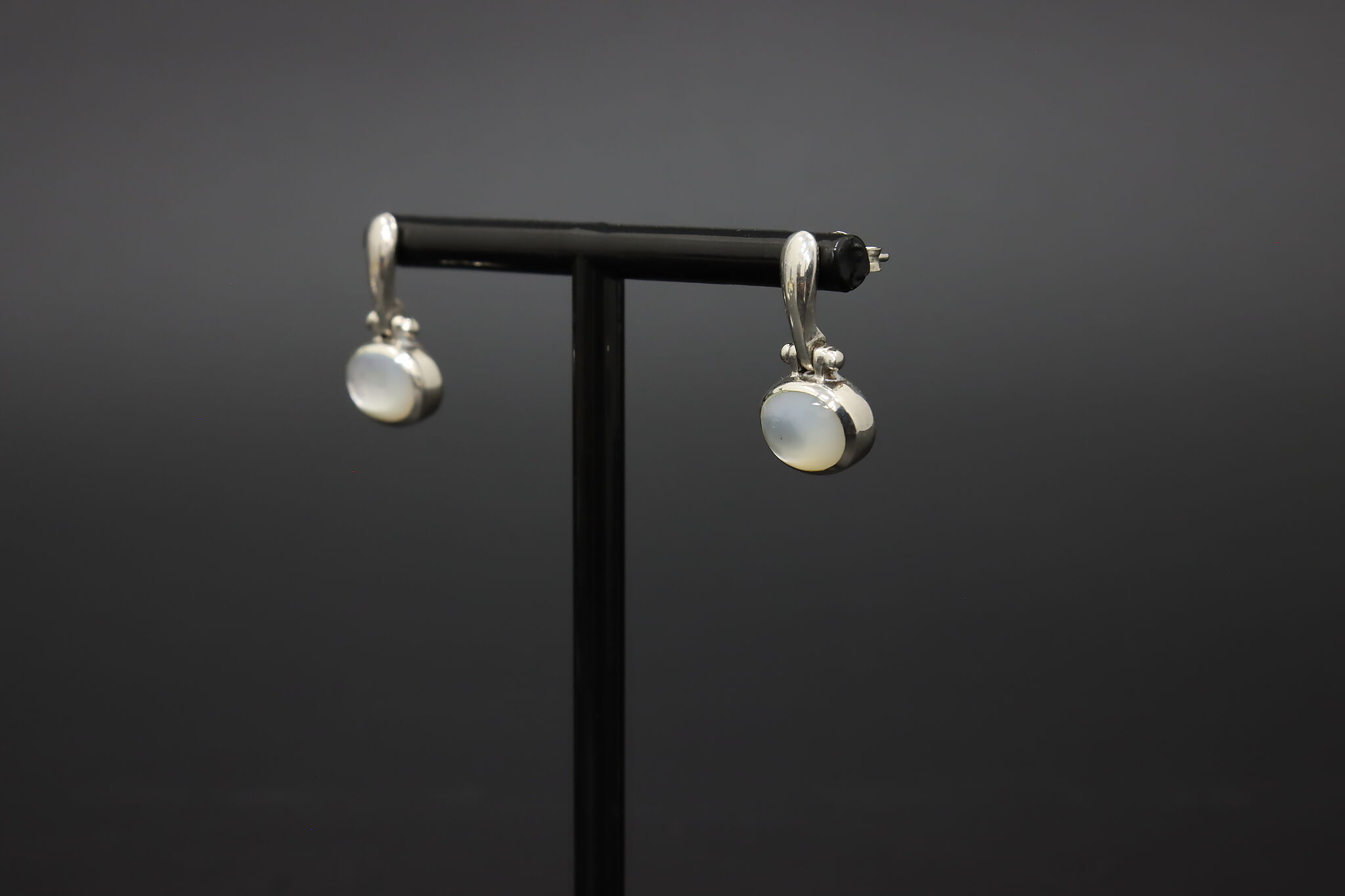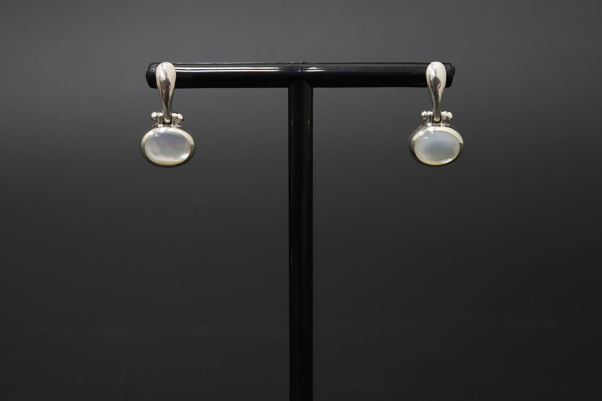Classic sterling silver drop earrings set with luminous oval cabochon stones showing soft iridescent, opalescent tones for an elegant and versatile look.