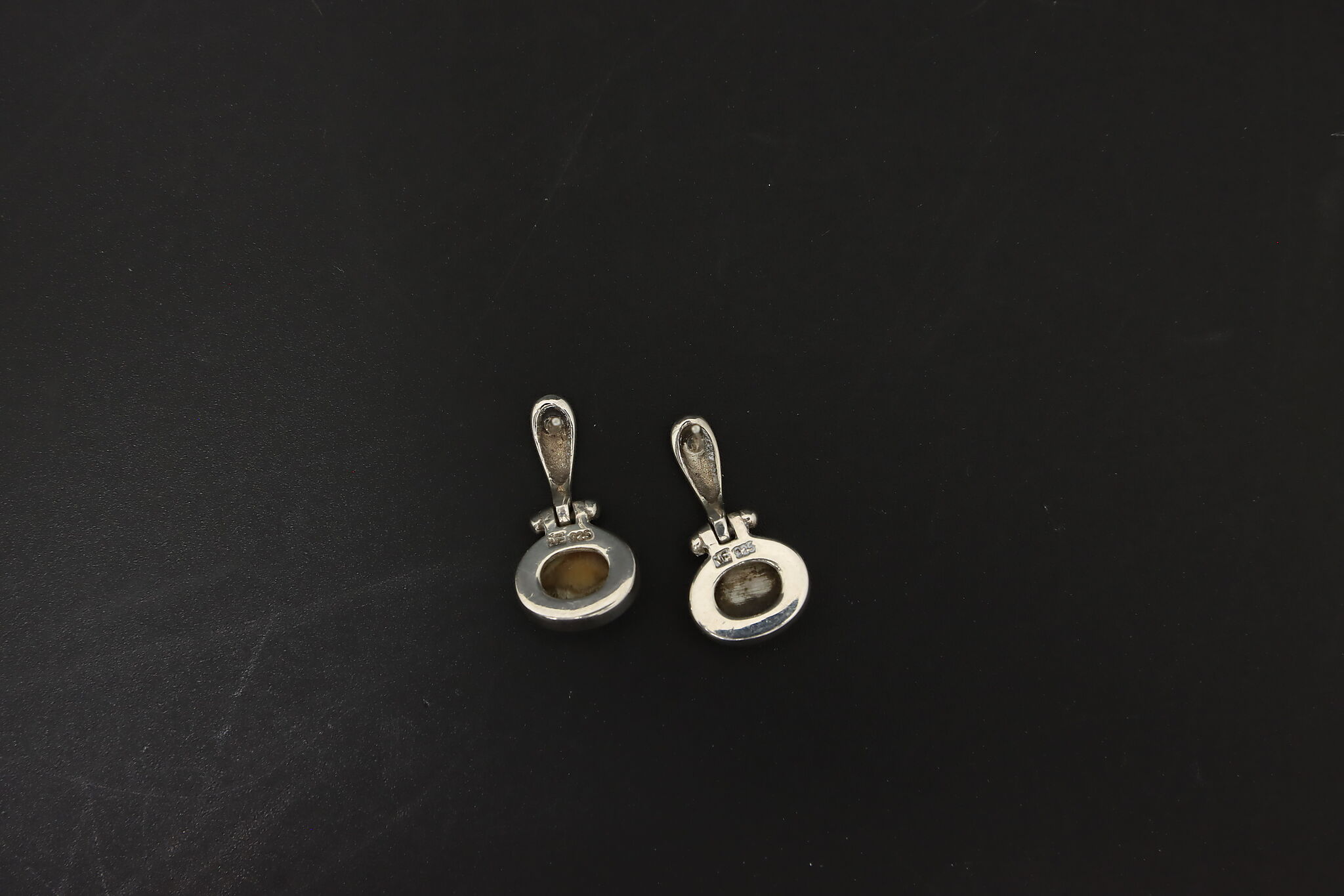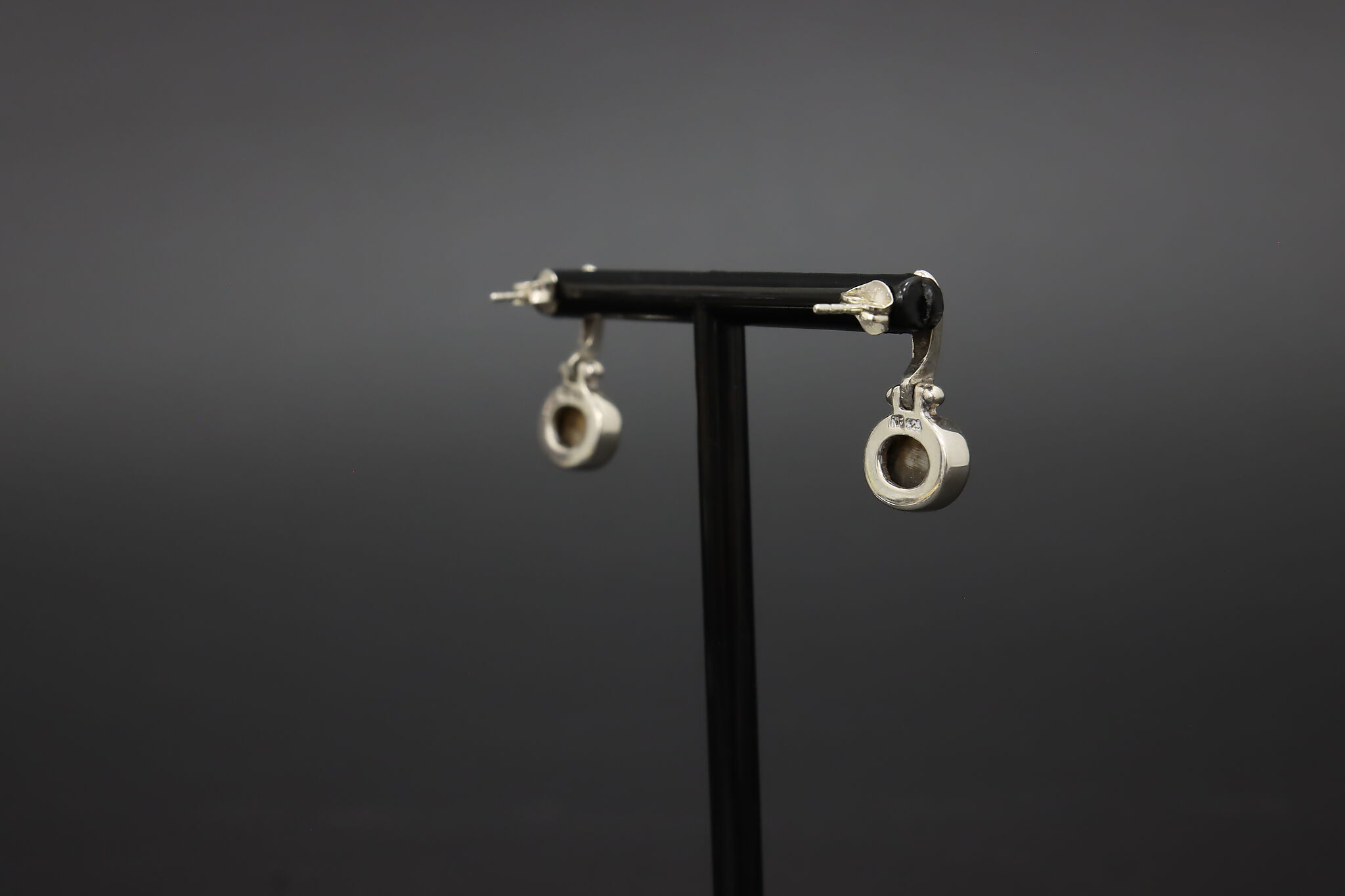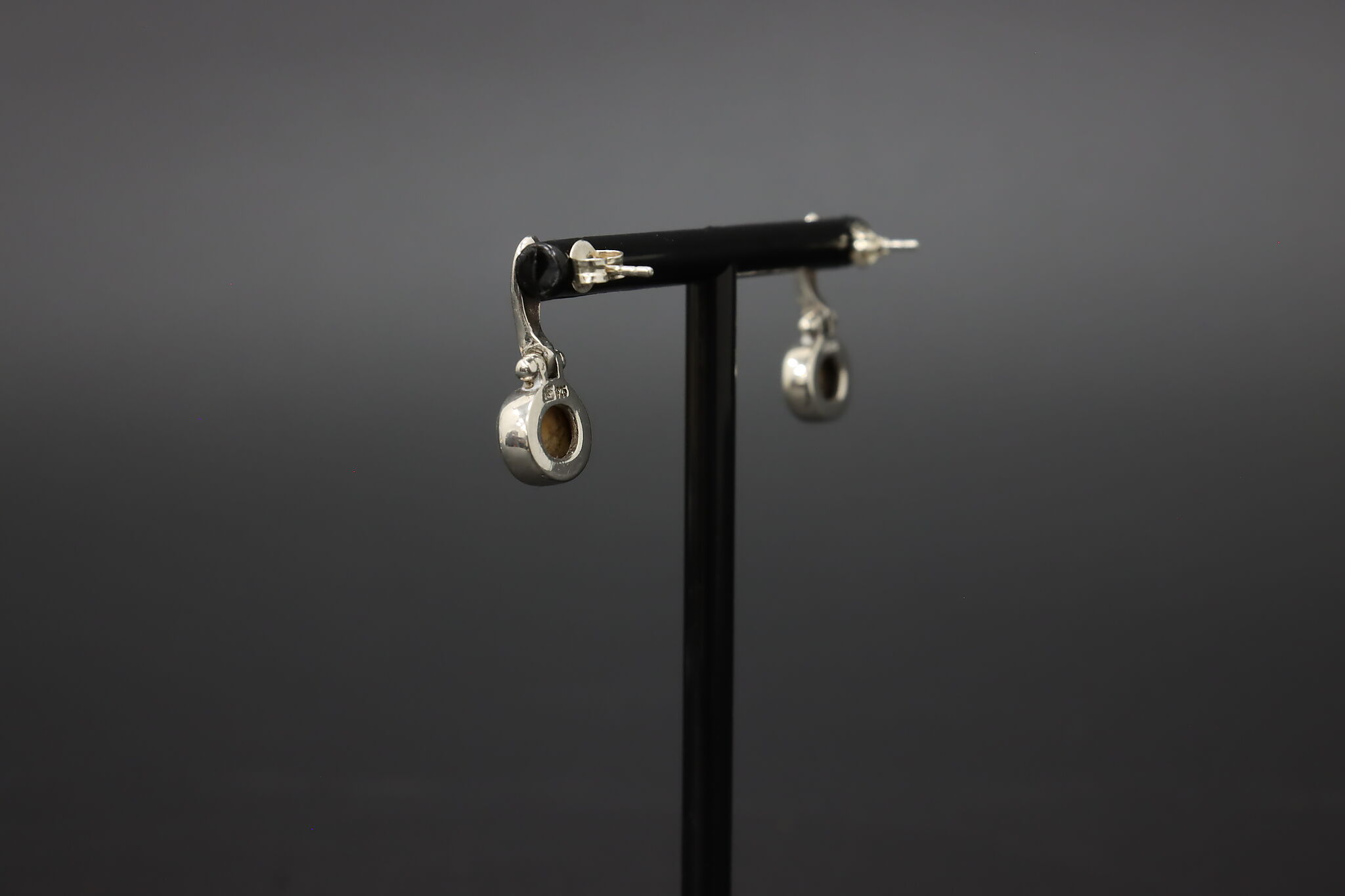 Classic sterling silver drop earrings set with luminous oval cabochon stones showing soft iridescent, opalescent tones for an elegant and versatile look.