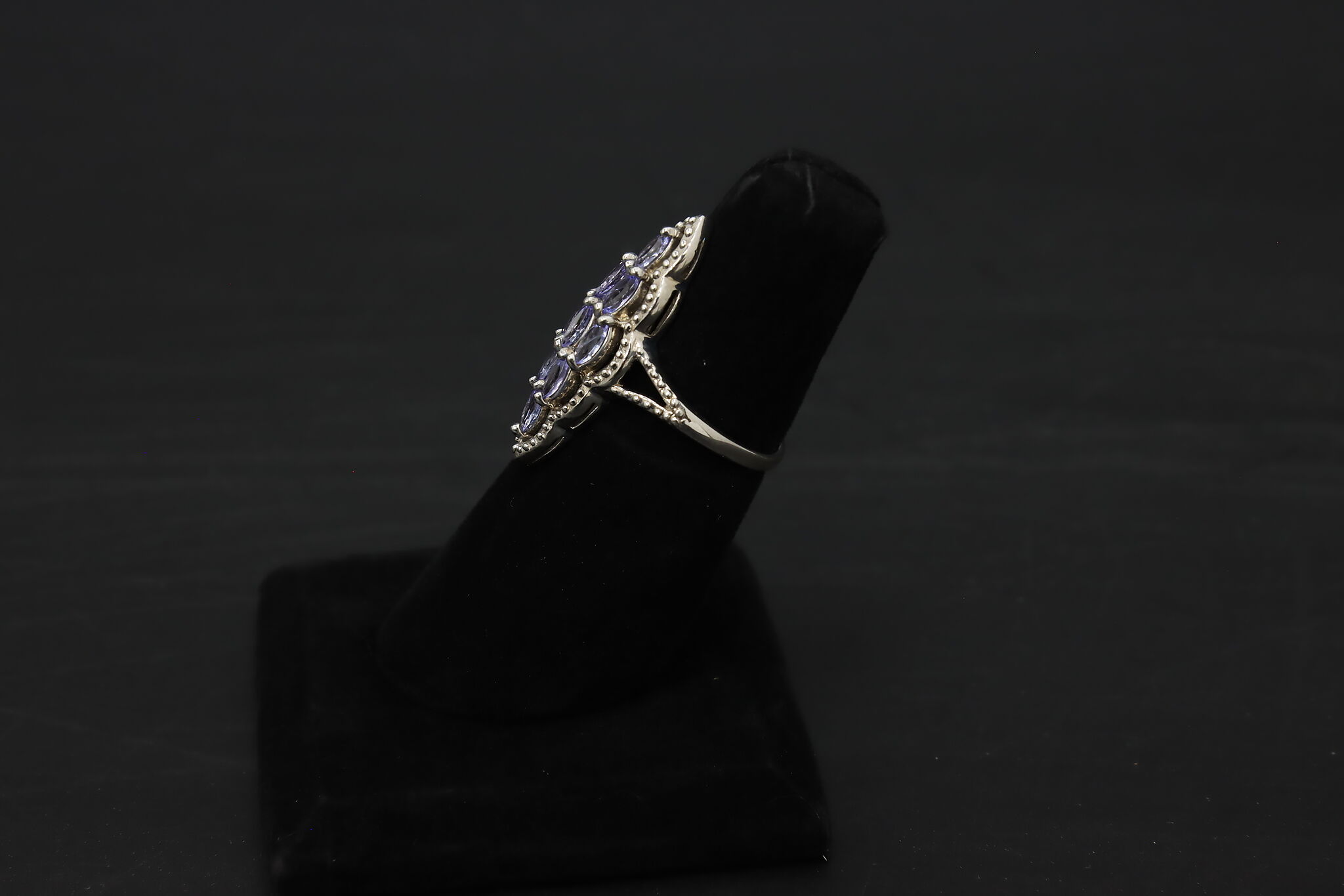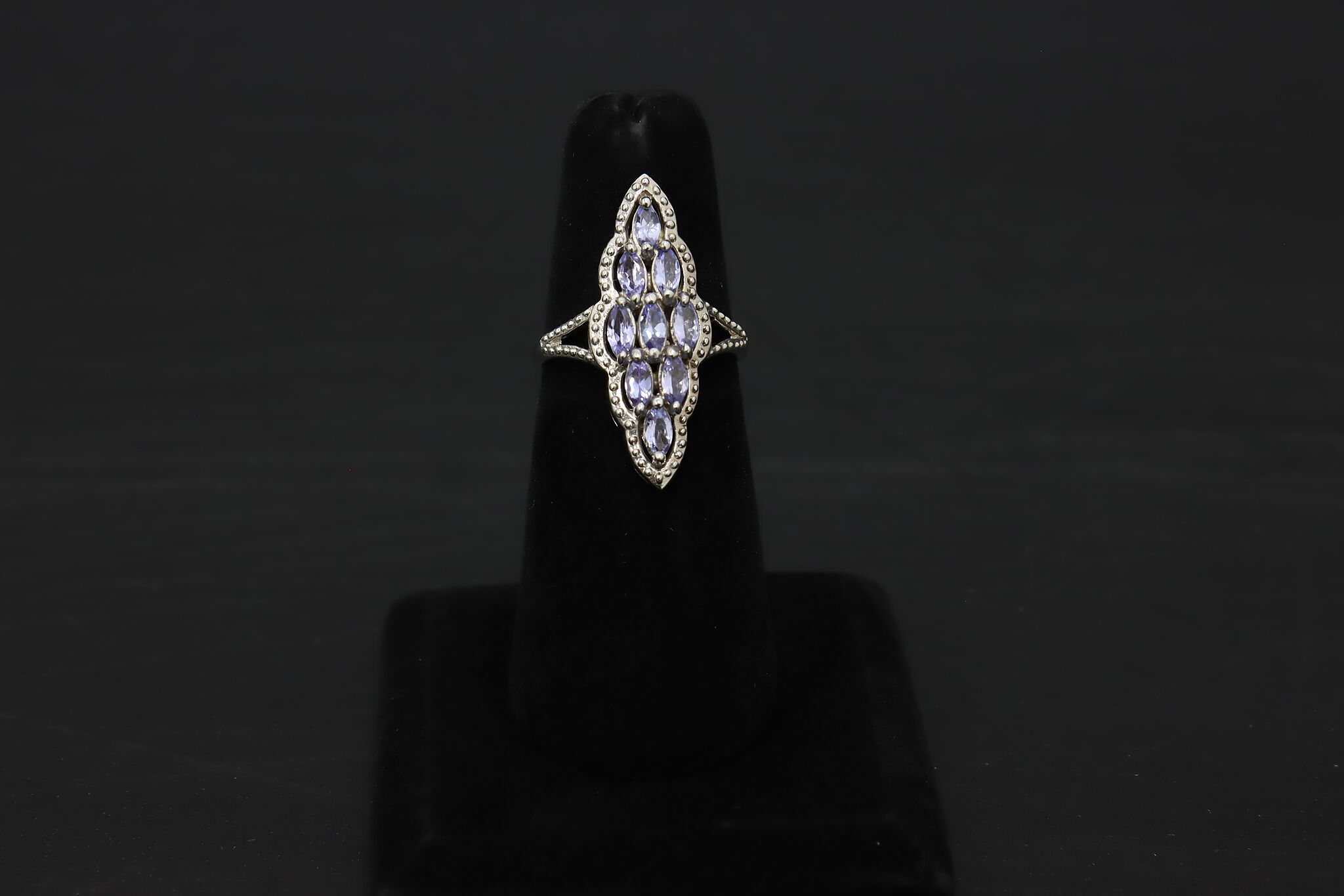 The pale lavender-colored cubic zirconia gemstones on this ring are the perfect addition to a springtime outfit.