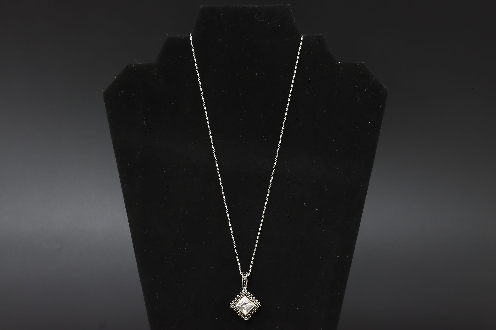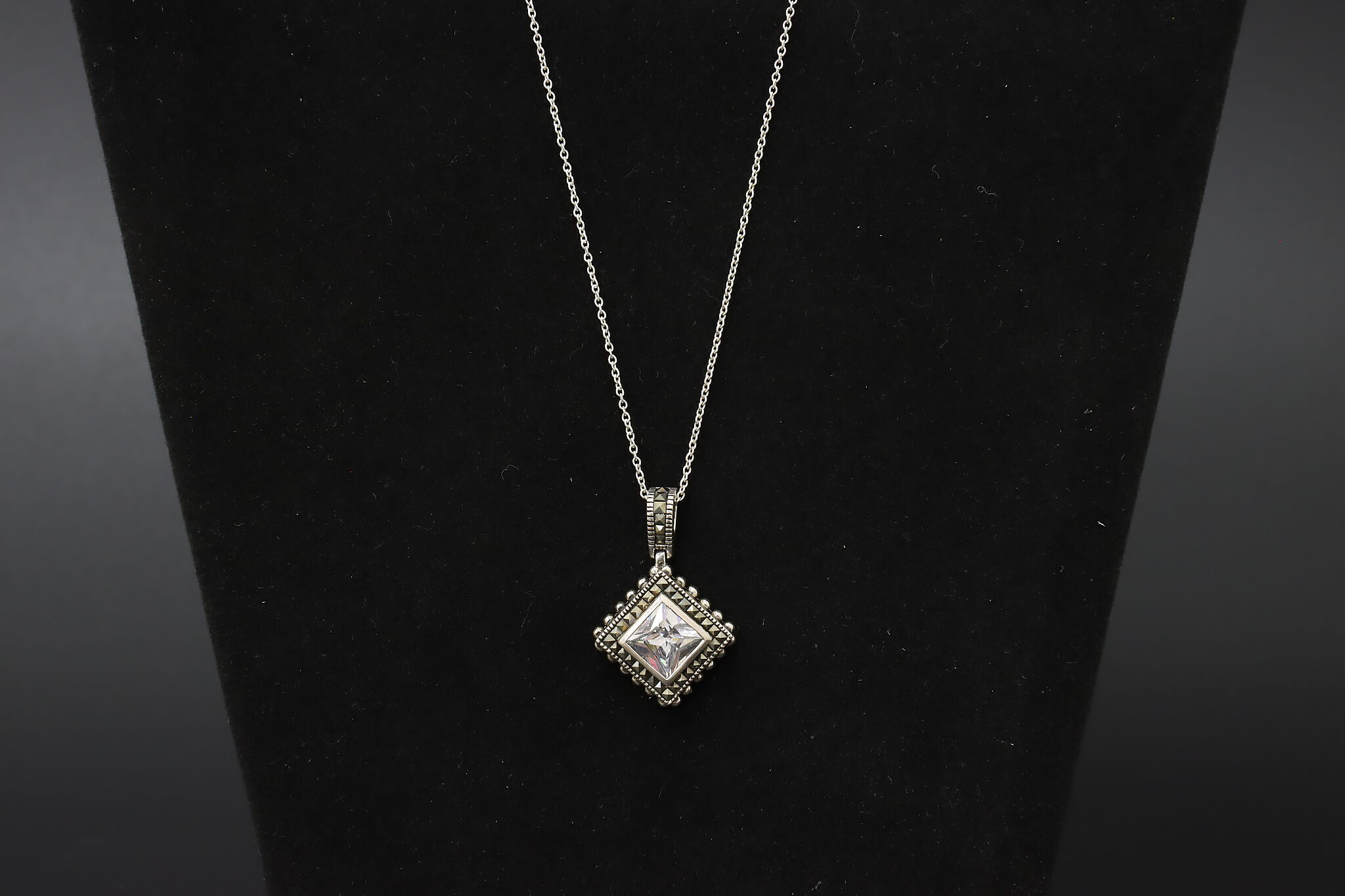 The beautiful olive green marcasite gemstones perfectly compliment the white cubic zirconia gem on this pendant.