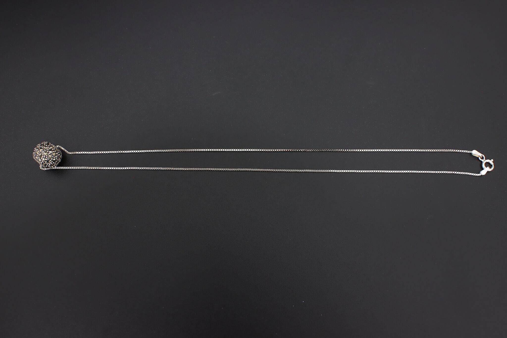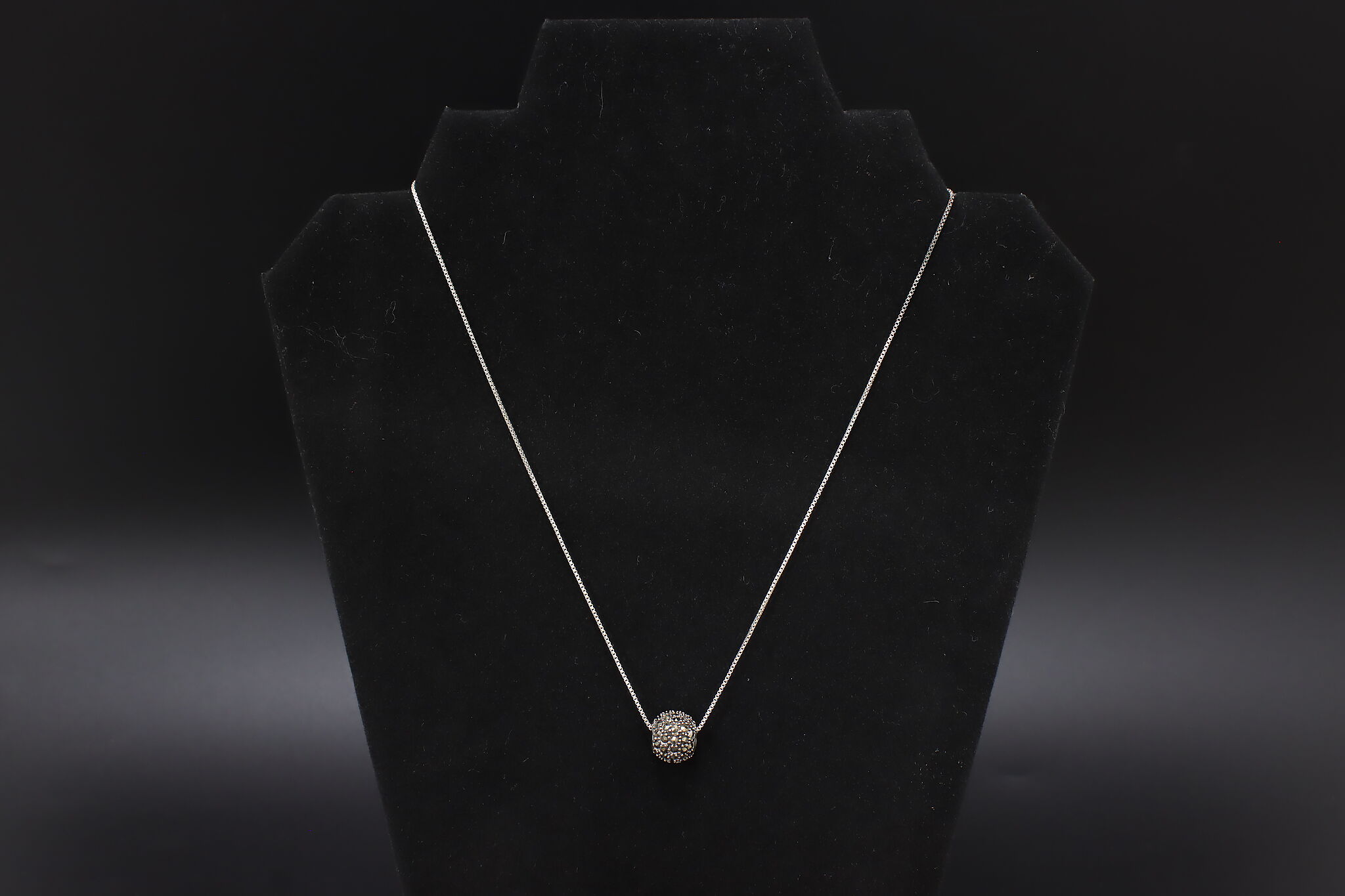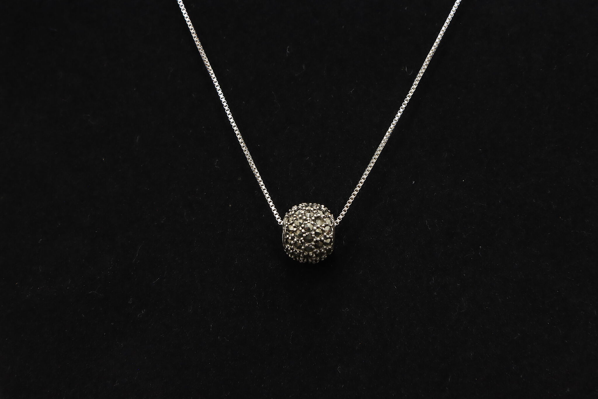 This beautiful marcasite gemstone pave ball pendant has just the right amount of sparkle for every day wear.