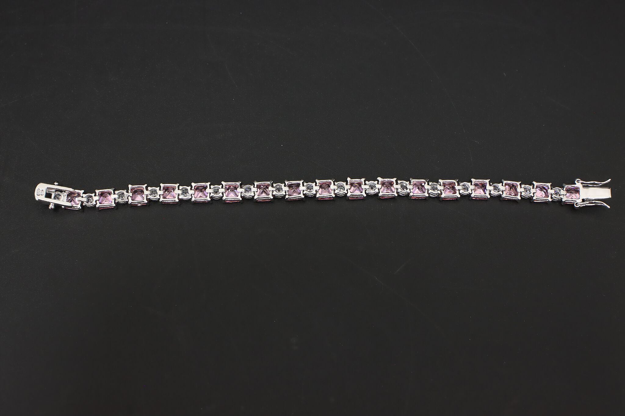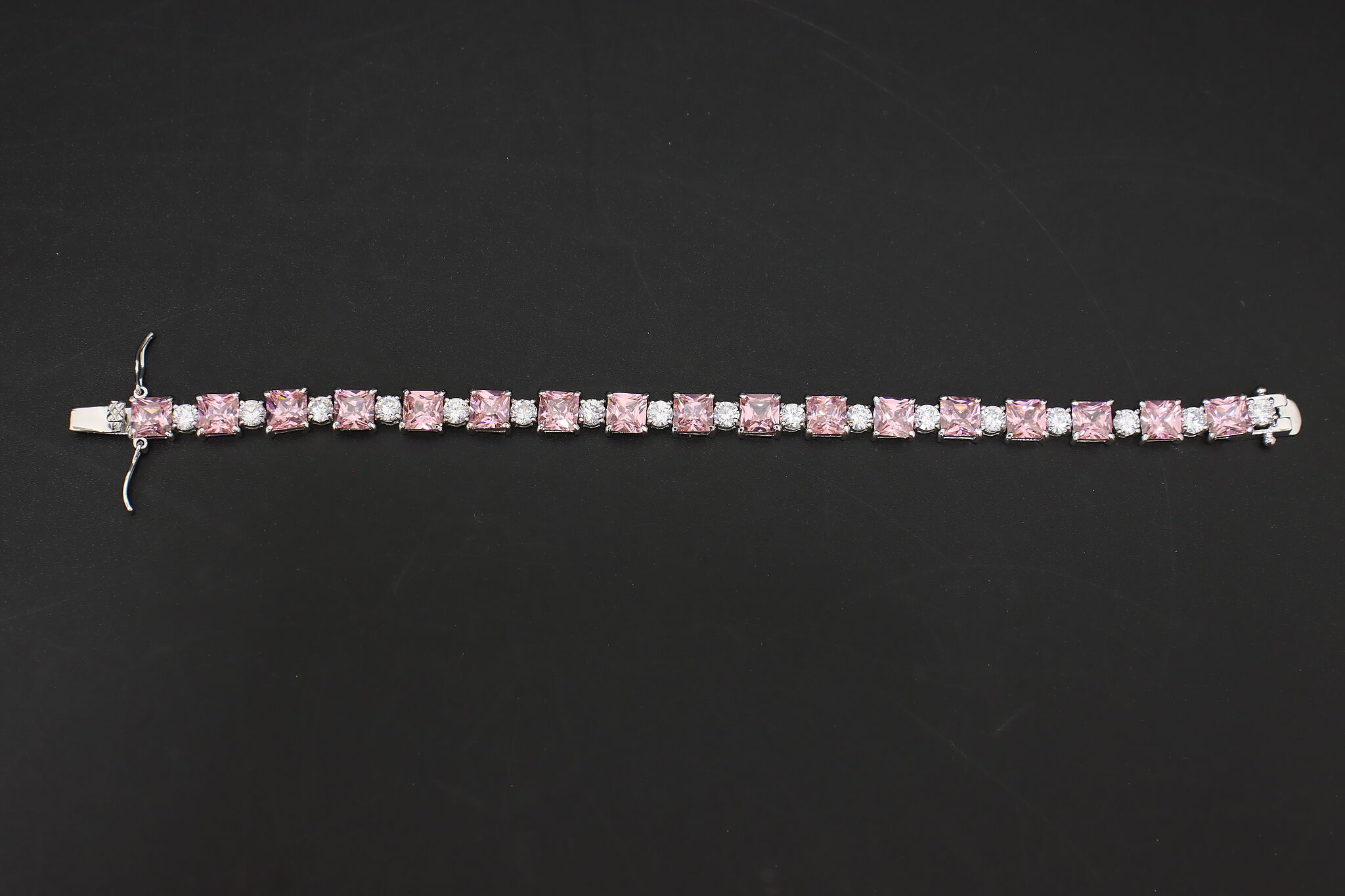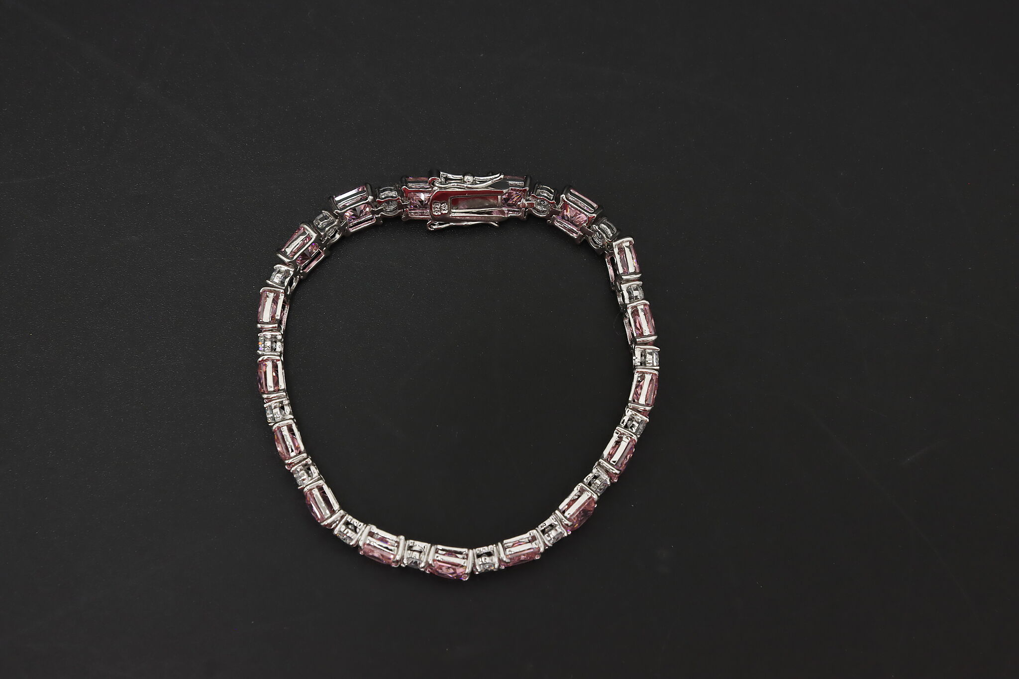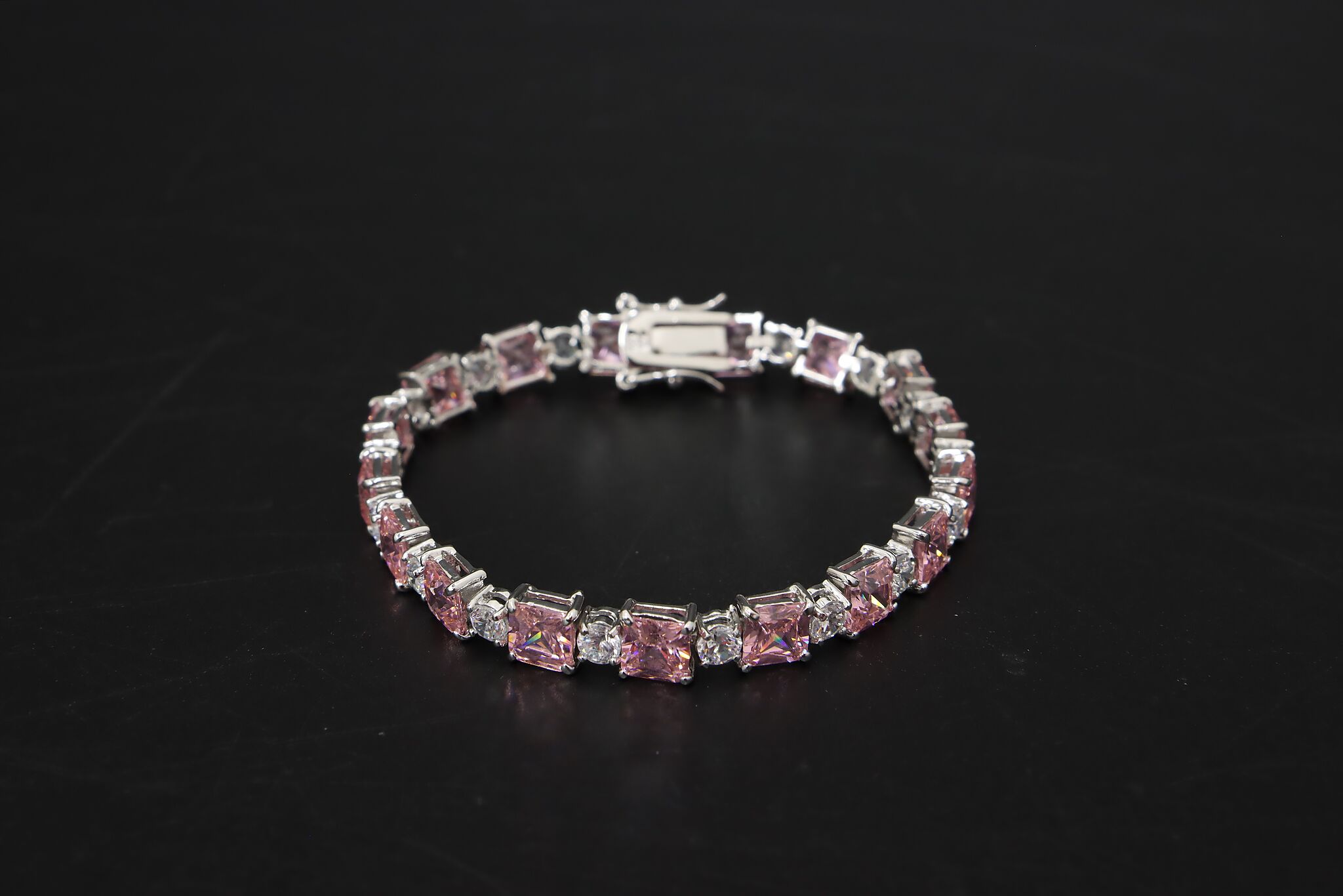 Elegant sterling silver tennis bracelet featuring a continuous row of sparkling pink cubic zirconia stones accented with clear CZ highlights. A versatile piece that layers well with other bracelets or stands alone as a statement.