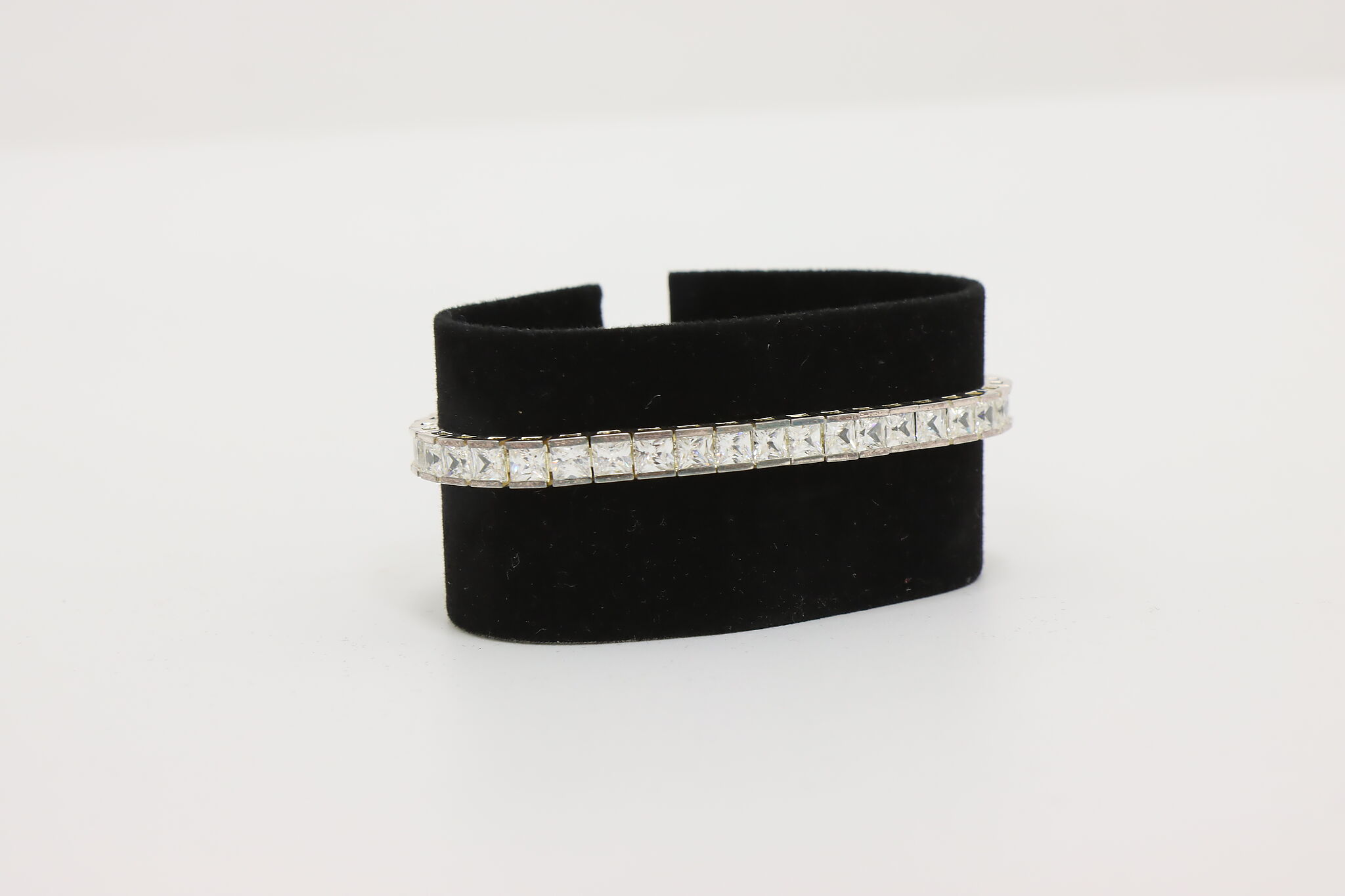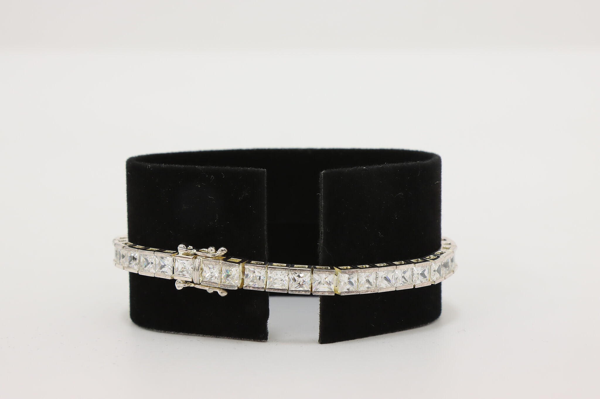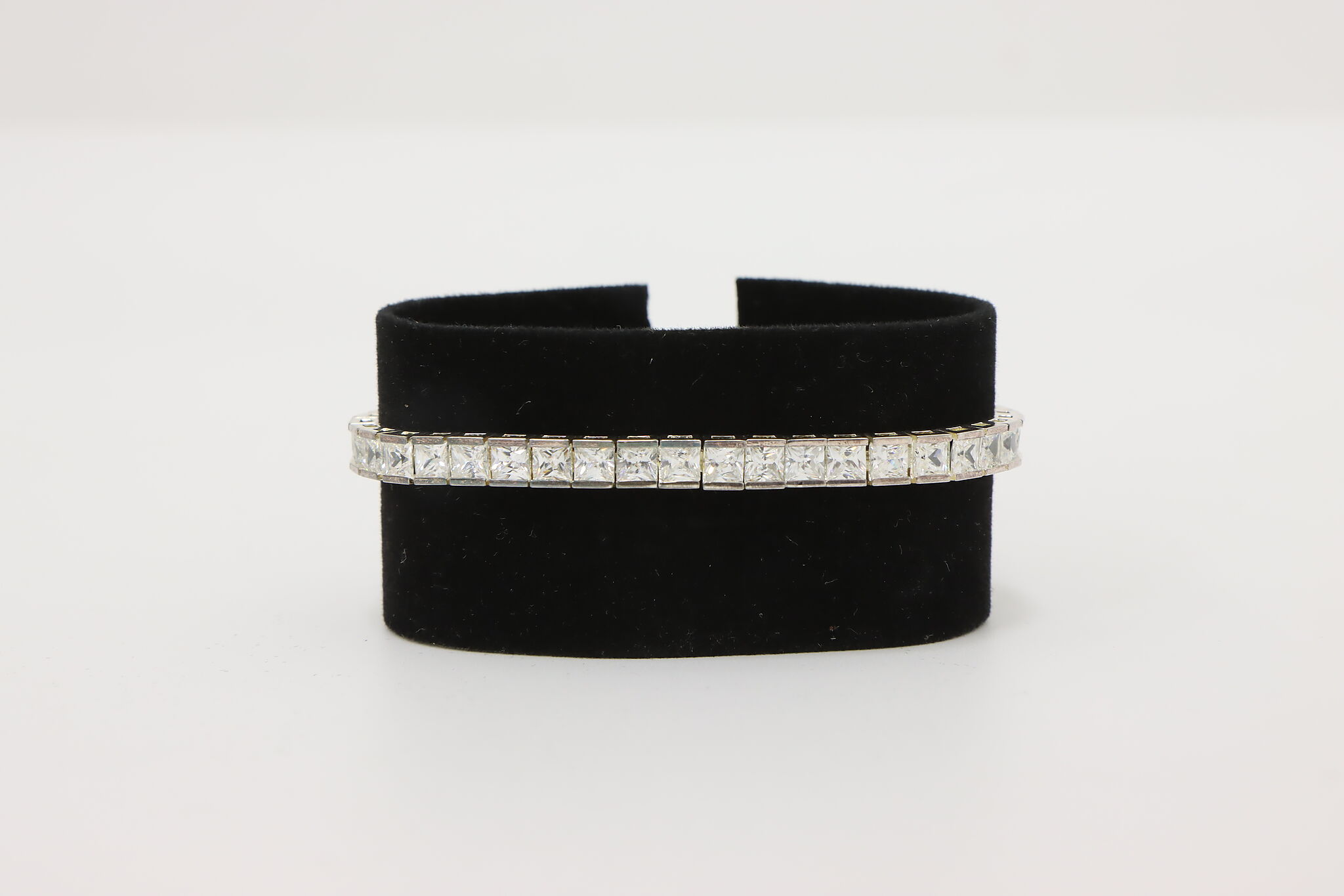 A sleek sterling silver tennis bracelet featuring a continuous line of sparkling princess-cut cubic zirconia stones for a clean, modern look.