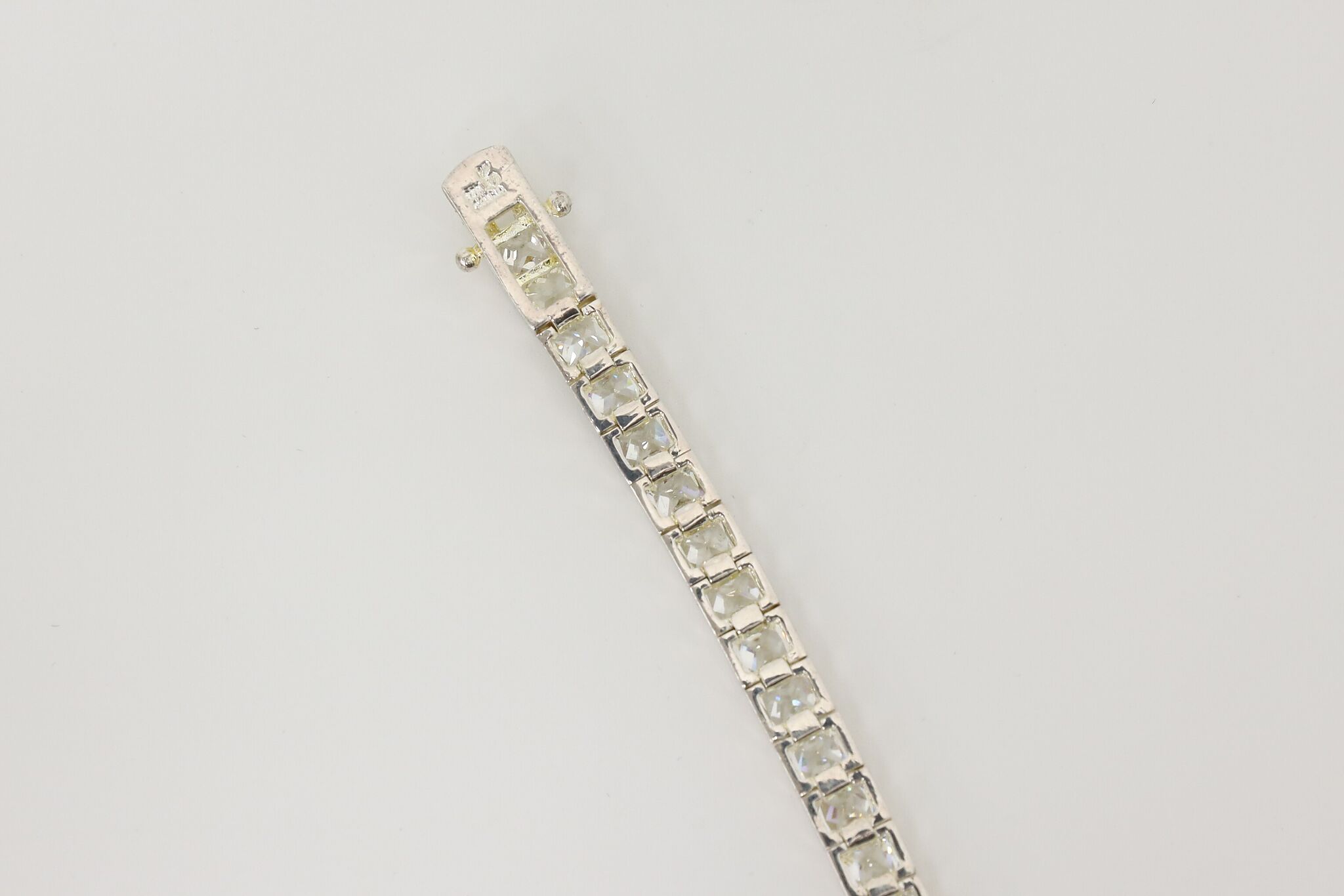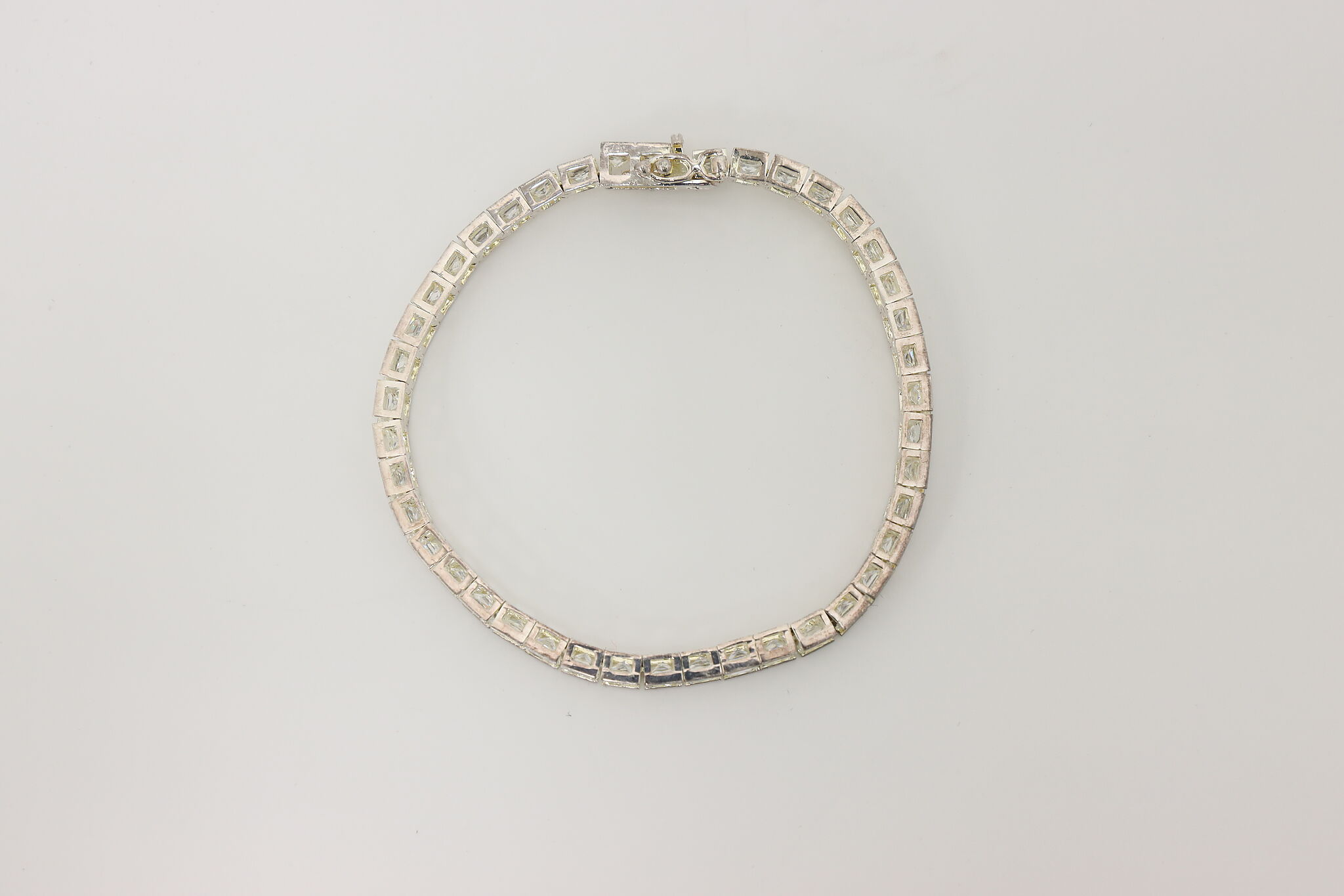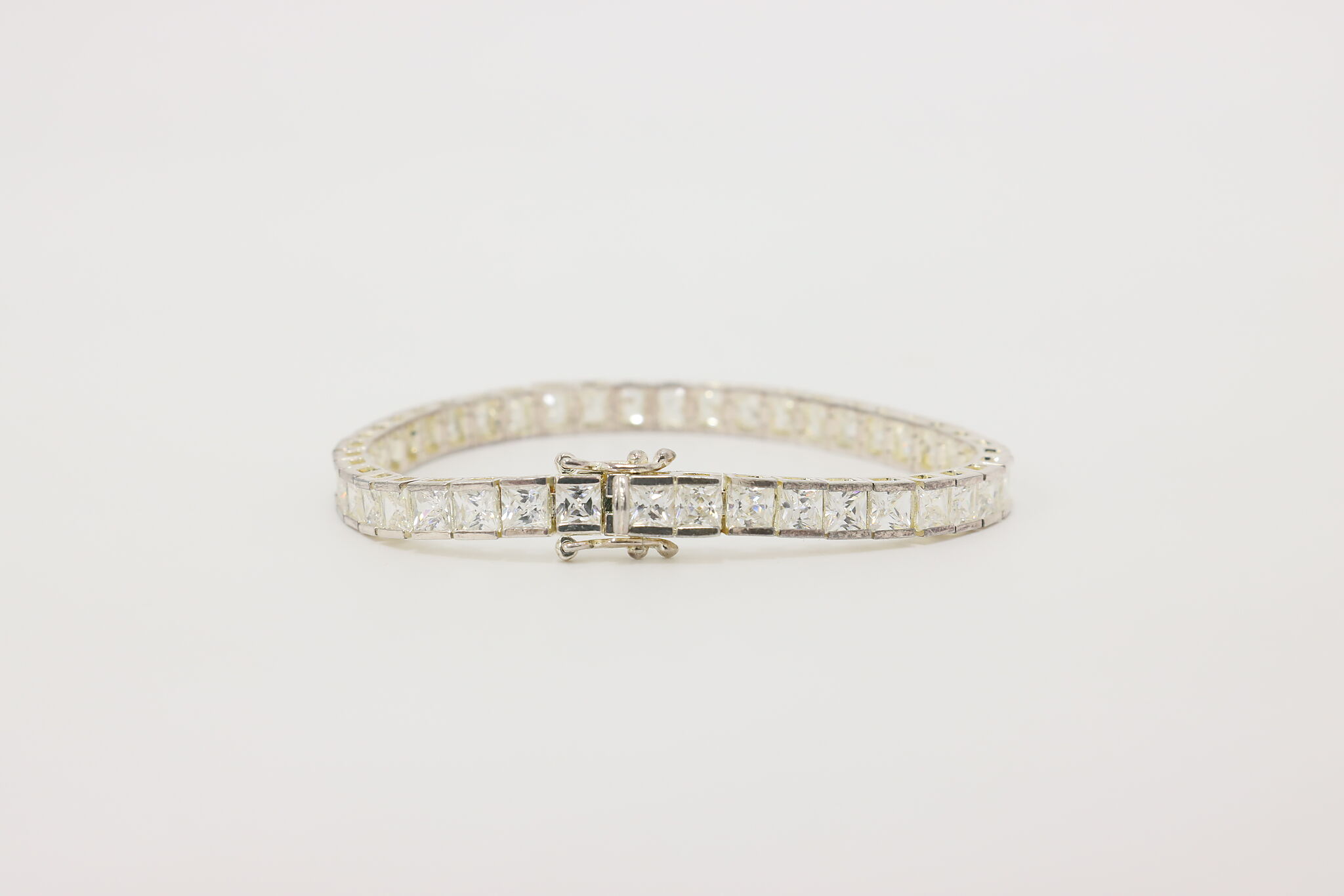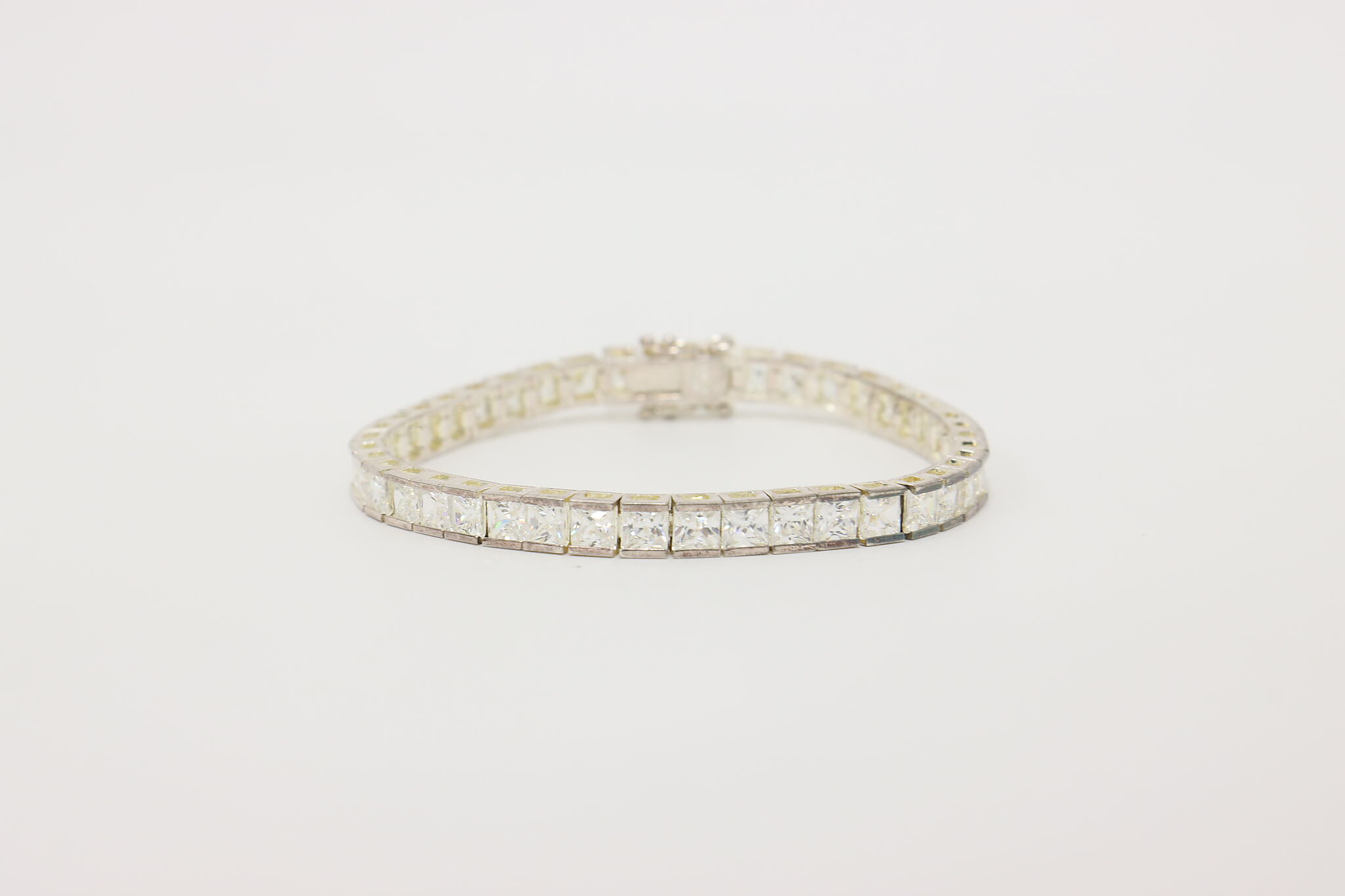 A sleek sterling silver tennis bracelet featuring a continuous line of sparkling princess-cut cubic zirconia stones for a clean, modern look.