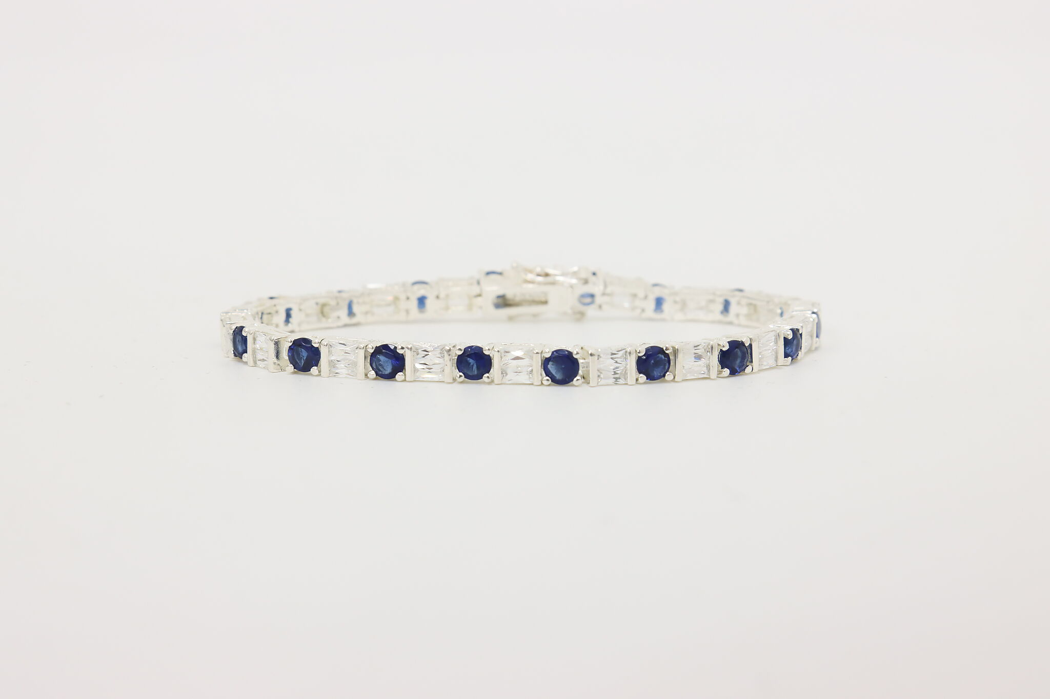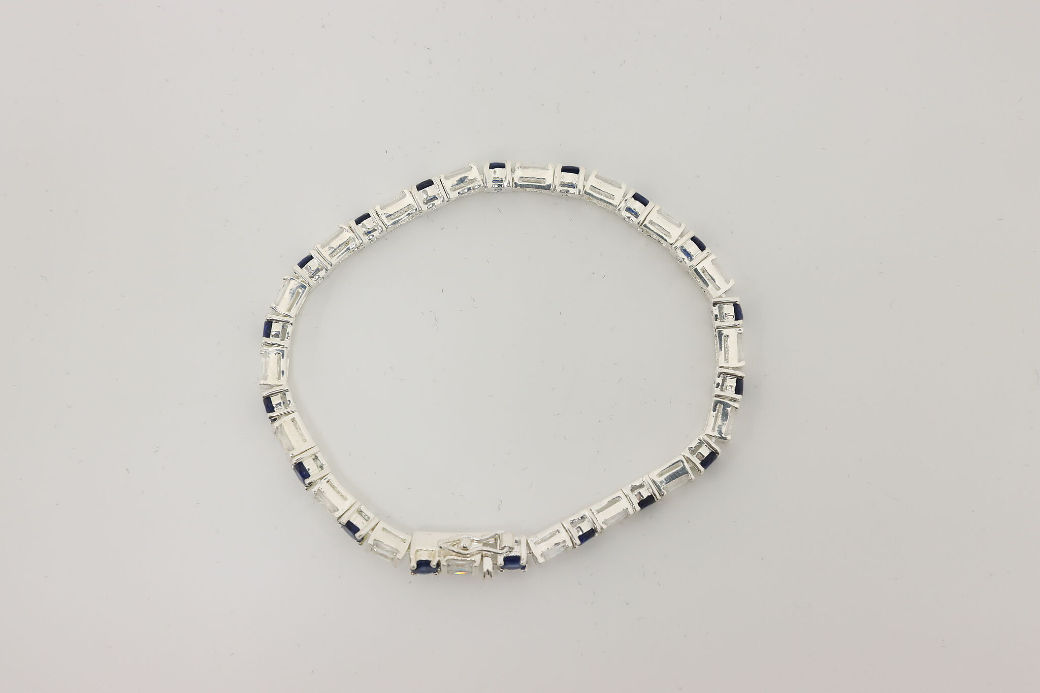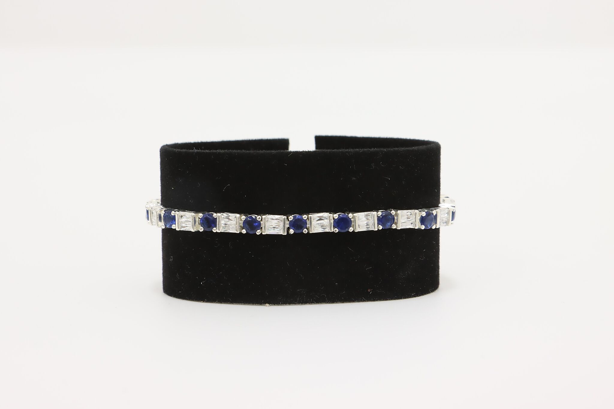 A striking sterling silver bracelet featuring alternating deep blue sapphire-colored stones and sparkling baguette-cut cubic zirconia.