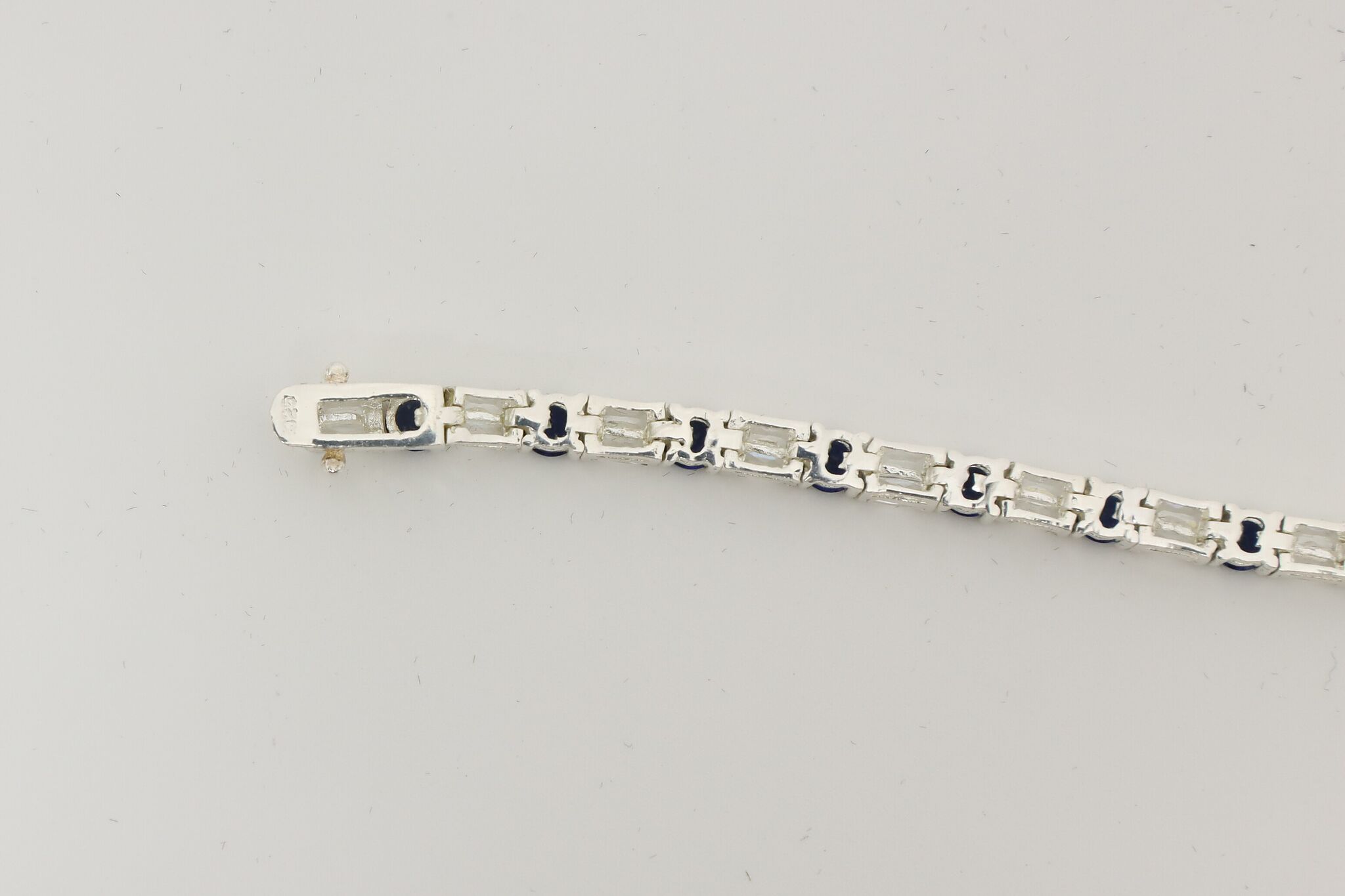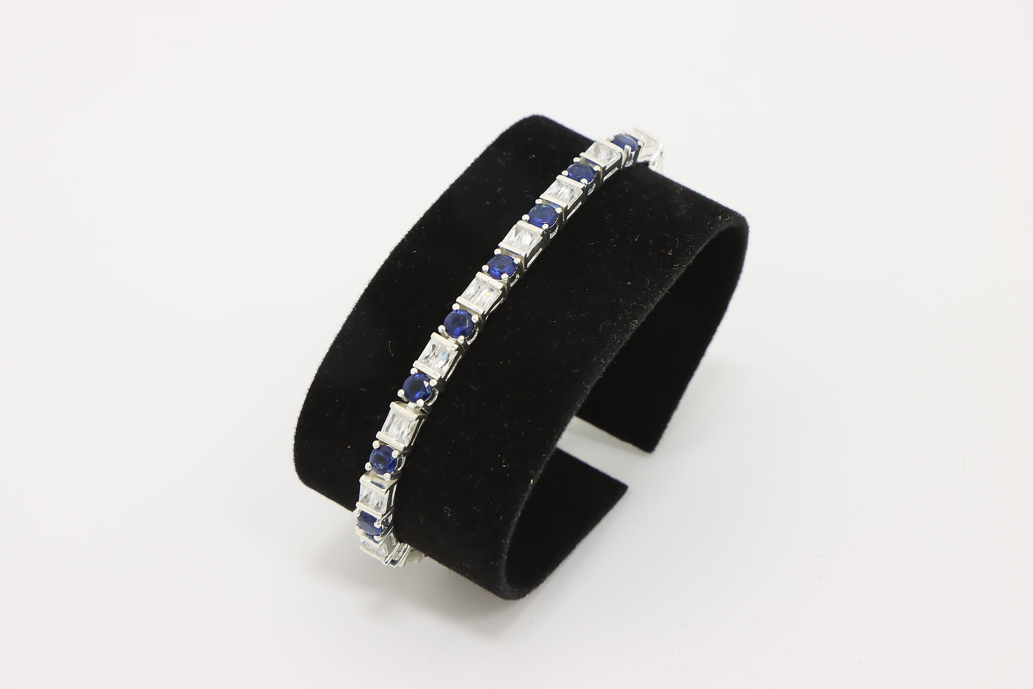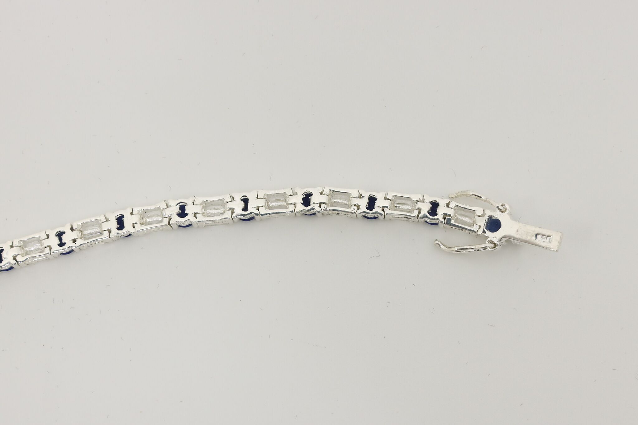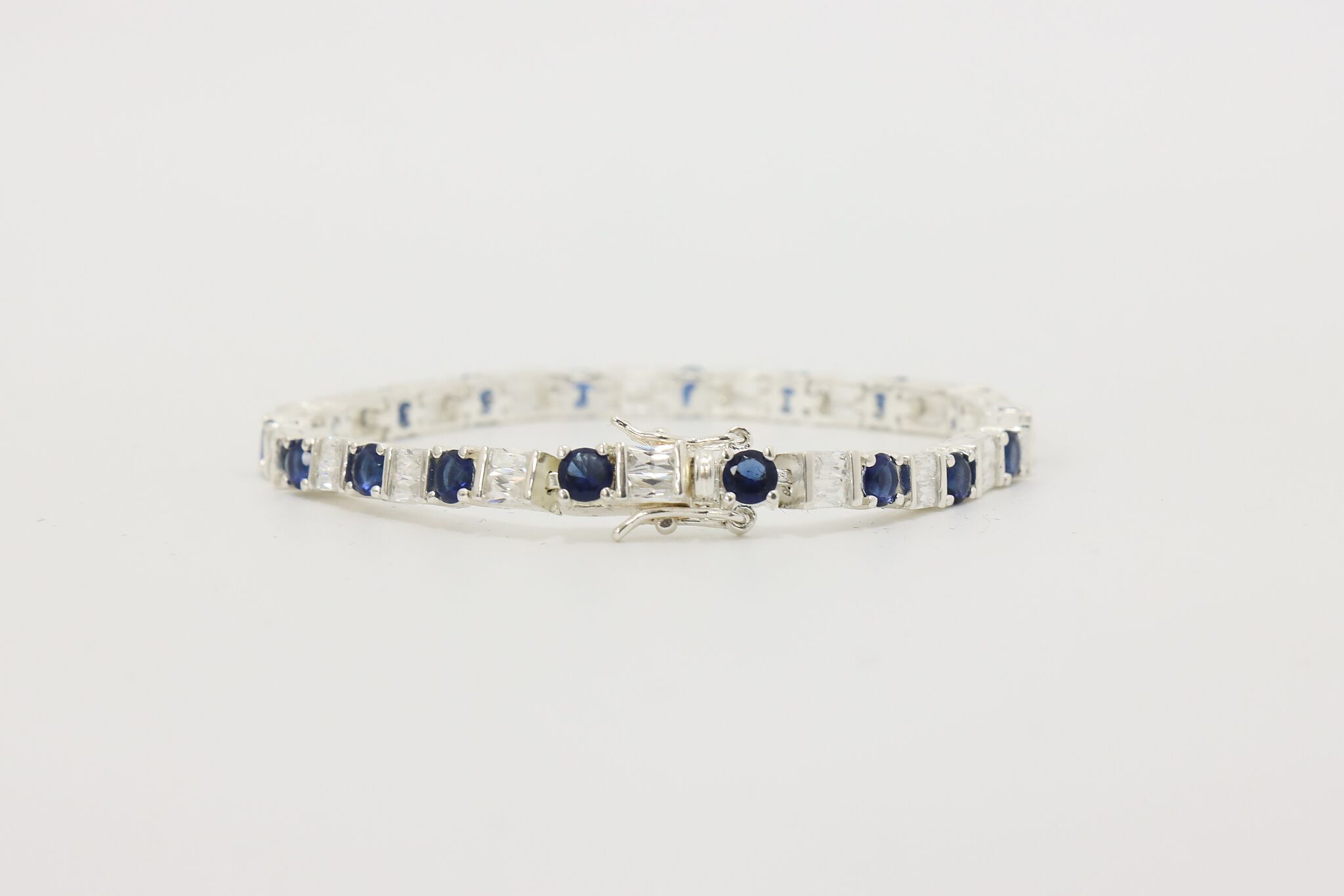 A striking sterling silver bracelet featuring alternating deep blue sapphire-colored stones and sparkling baguette-cut cubic zirconia.