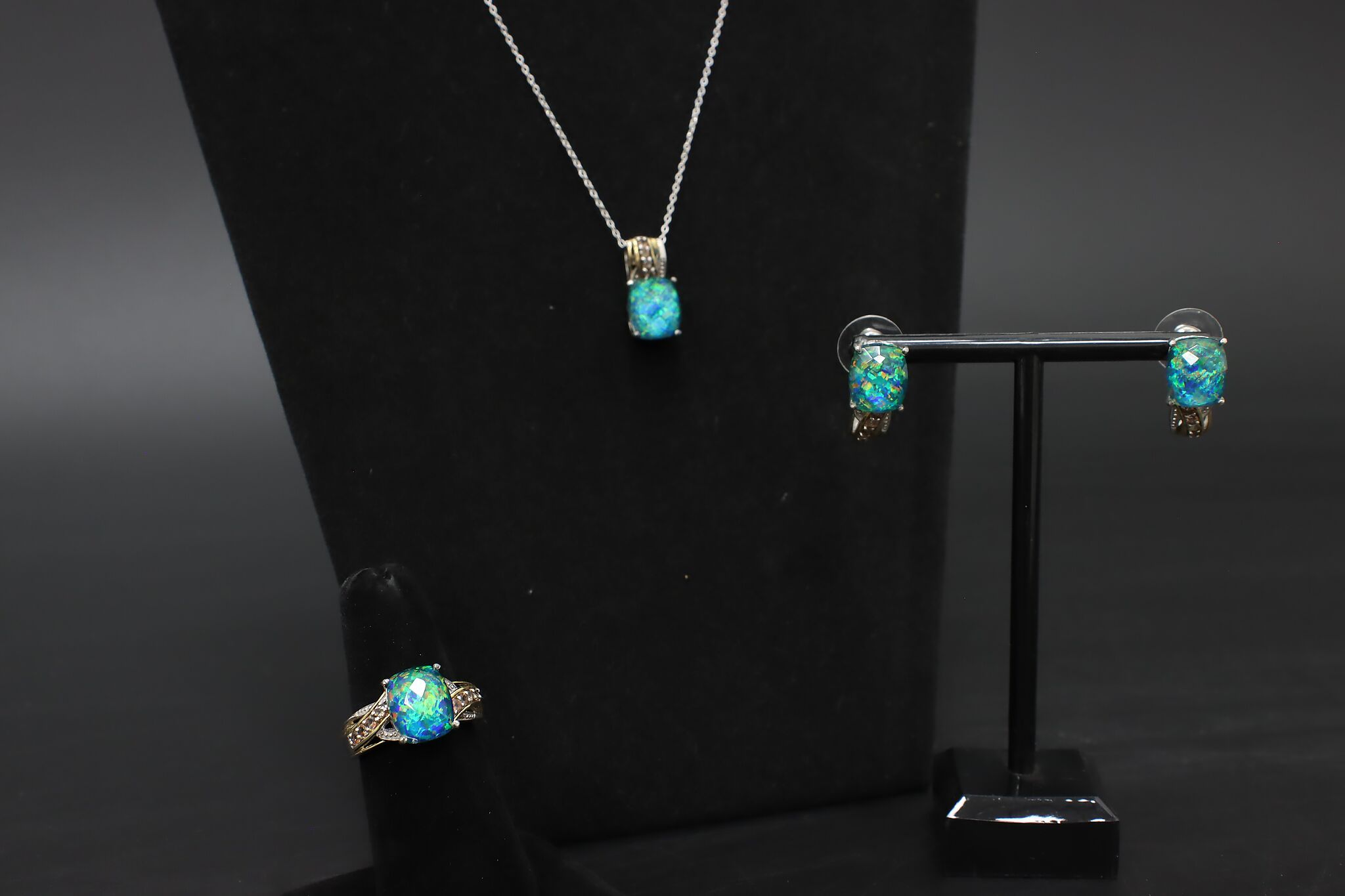 What's better for a social event than matching jewelry? This four piece set includes a size 9 ring, pair of earrings, and a pendant necklace. Each piece has a gorgeous sparkly cubic zirconia gemstone for that extra dash of brilliance.