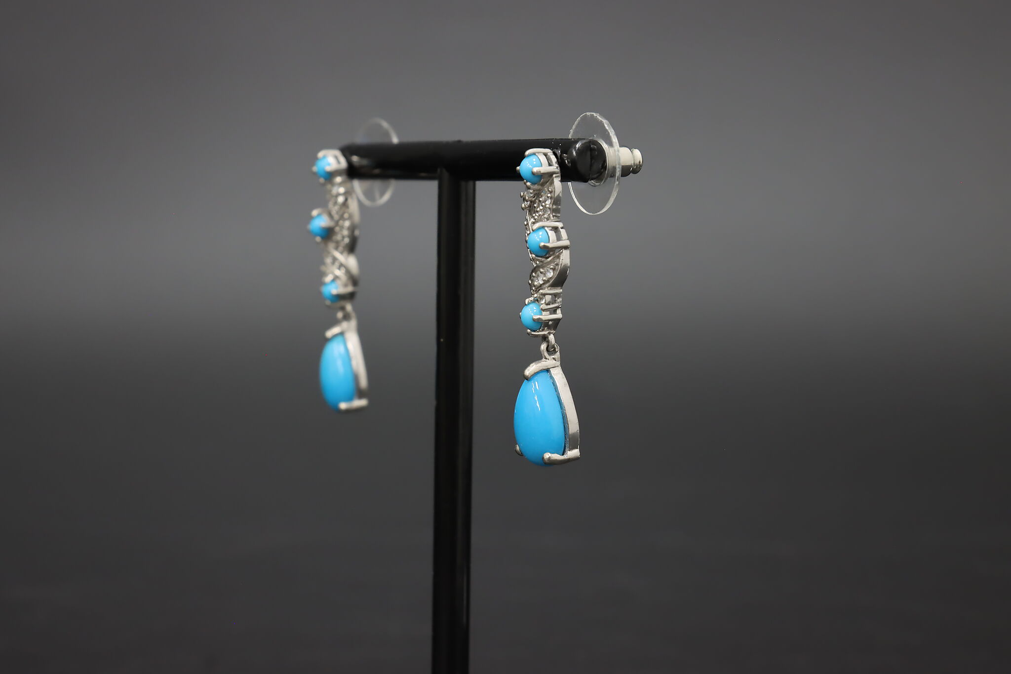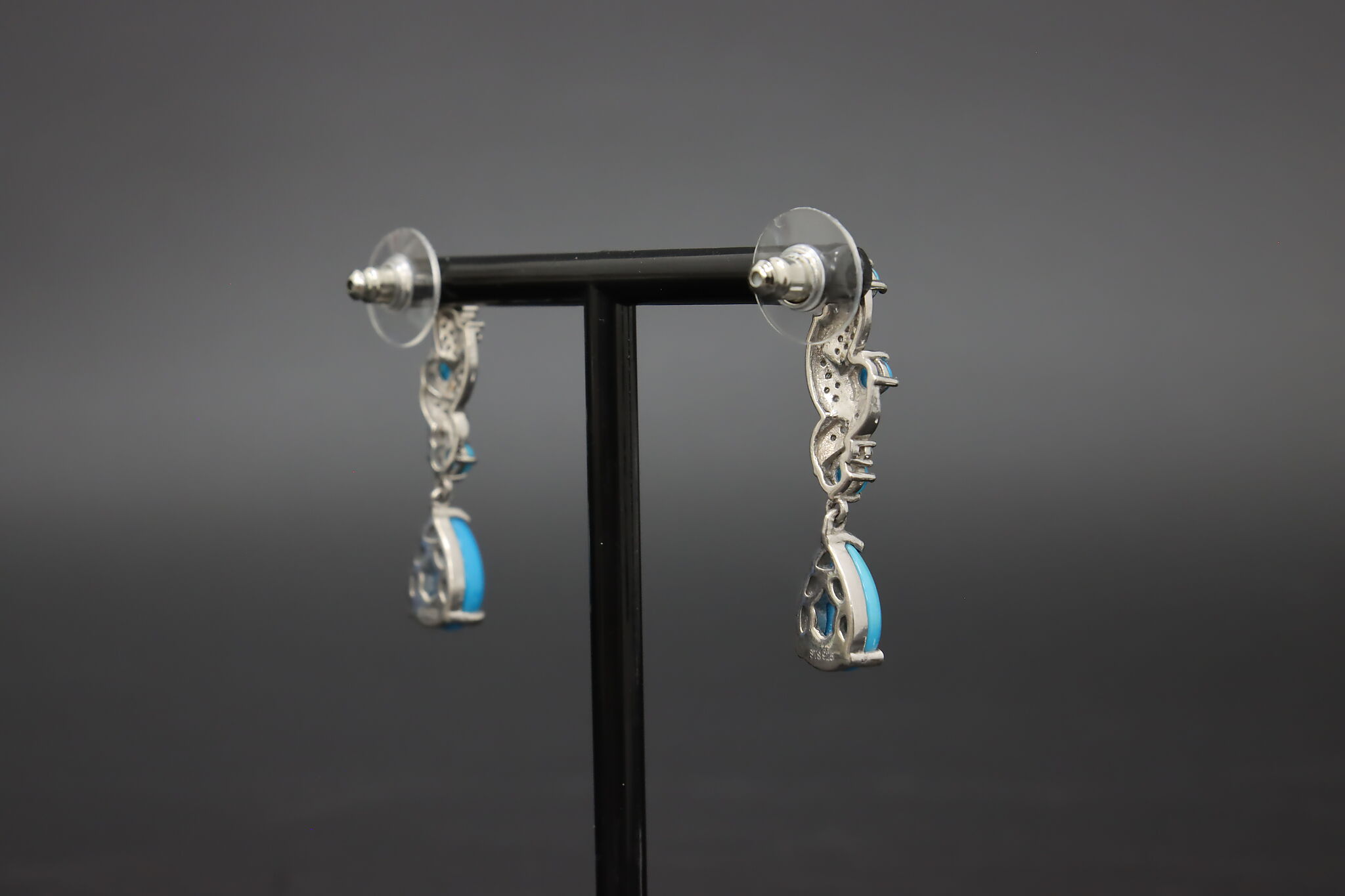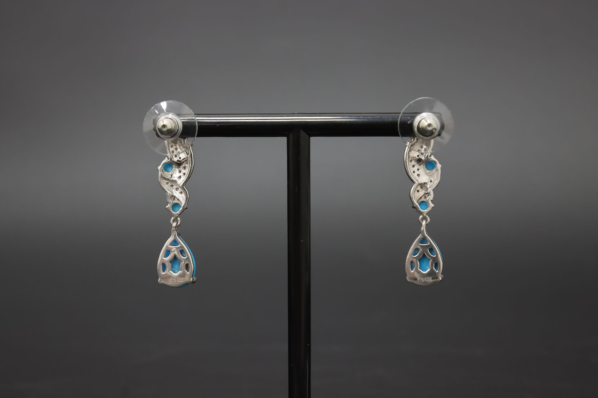Beautiful sterling silver drop earrings featuring bright blue Sleeping Beauty style turquoise stones accented with detailed silver scrollwork.