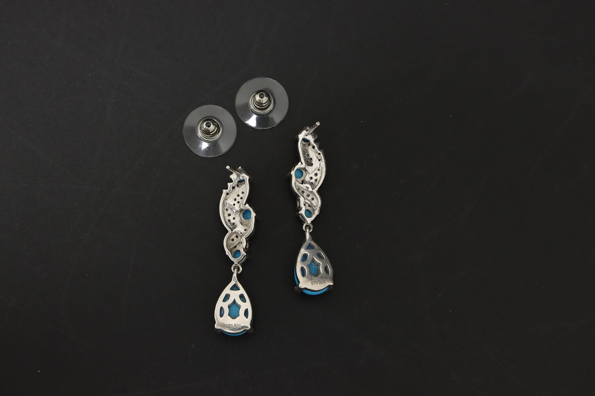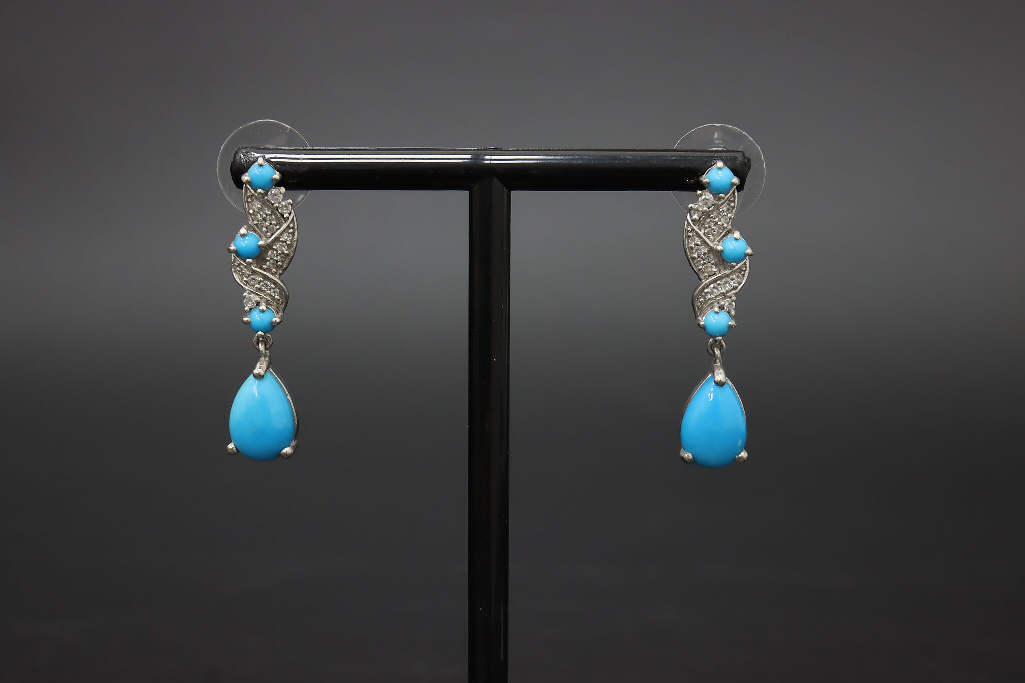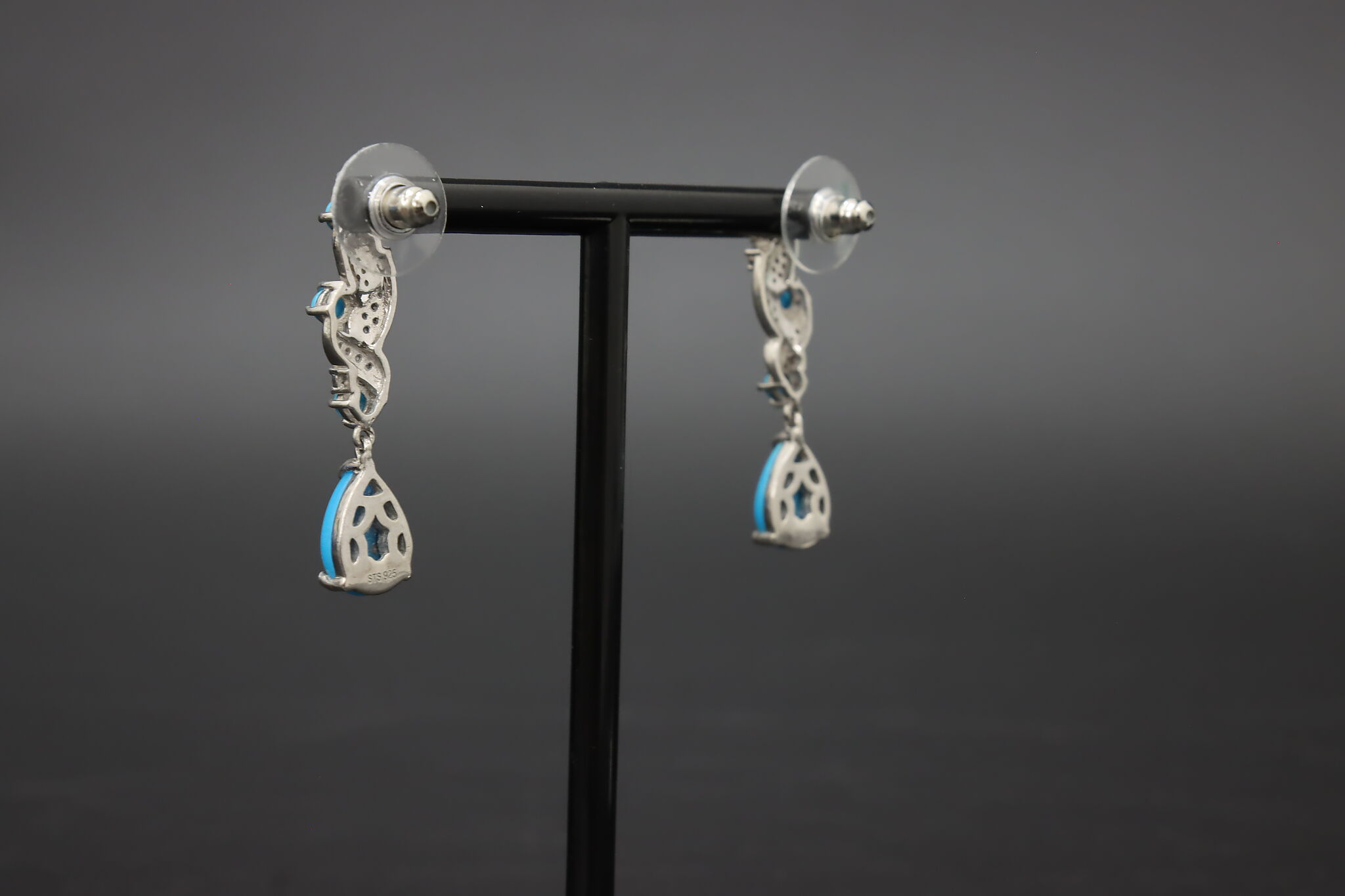 Beautiful sterling silver drop earrings featuring bright blue Sleeping Beauty style turquoise stones accented with detailed silver scrollwork.