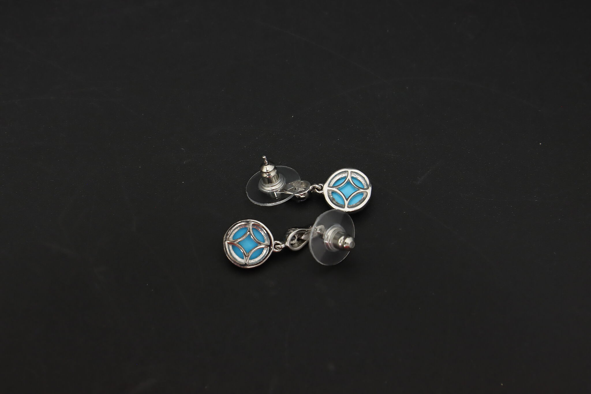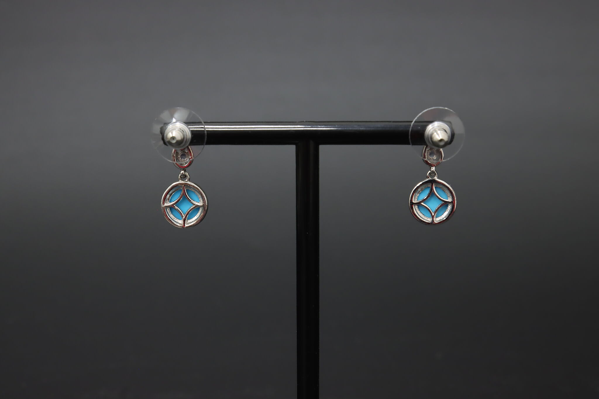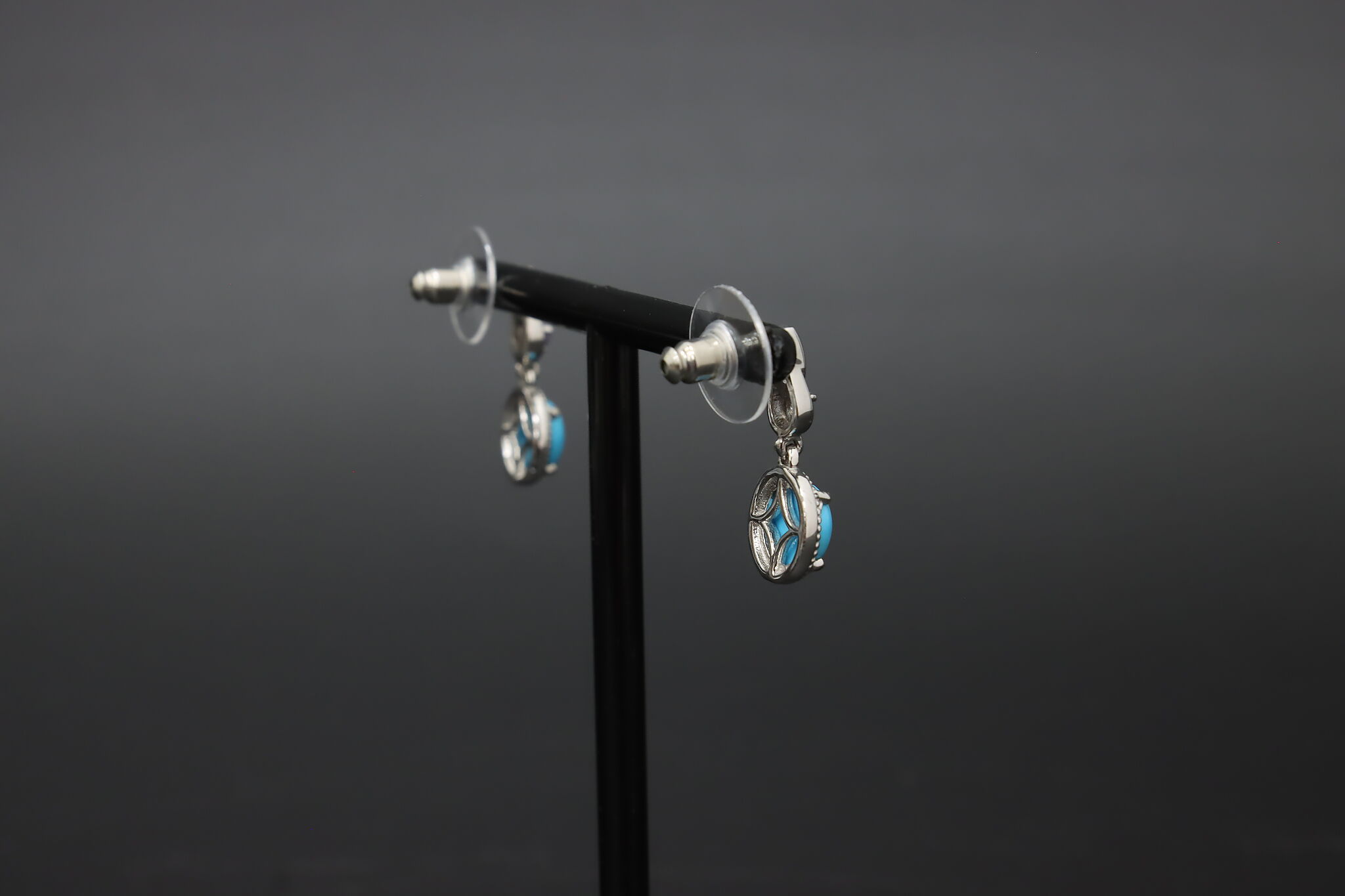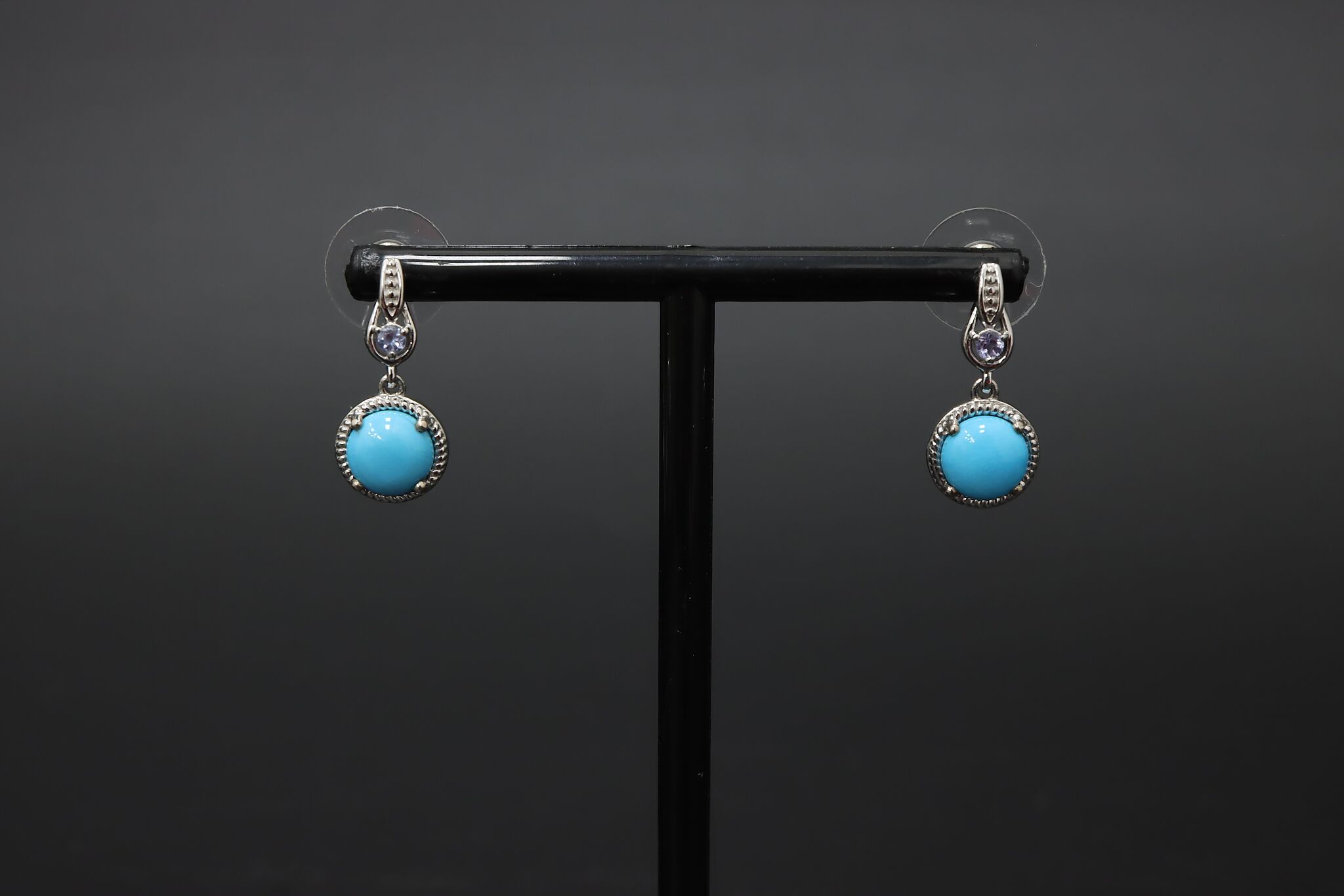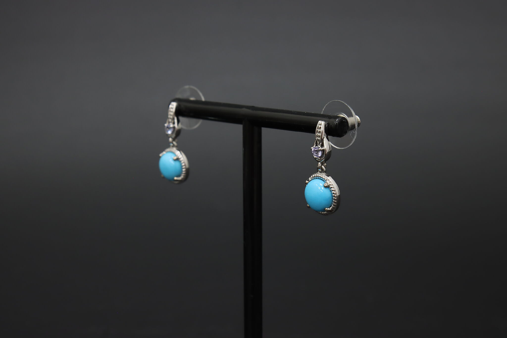 Classic sterling silver drop earrings featuring bright blue Sleeping Beauty style turquoise cabochons set in detailed rope-edge sterling bezels with CZ accents at the posts. These elegant earrings offer a timeless Southwest-inspired look with clean vintage styling.