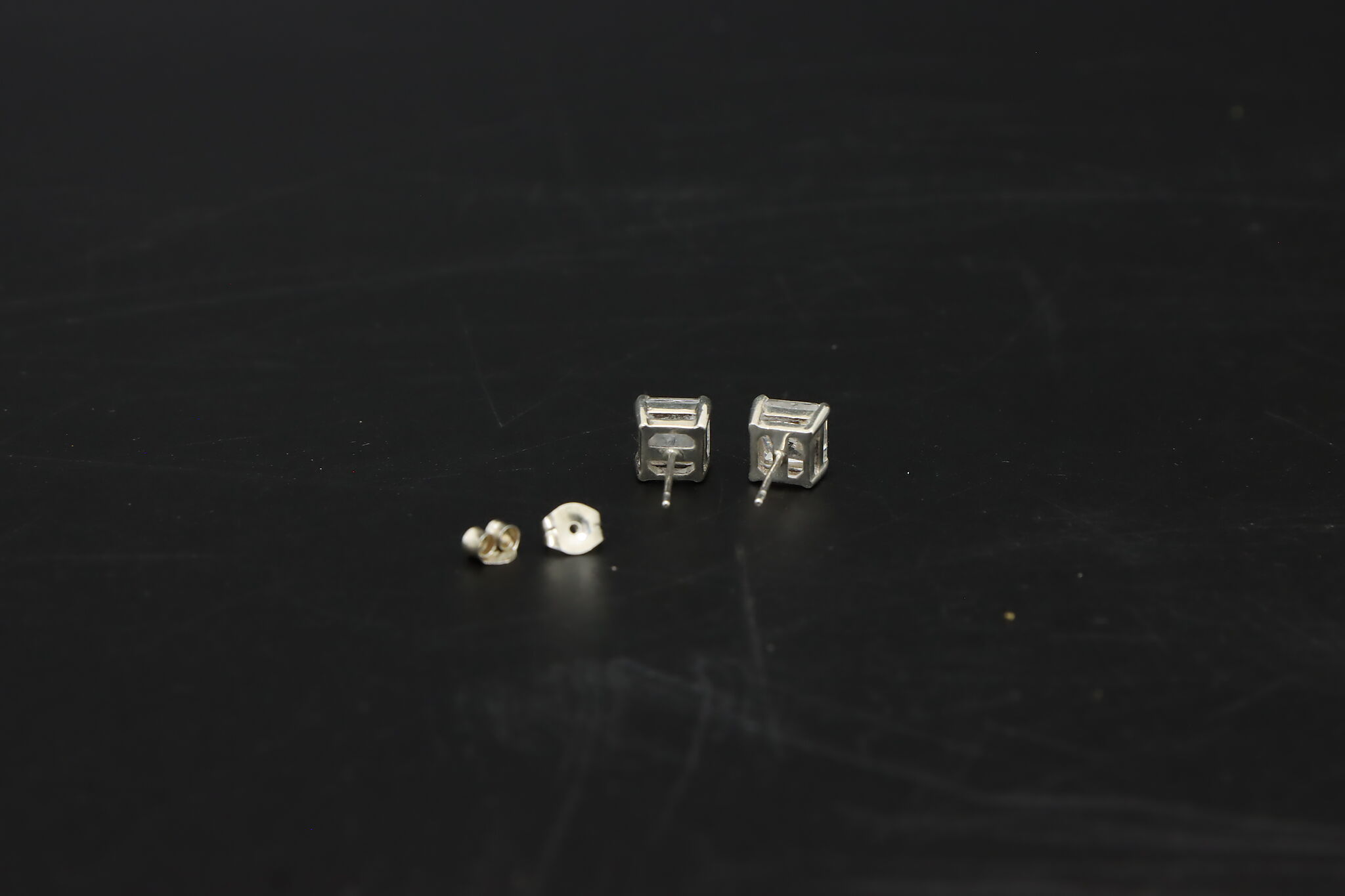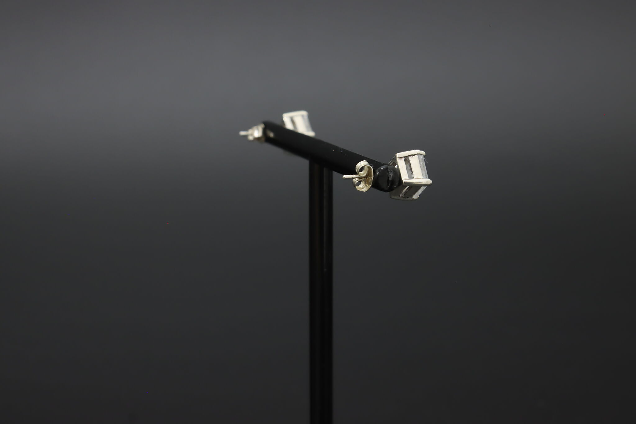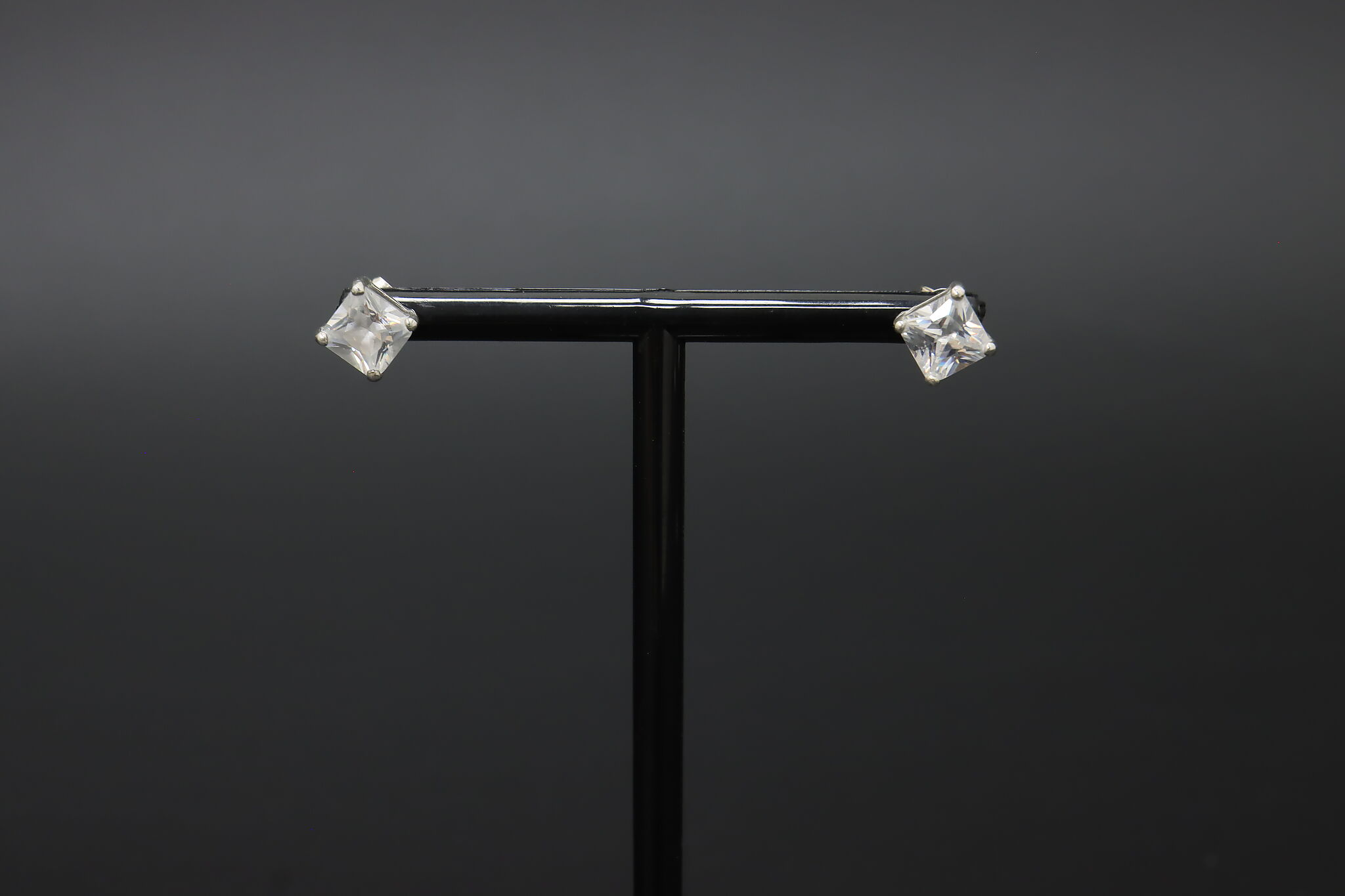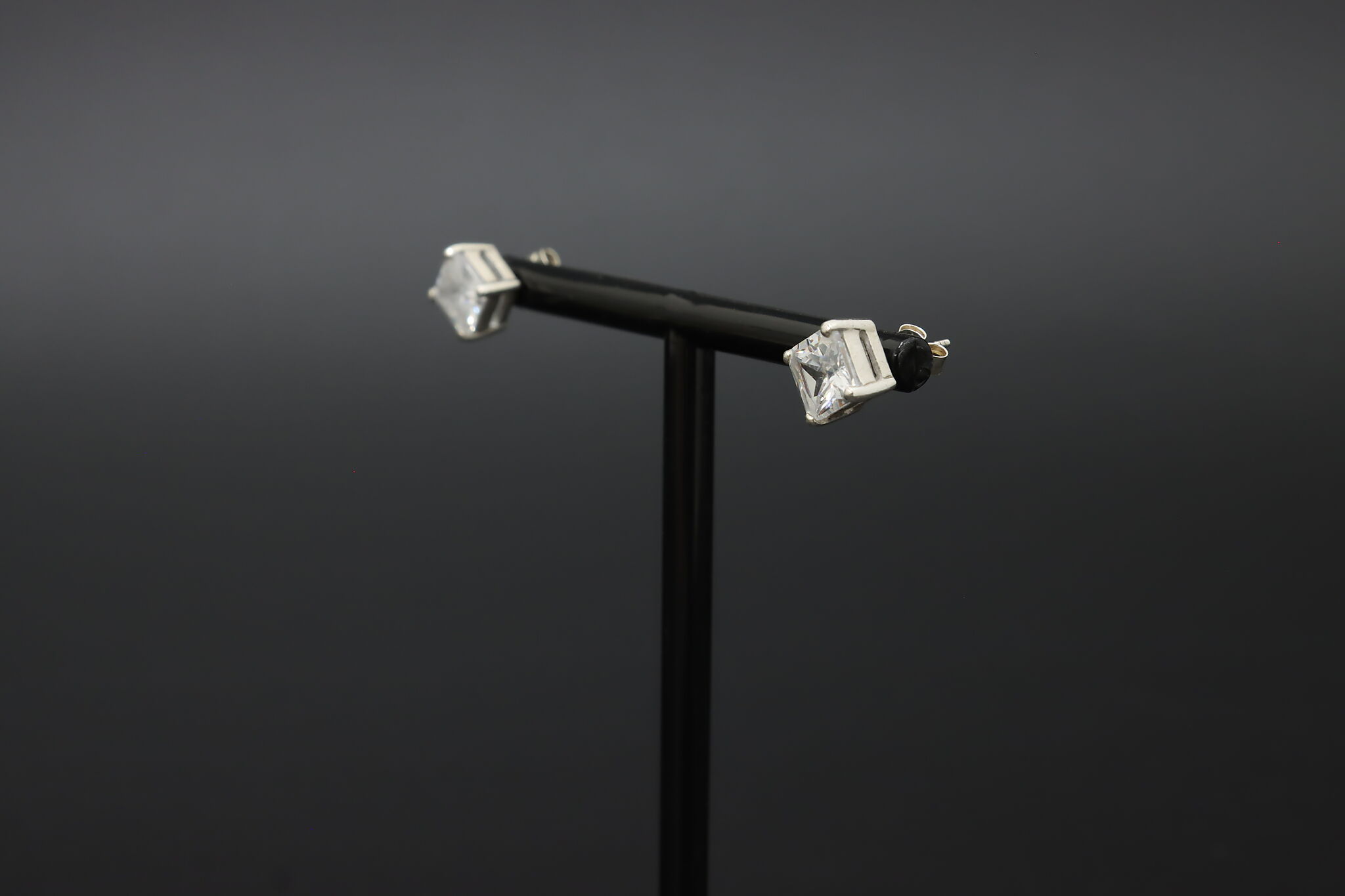 Classic sterling silver stud earrings set with sparkling square-cut cubic zirconia stones secured in a clean prong setting for a timeless, elegant look.