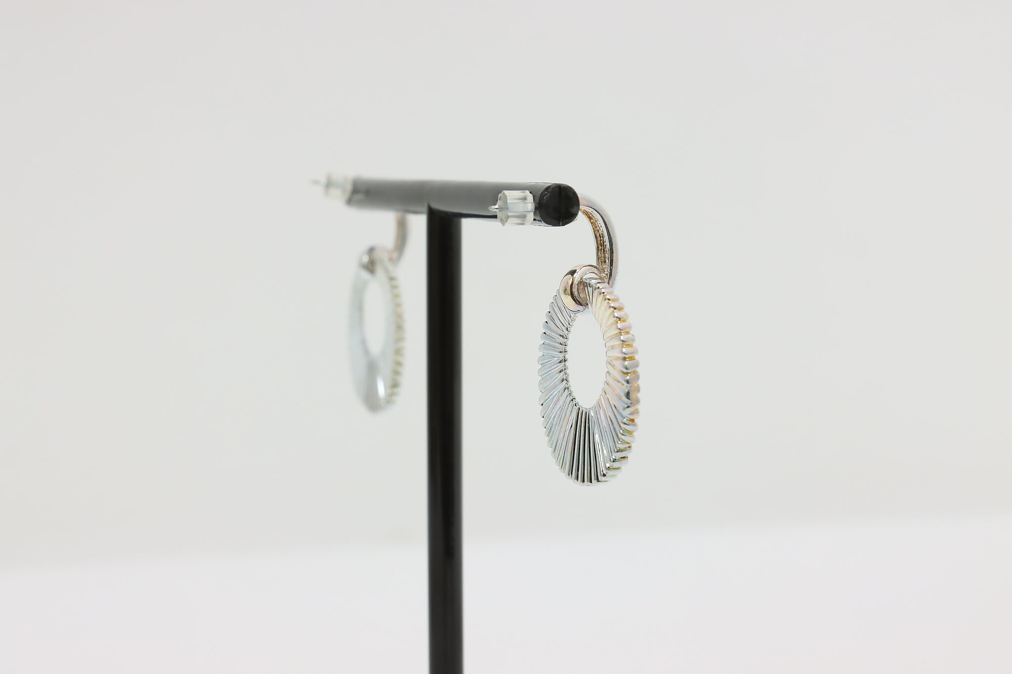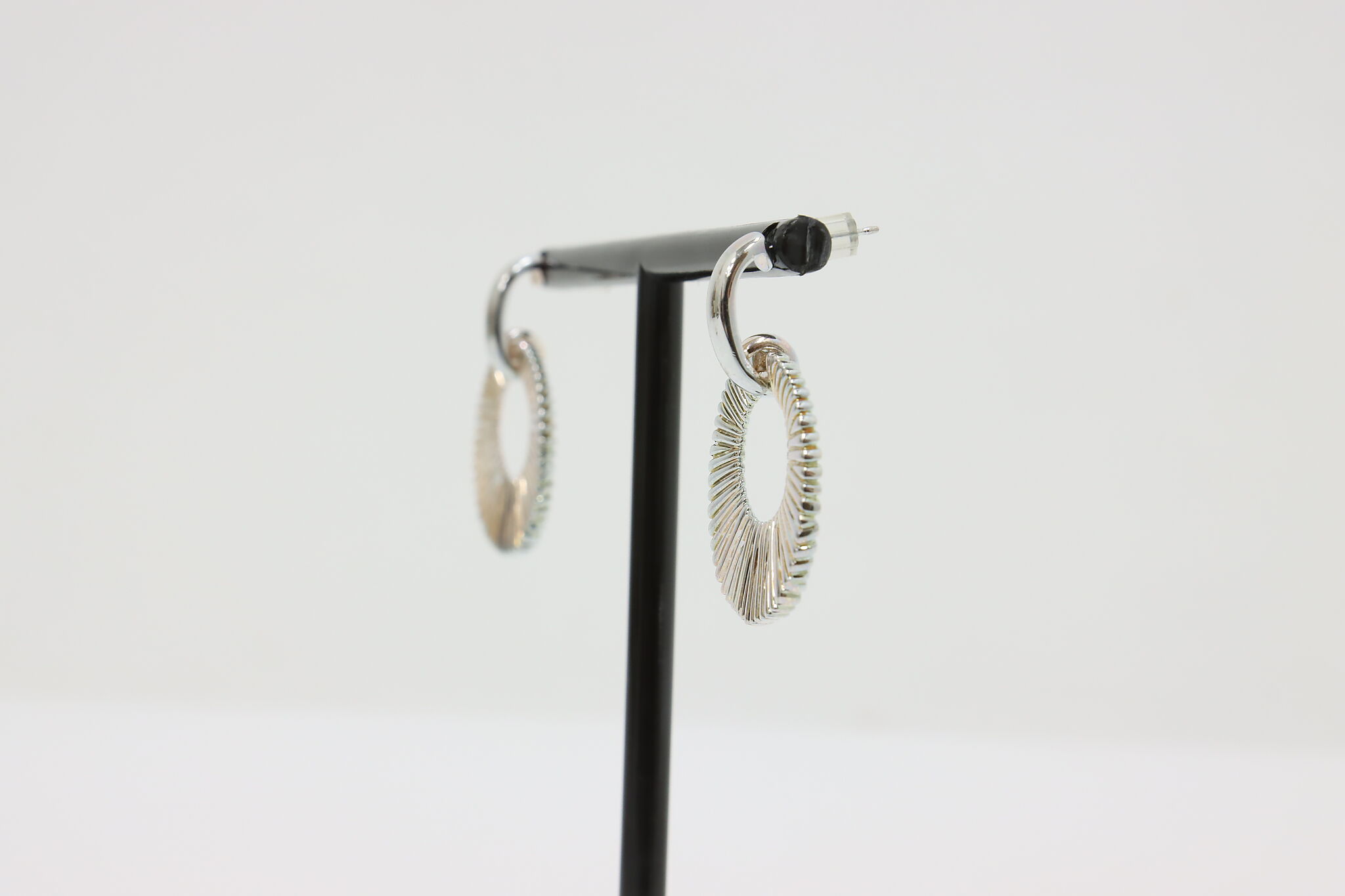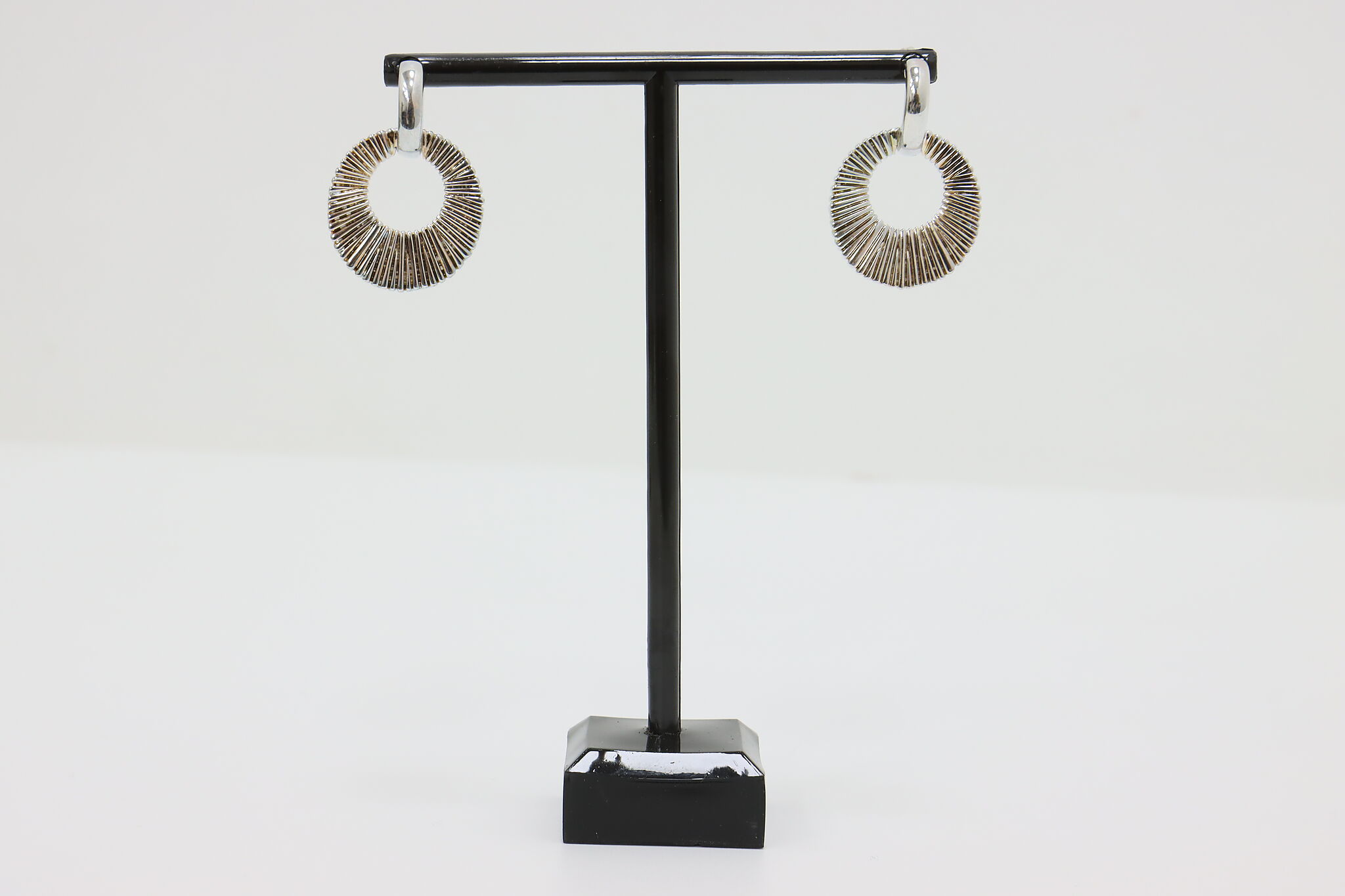 Modern sterling silver earrings featuring textured circular drops with raised ridged detailing and smooth silver hoops. Lightweight movement with a bold, sculptural look.