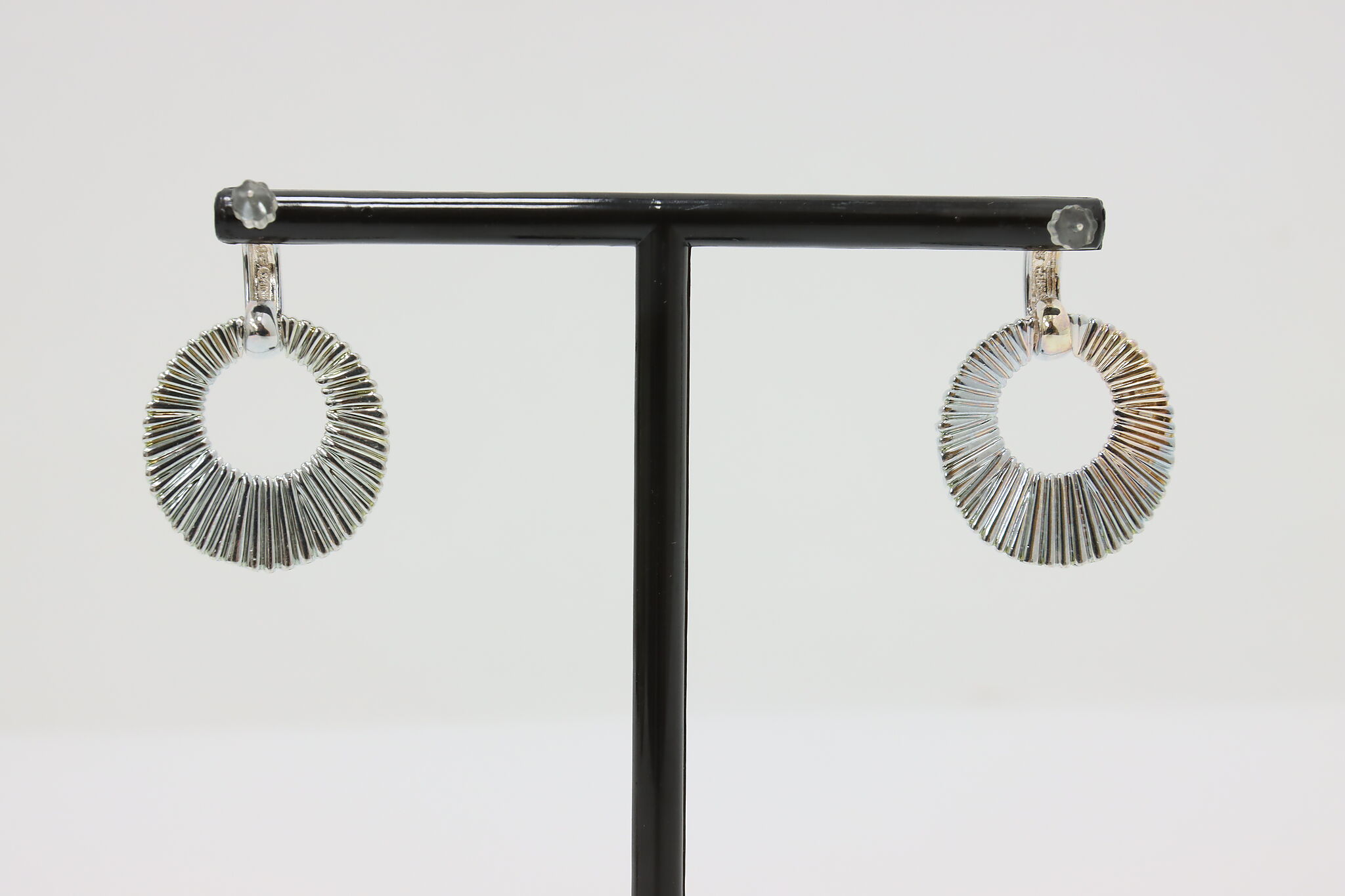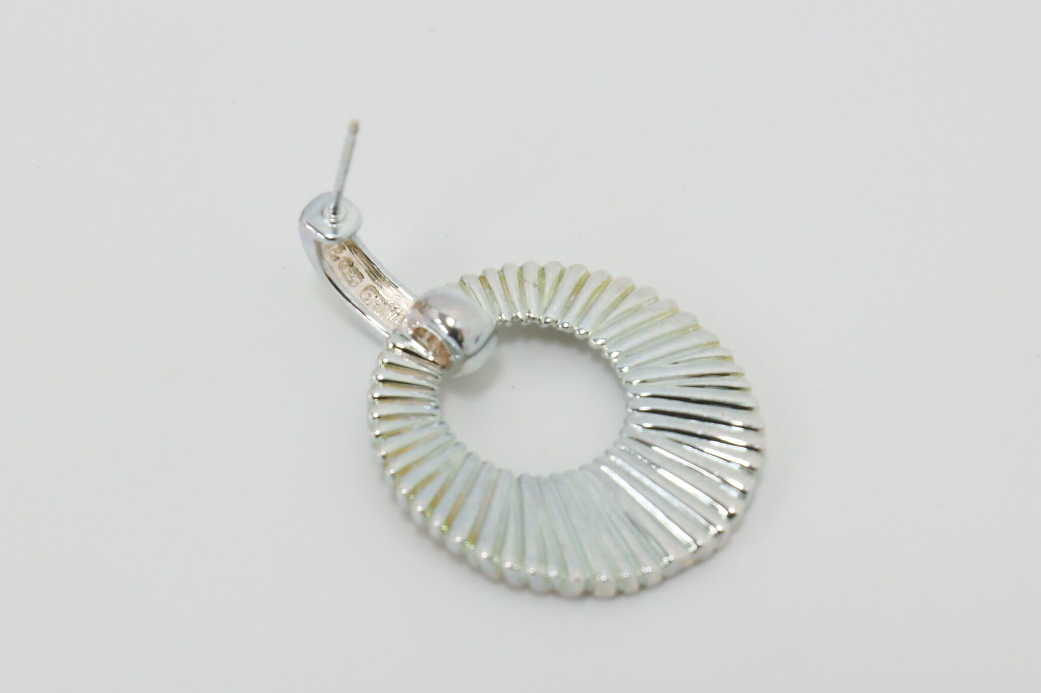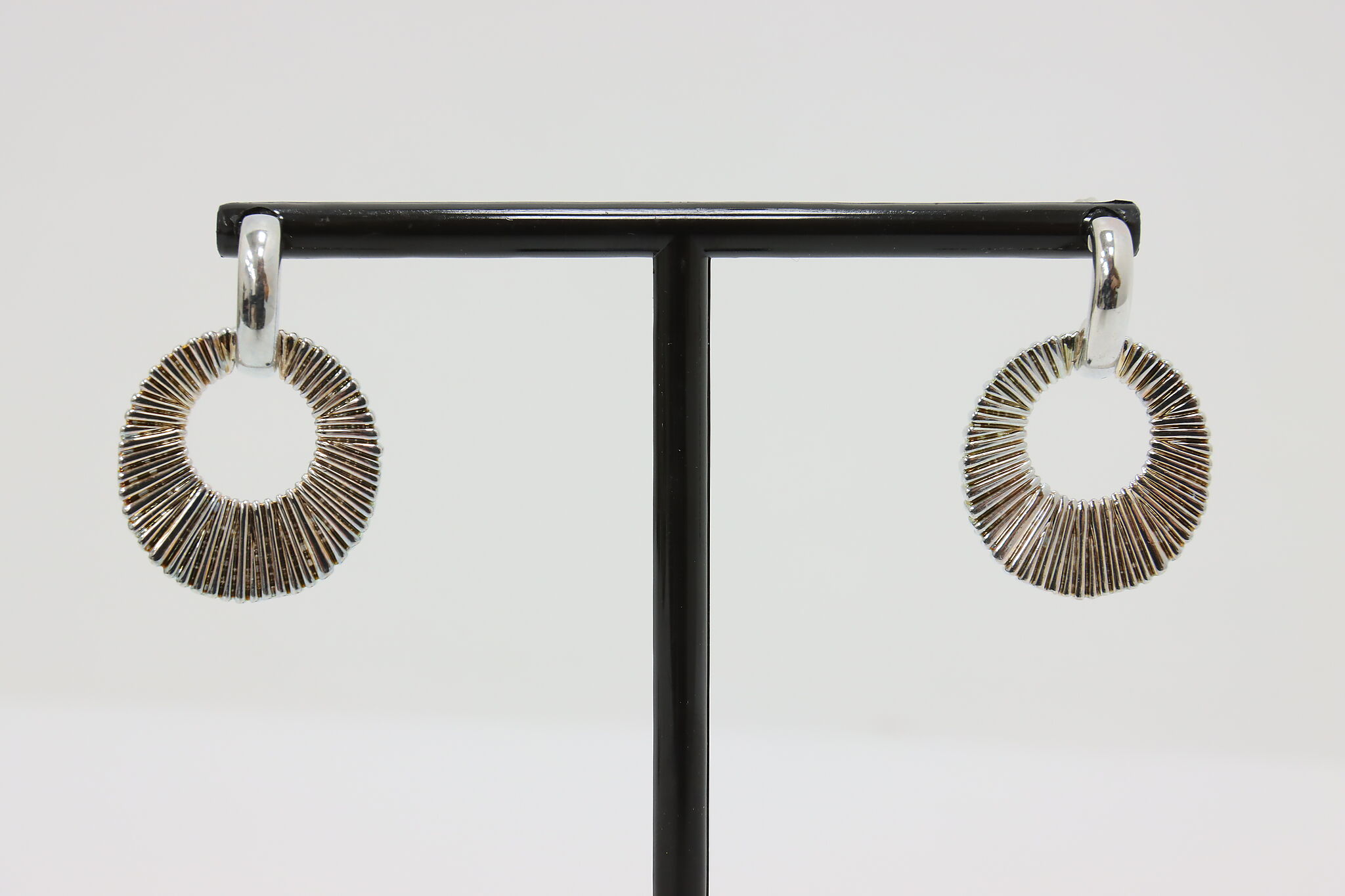 Modern sterling silver earrings featuring textured circular drops with raised ridged detailing and smooth silver hoops. Lightweight movement with a bold, sculptural look.