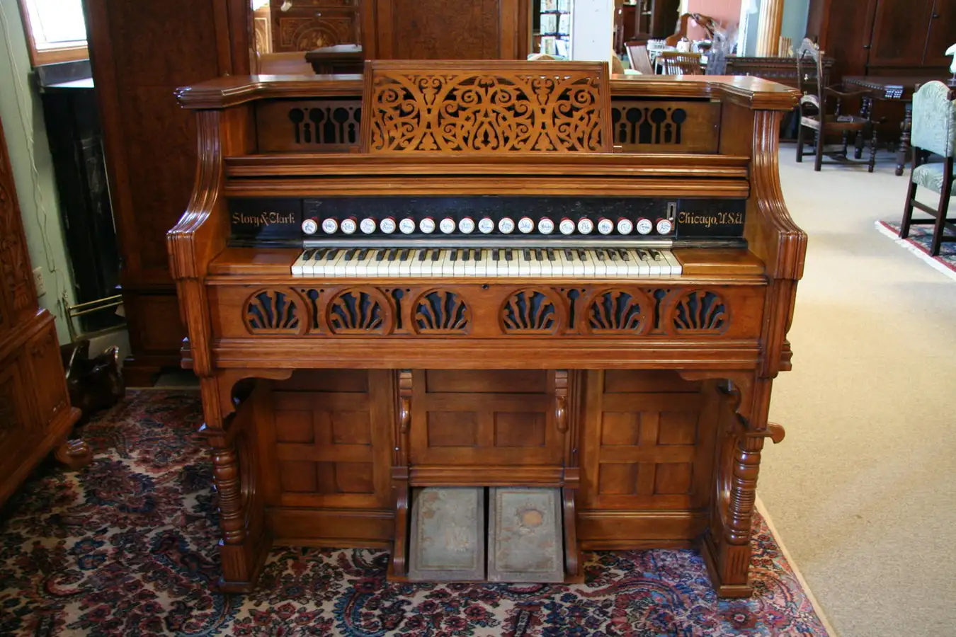 Built by Story and Clark of Chicago about 1890, this marvelous reed organ has an oak case with late Victorian or Eastlake moldings and carving. This large concert reed organ was made for a lodge, concert hall or church, and was therefore finished and paneled on all sides. The 19 original hand painted porcelain stops are intact, many more than on a typical home style organ.