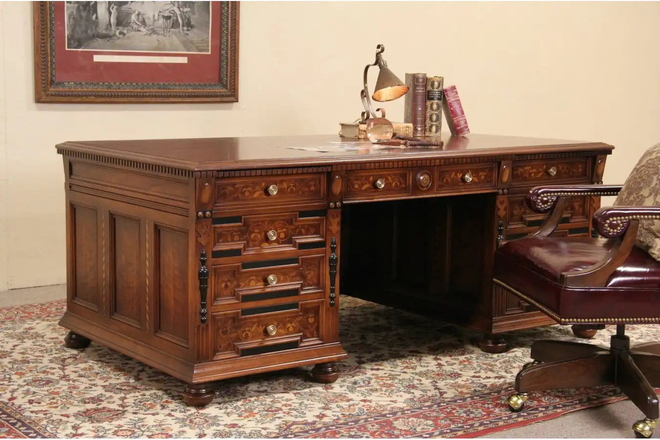 One of the finest 1920's executive desks that we have ever seen, this spectacular furniture is signed by noted maker, "Stow Davis of Grand Rapids, Mich."