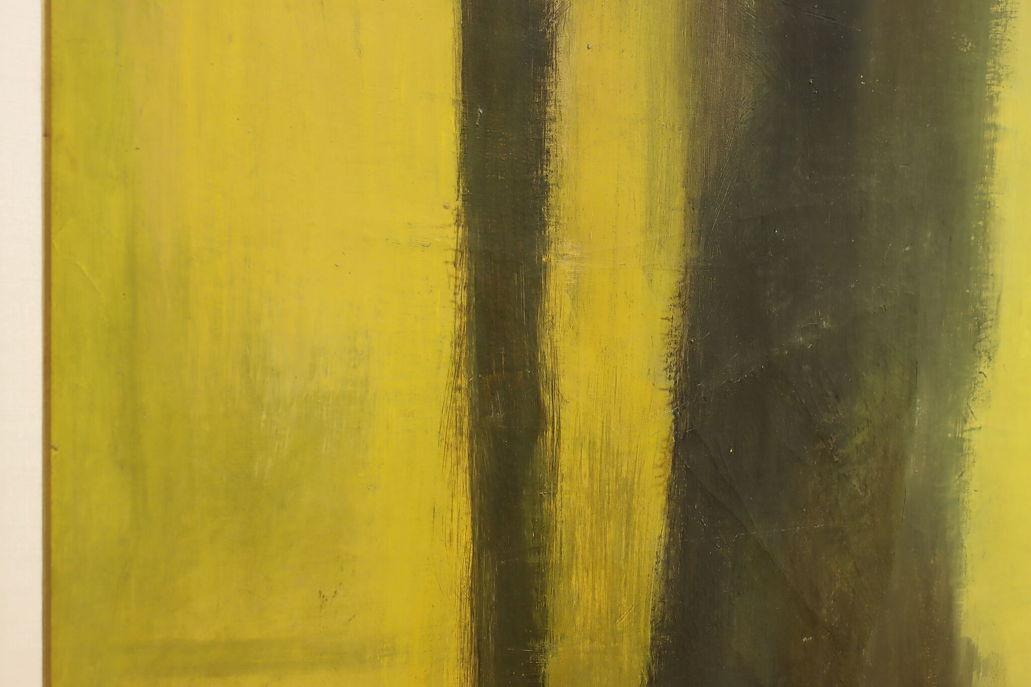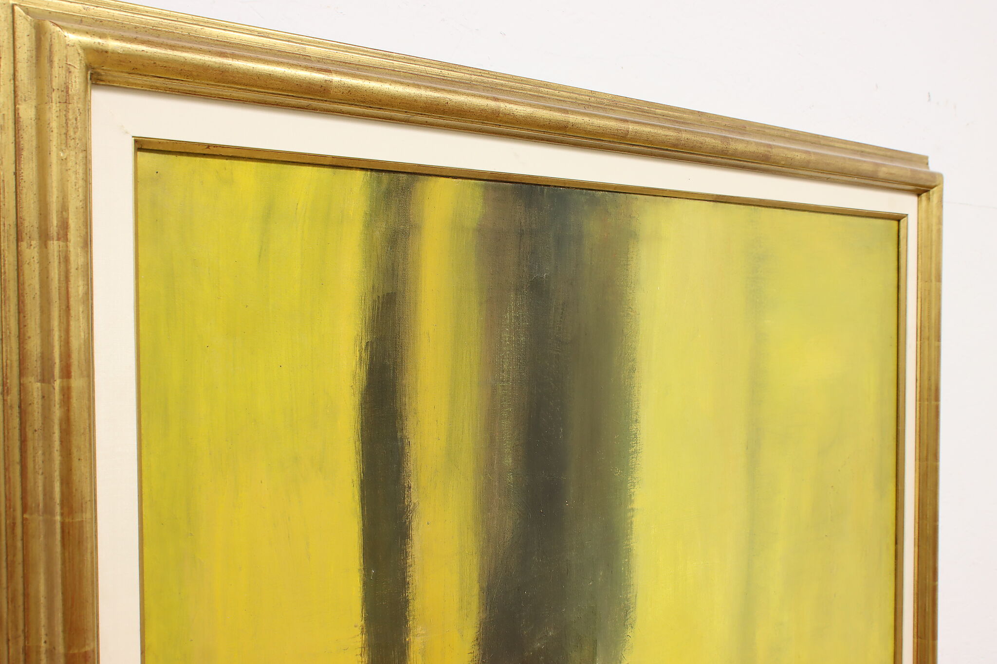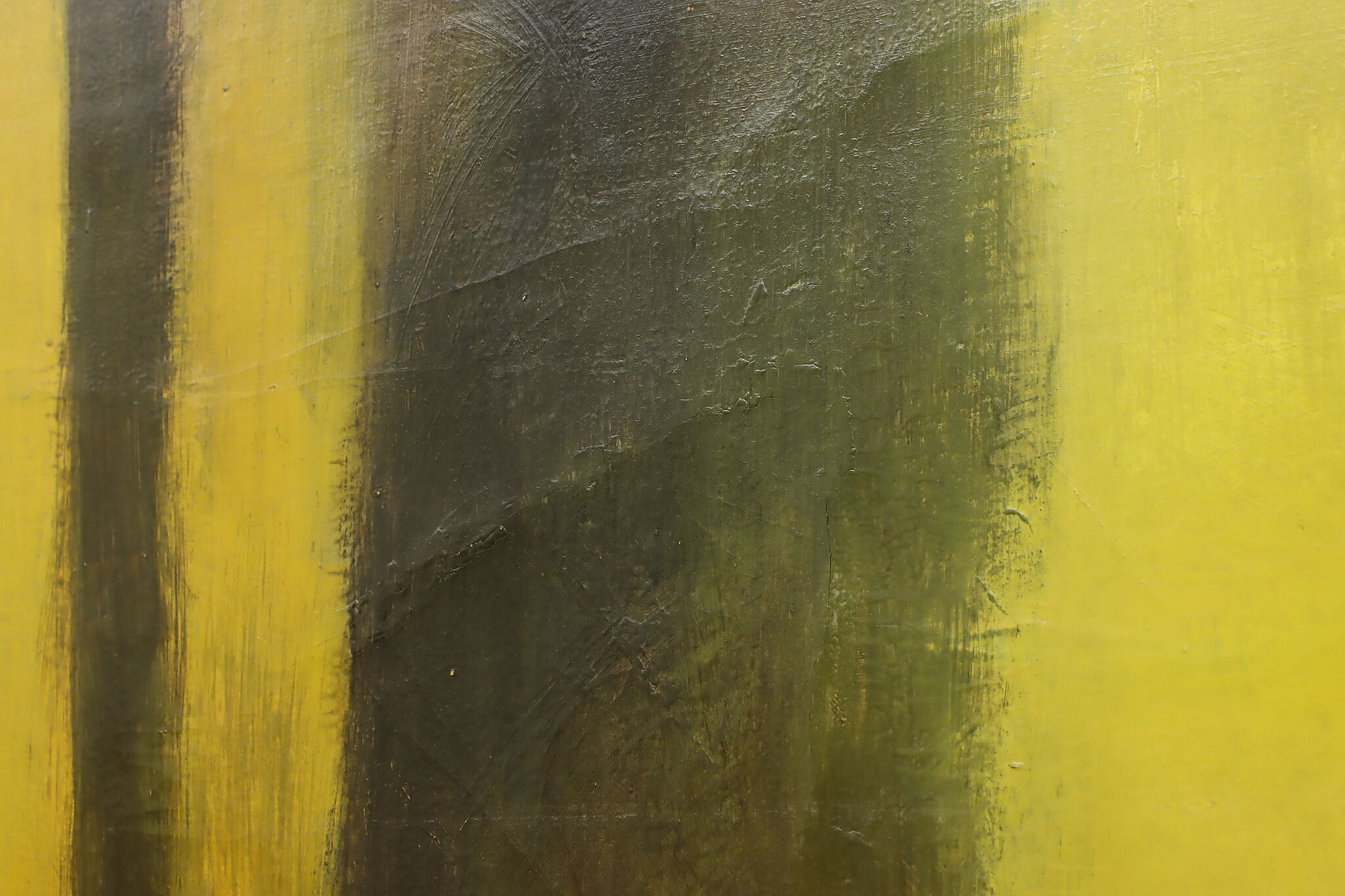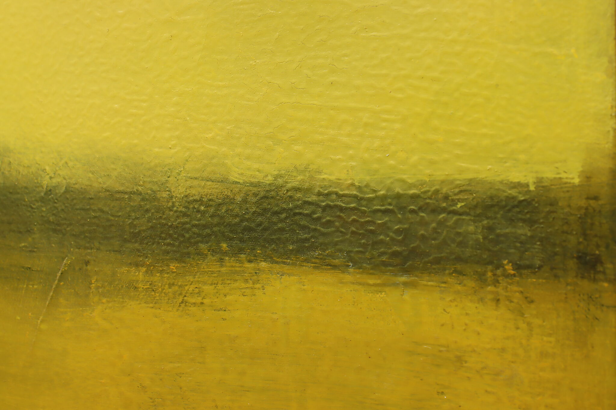 An abstract painting is a study in soft yellow and green colors for a unique piece of art.