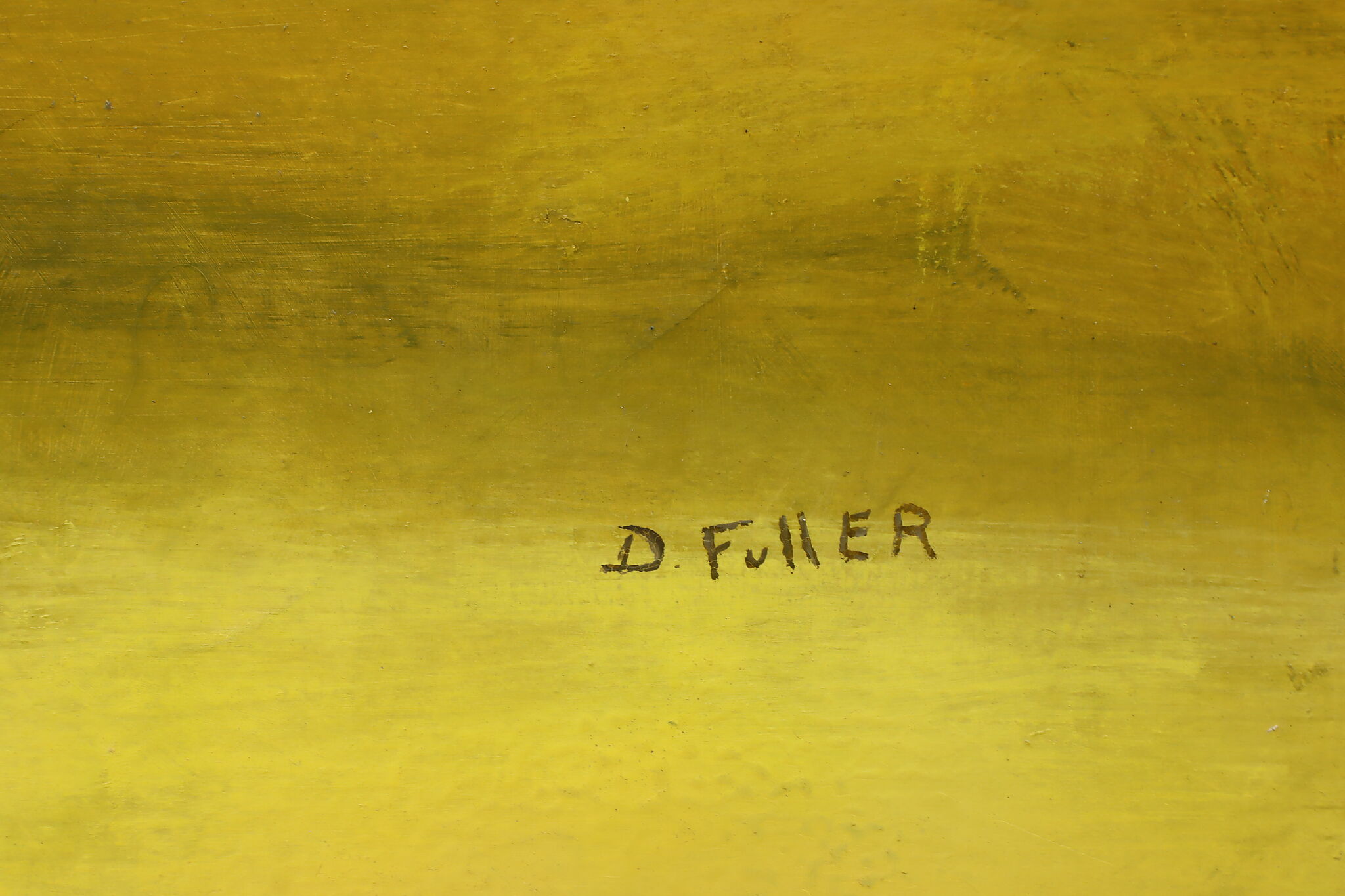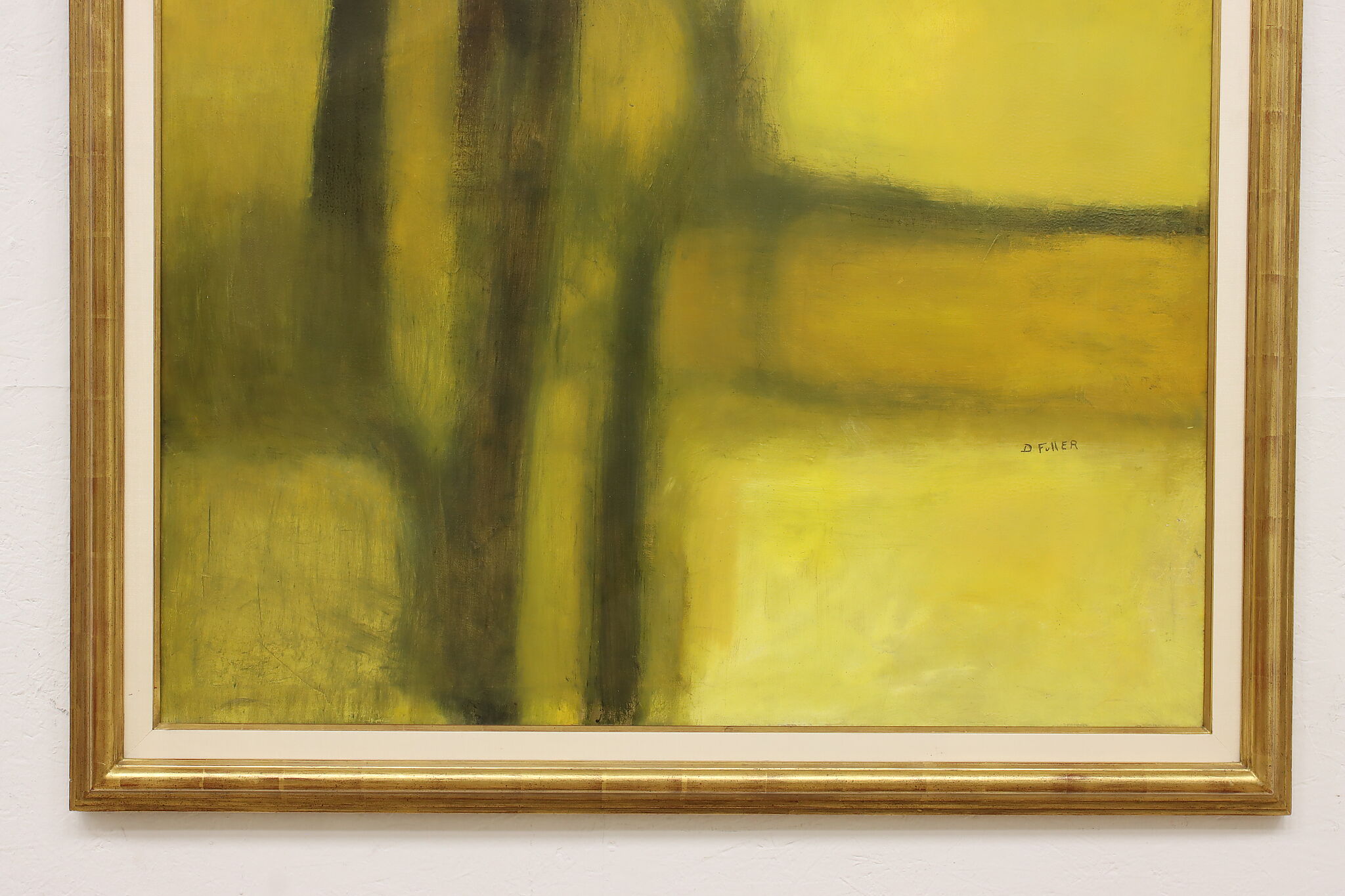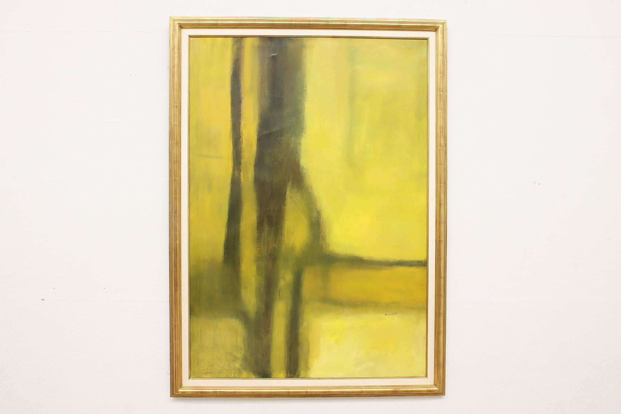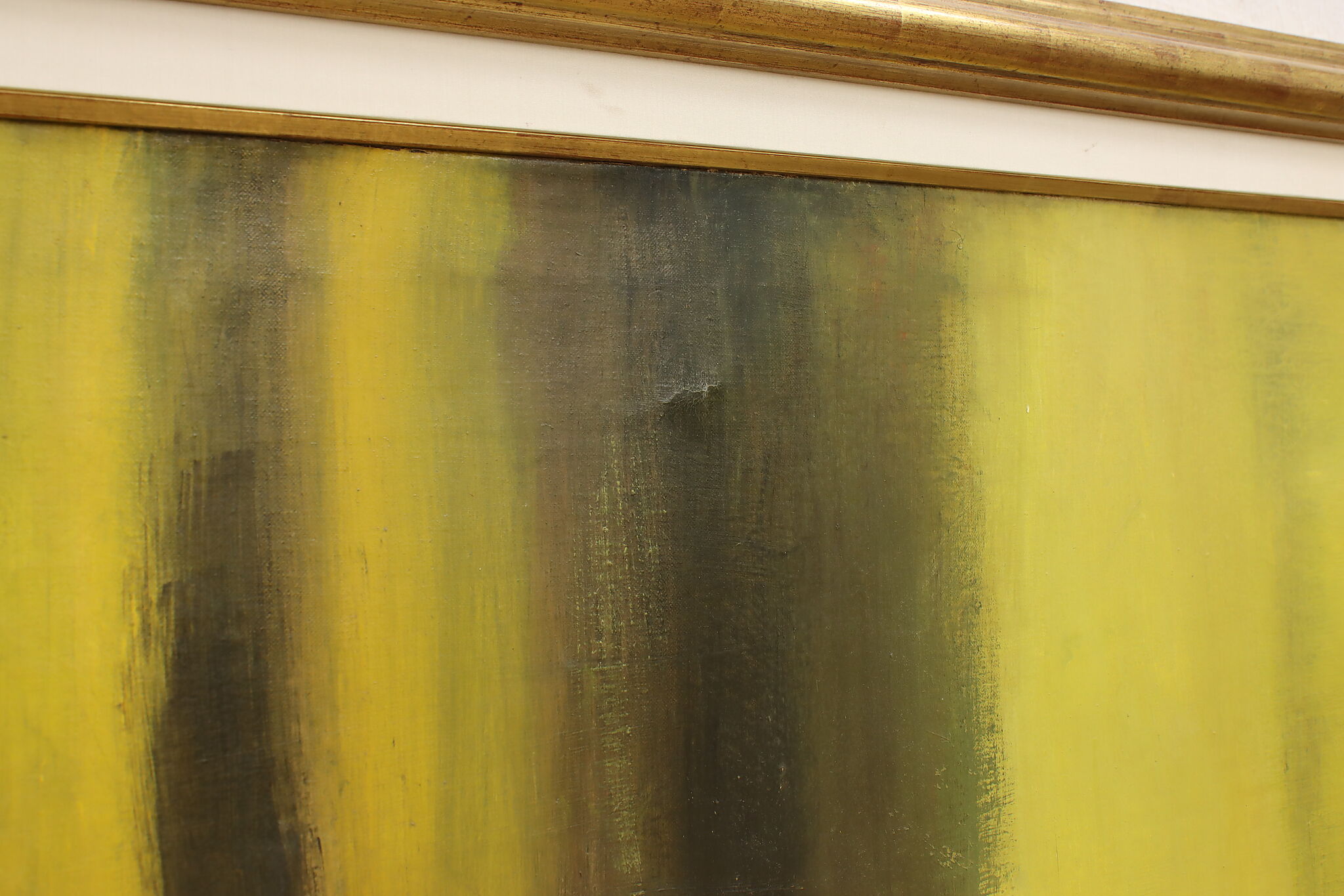 An abstract painting is a study in soft yellow and green colors for a unique piece of art.