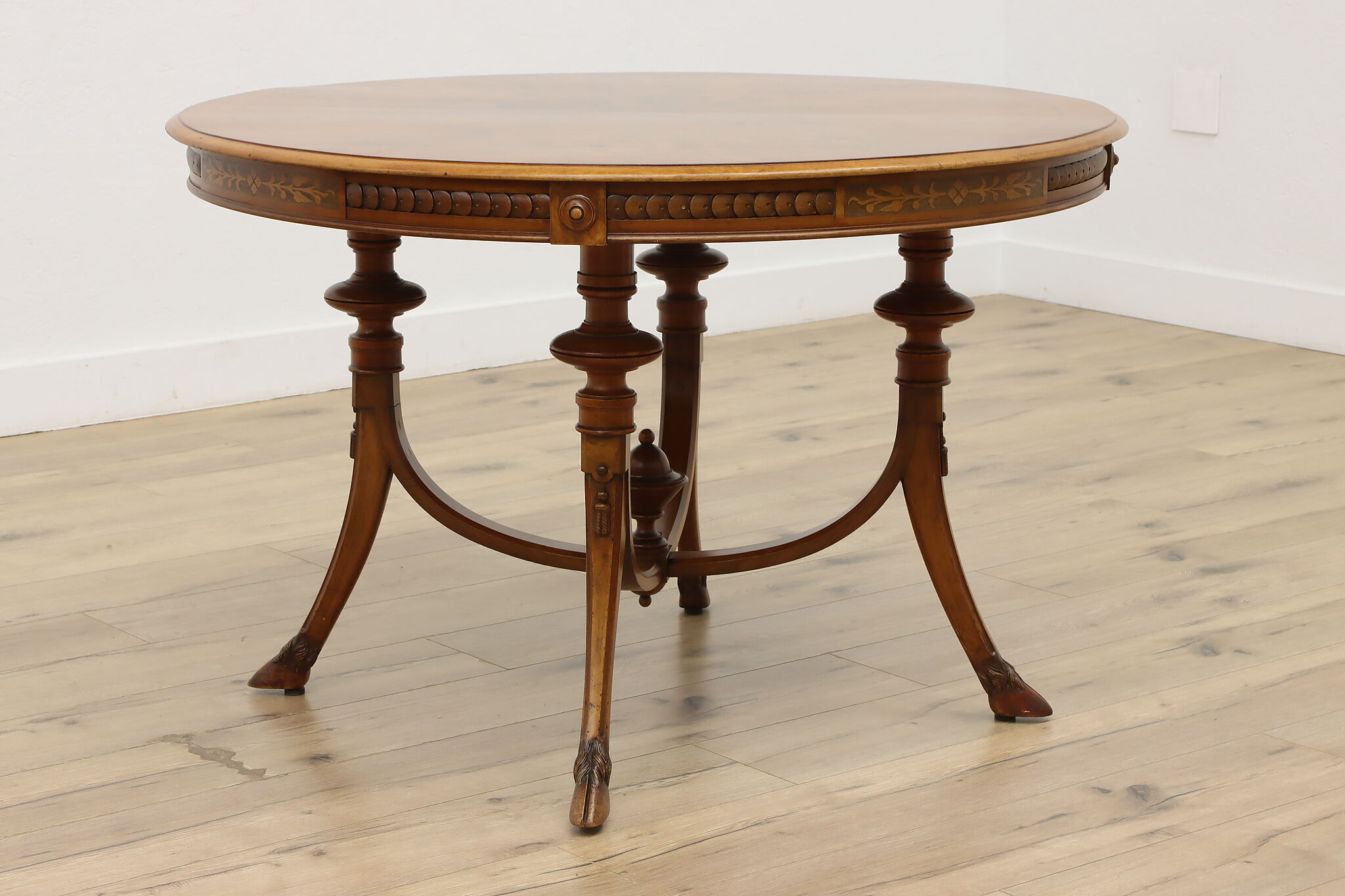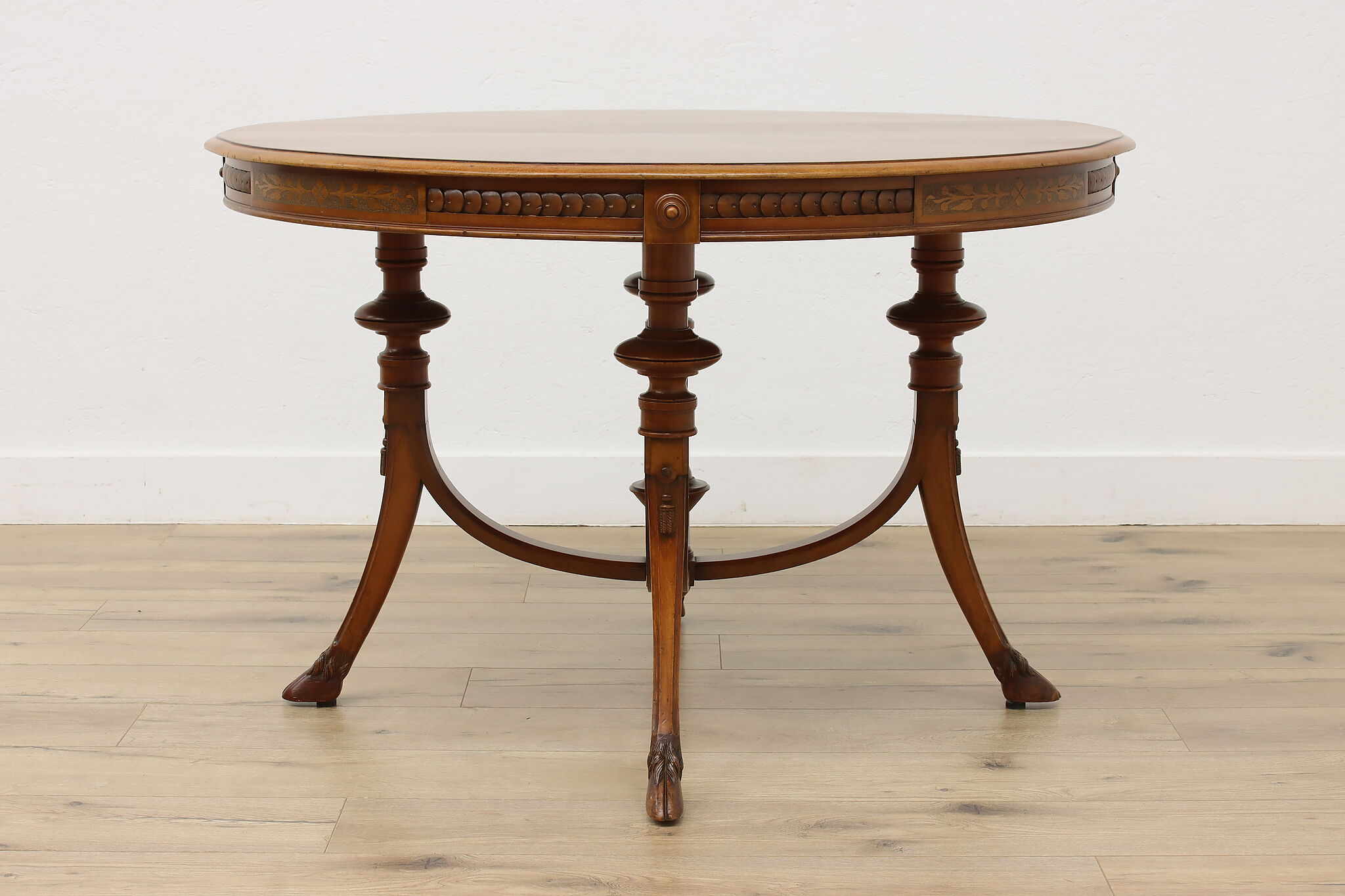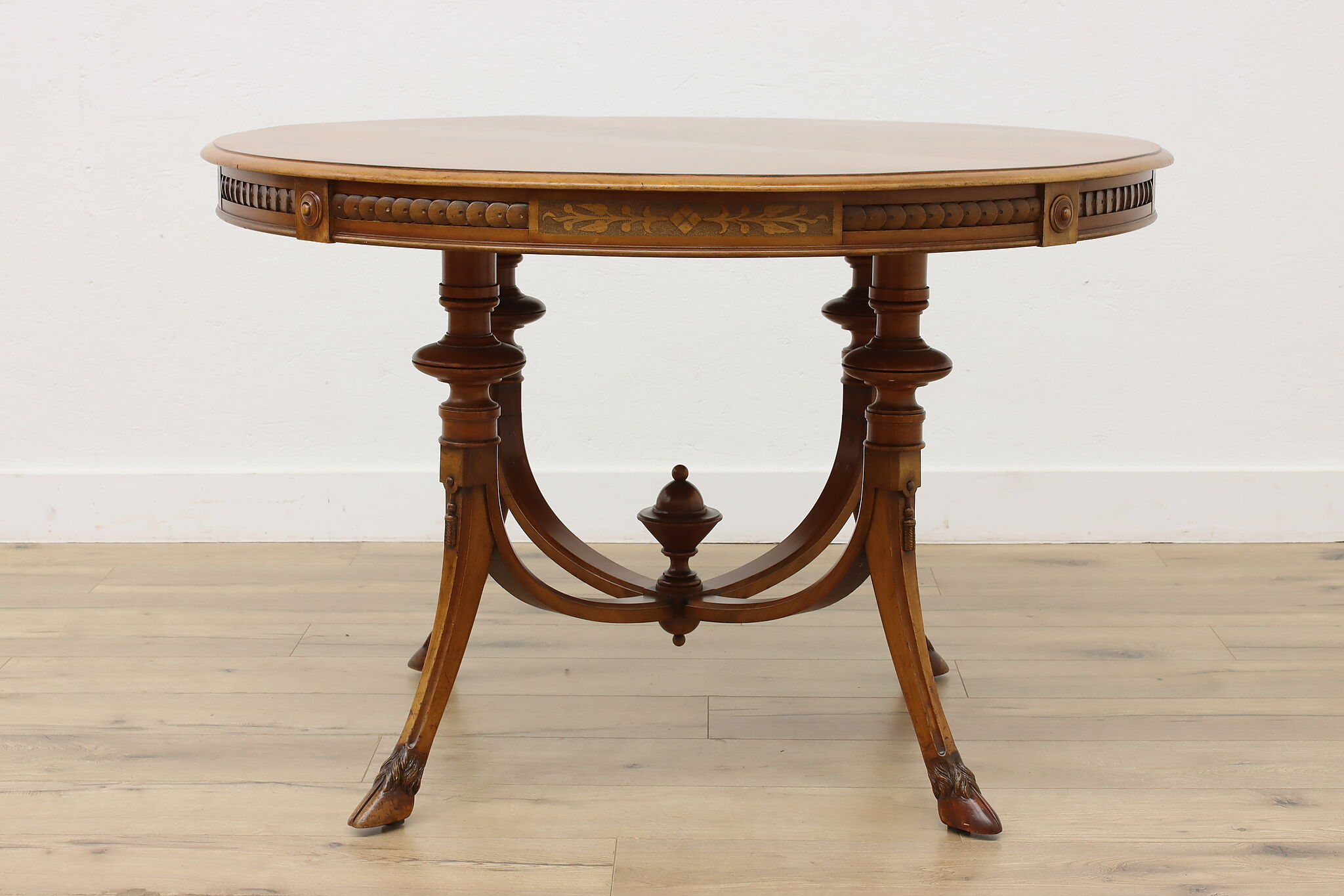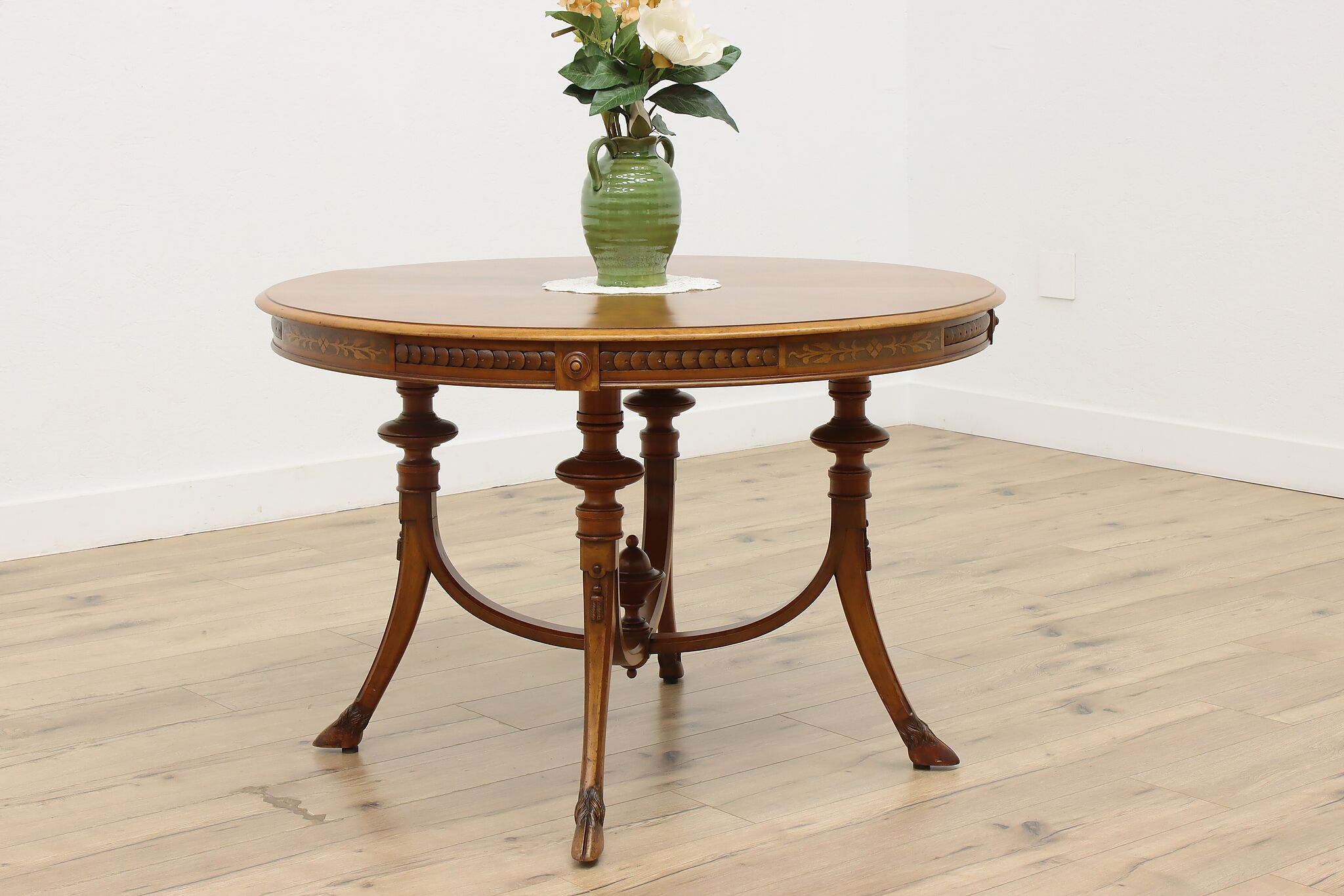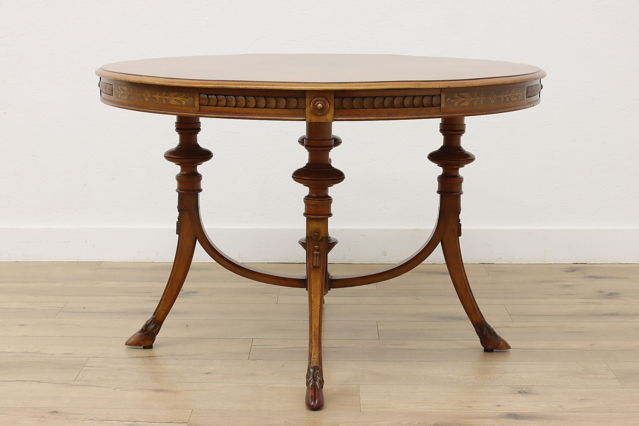 Looking for a unique table to add to your entryway or breakfast nook? This classical design round table may be just the piece with its horse hoof feet and "sunburst" top!