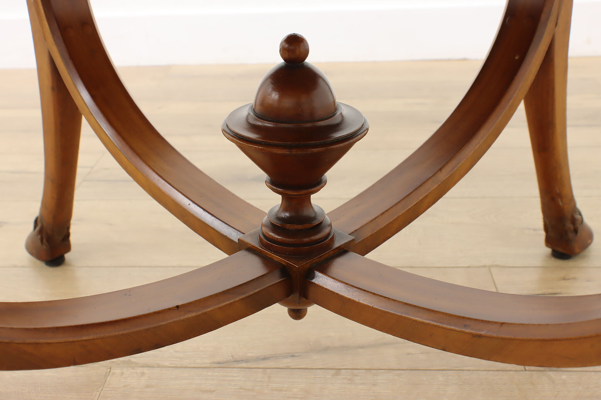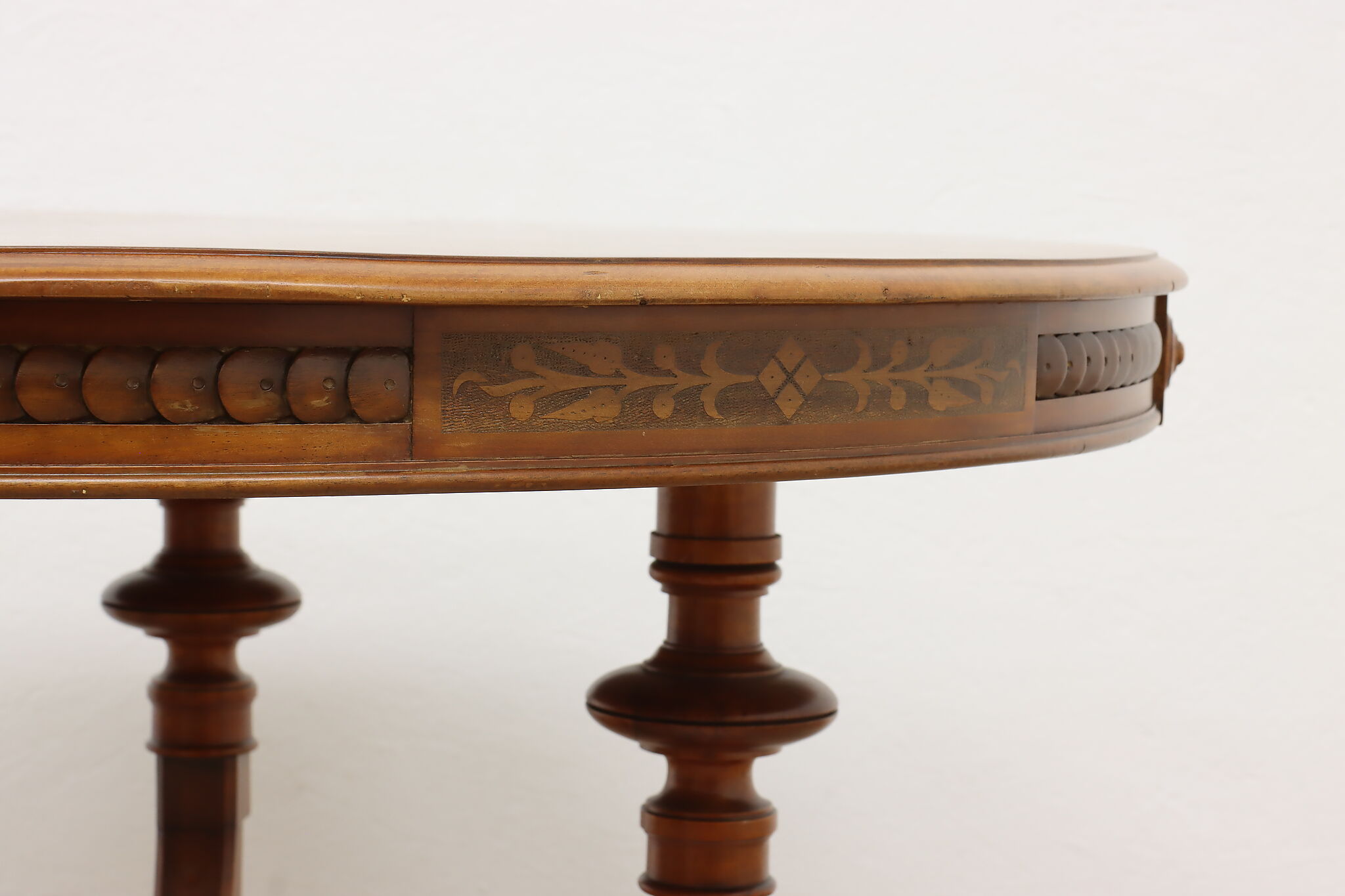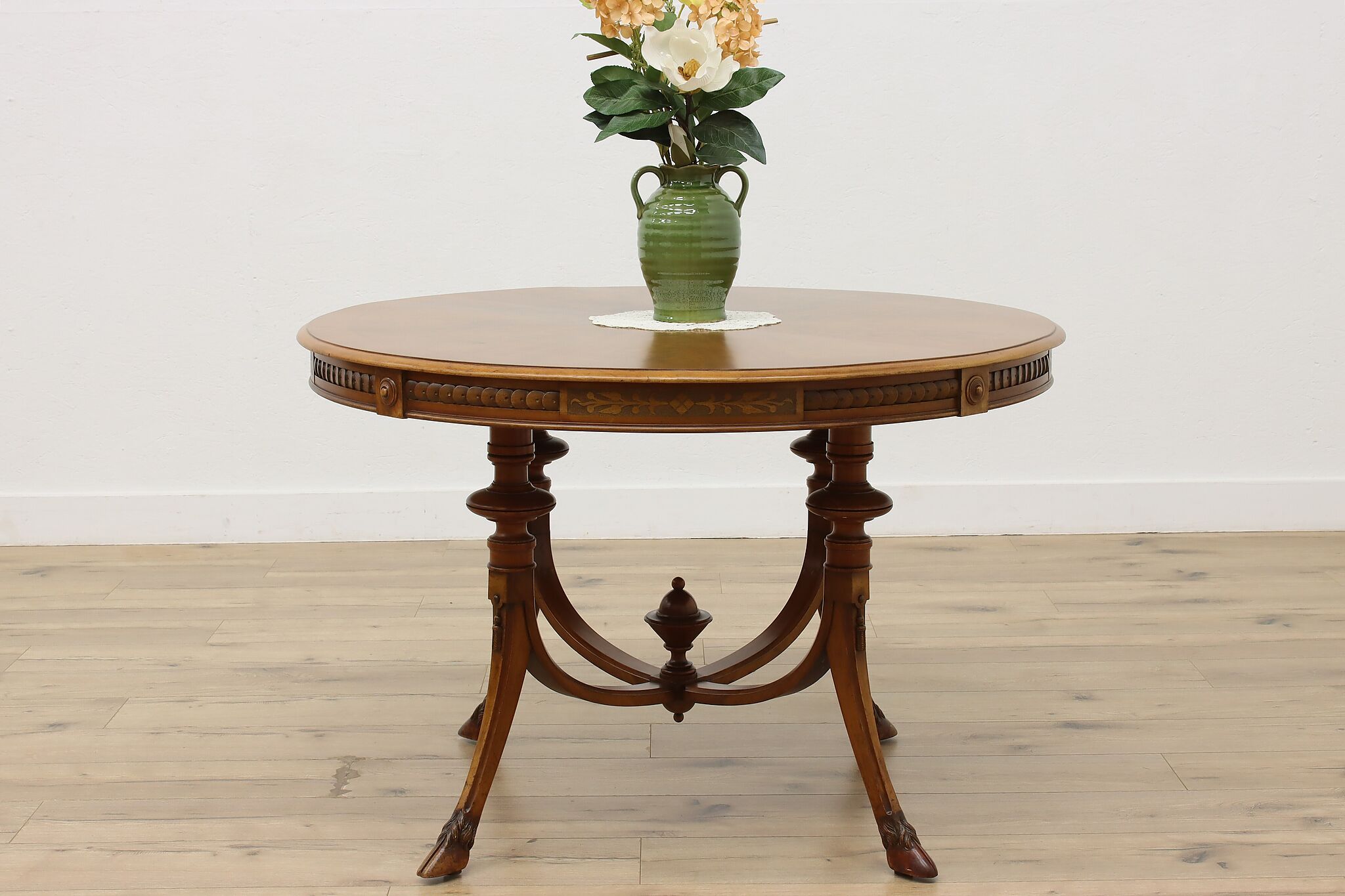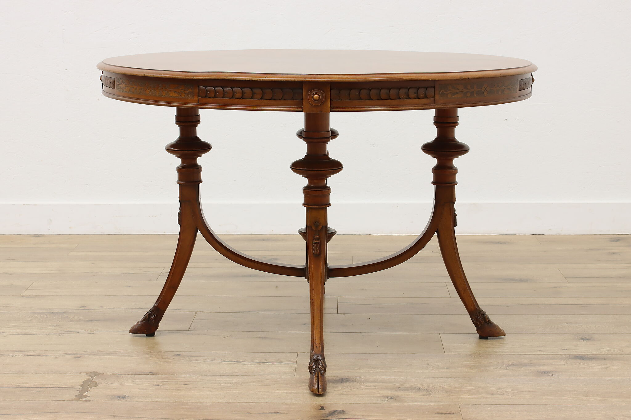 Looking for a unique table to add to your entryway or breakfast nook? This classical design round table may be just the piece with its horse hoof feet and "sunburst" top!