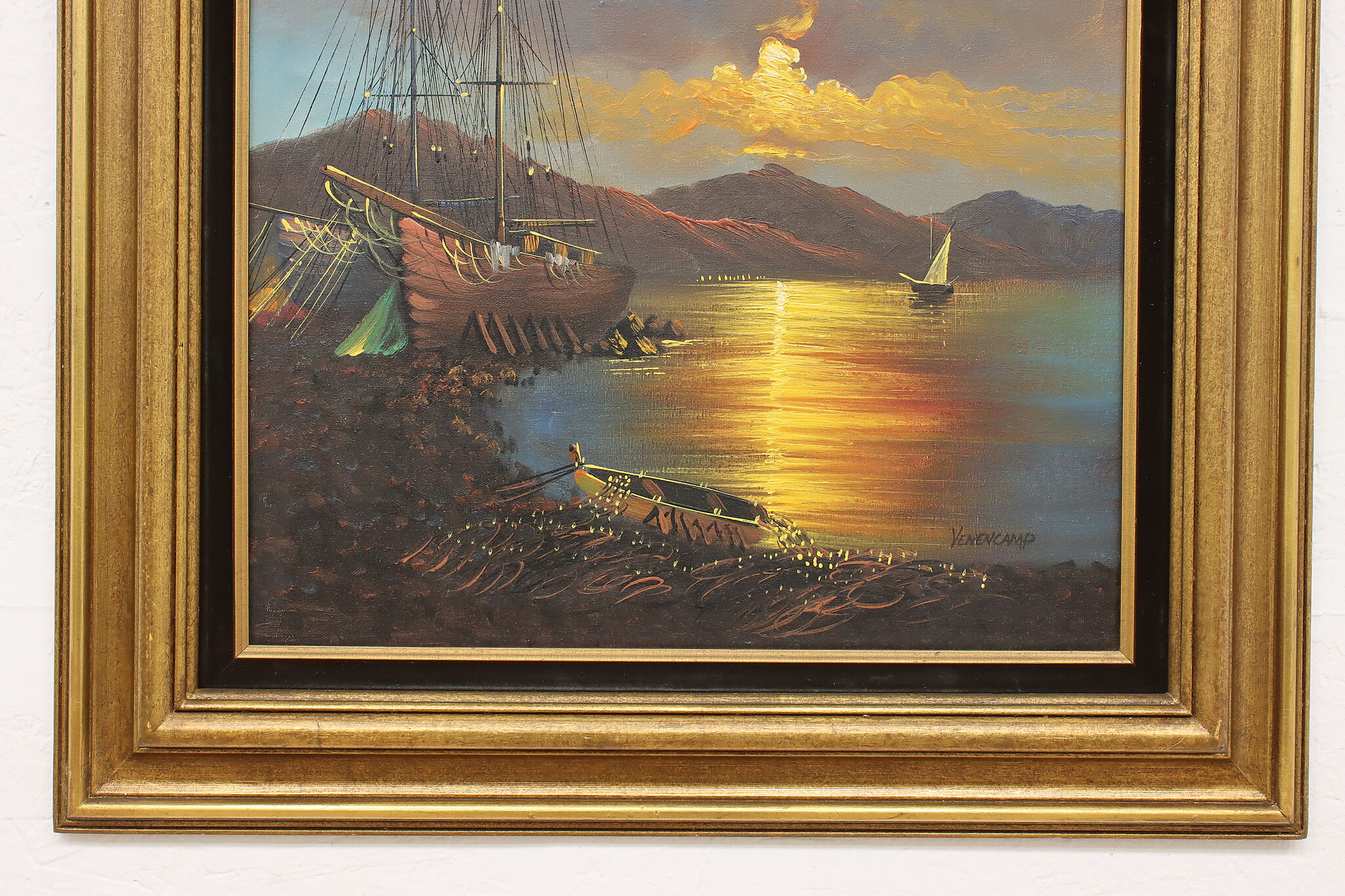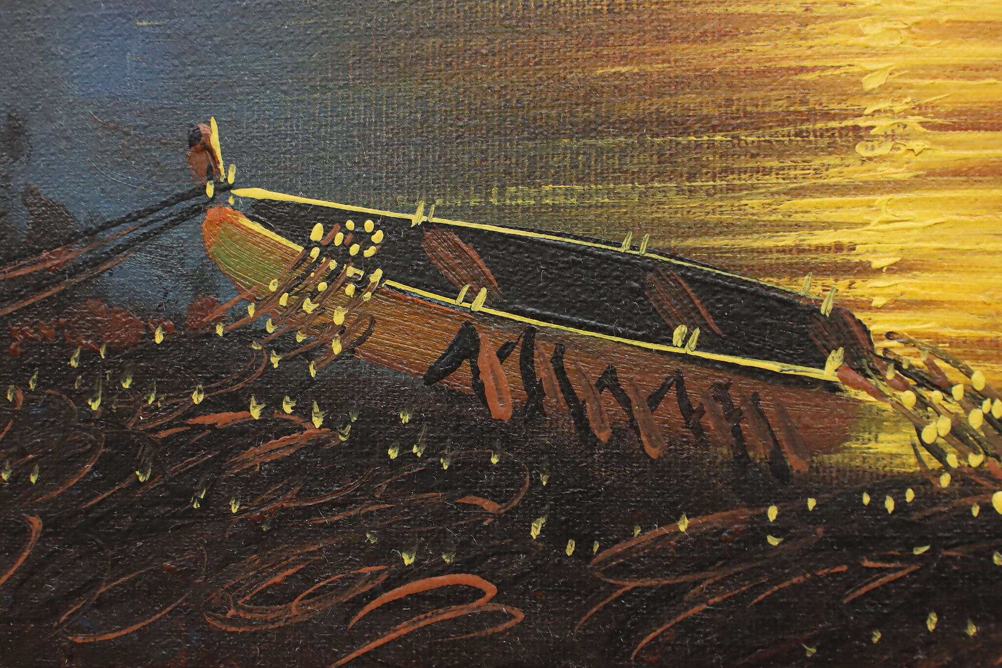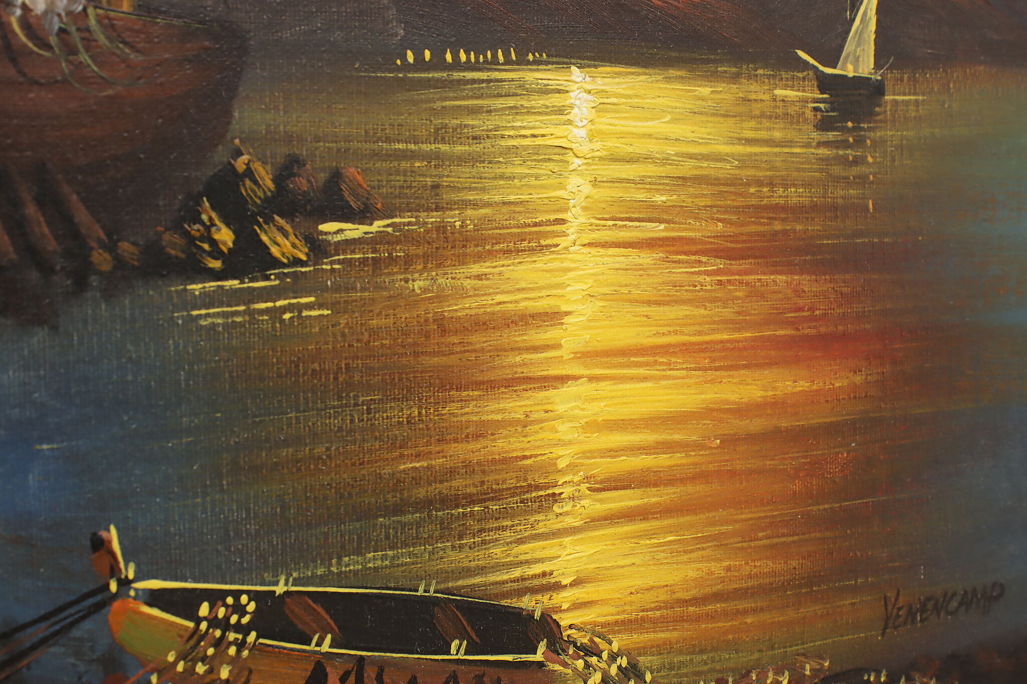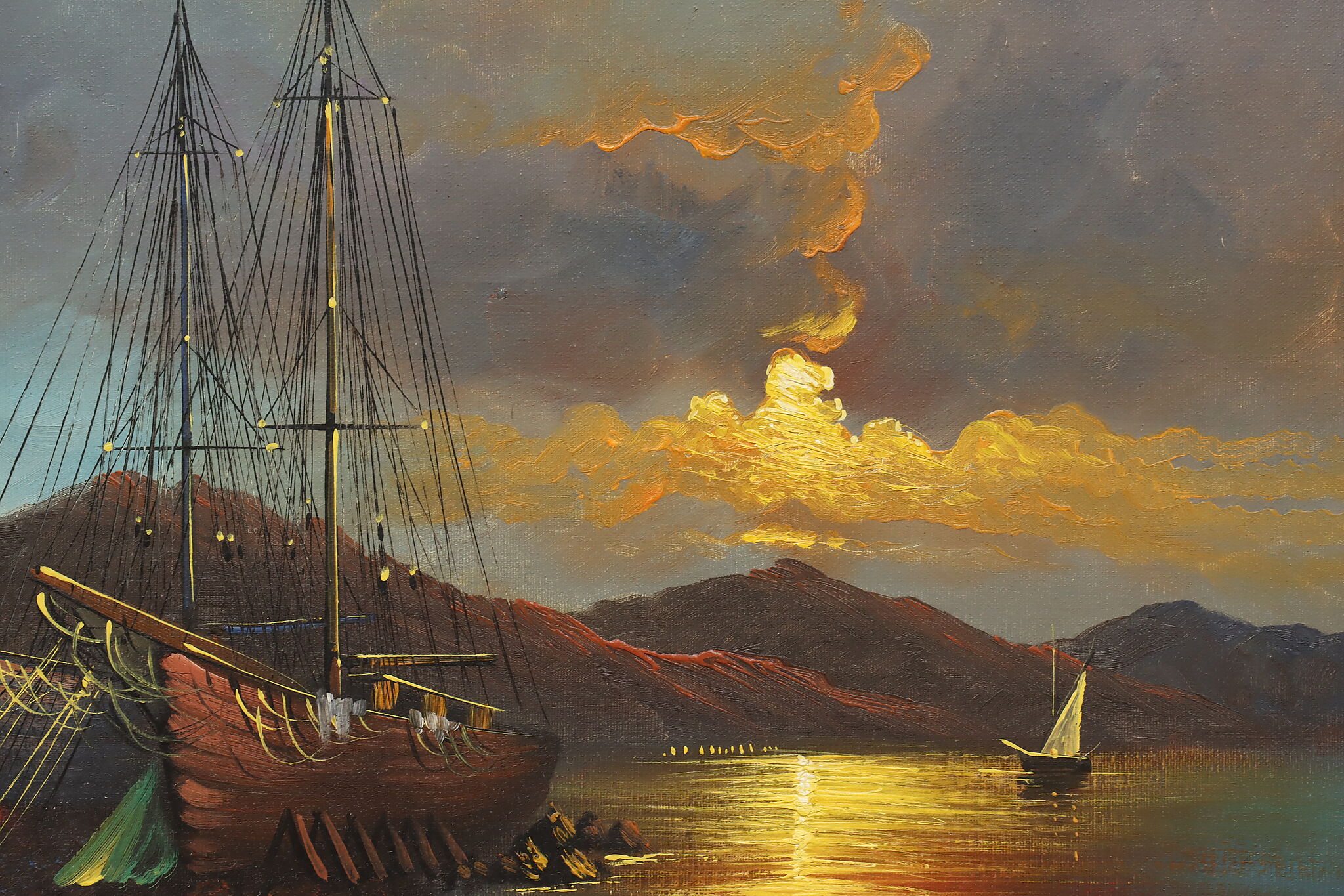 The spotlight of this painting is the gorgeously painted sunset over the harbor with its vivid orange and yellow colors.