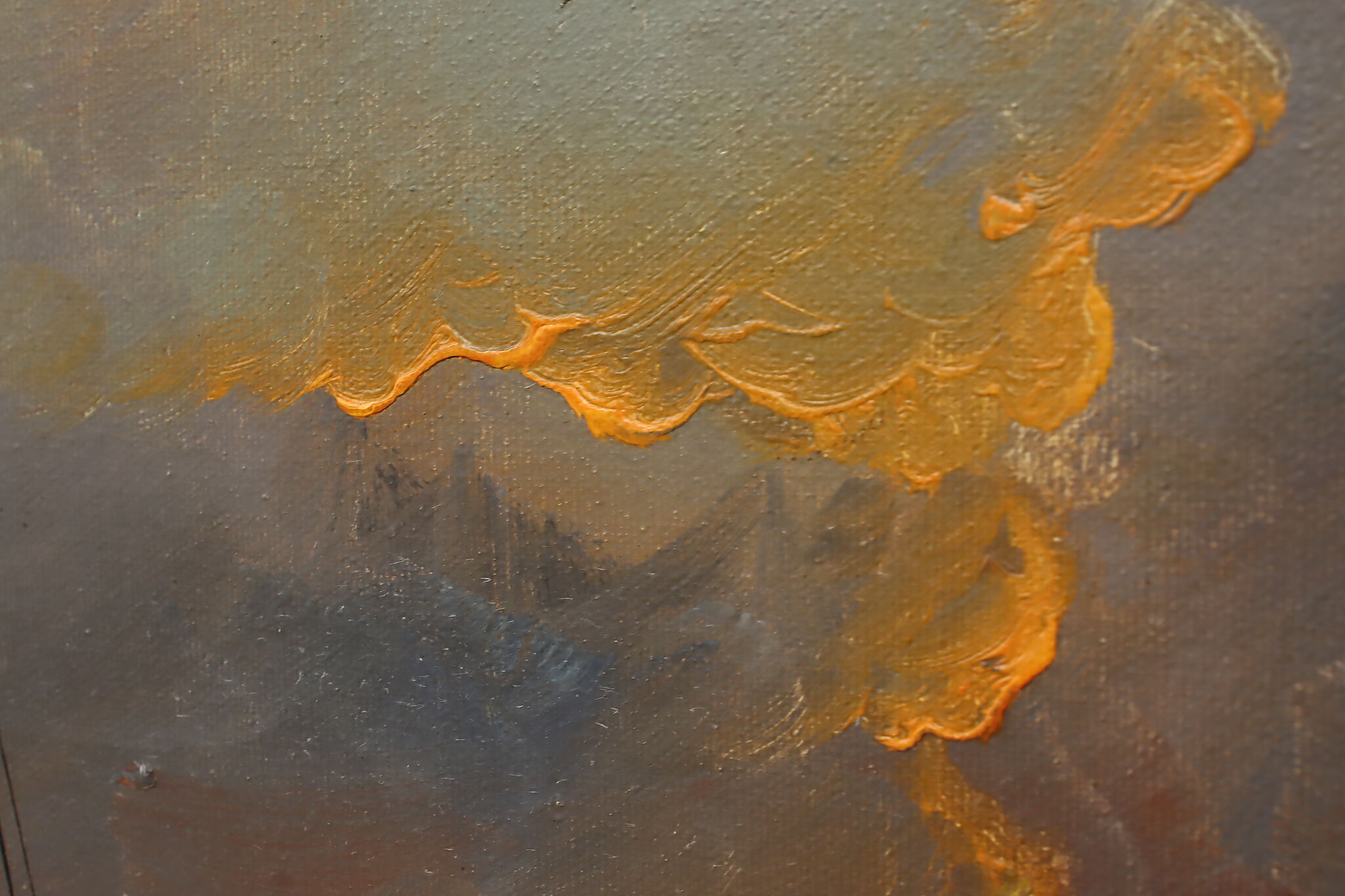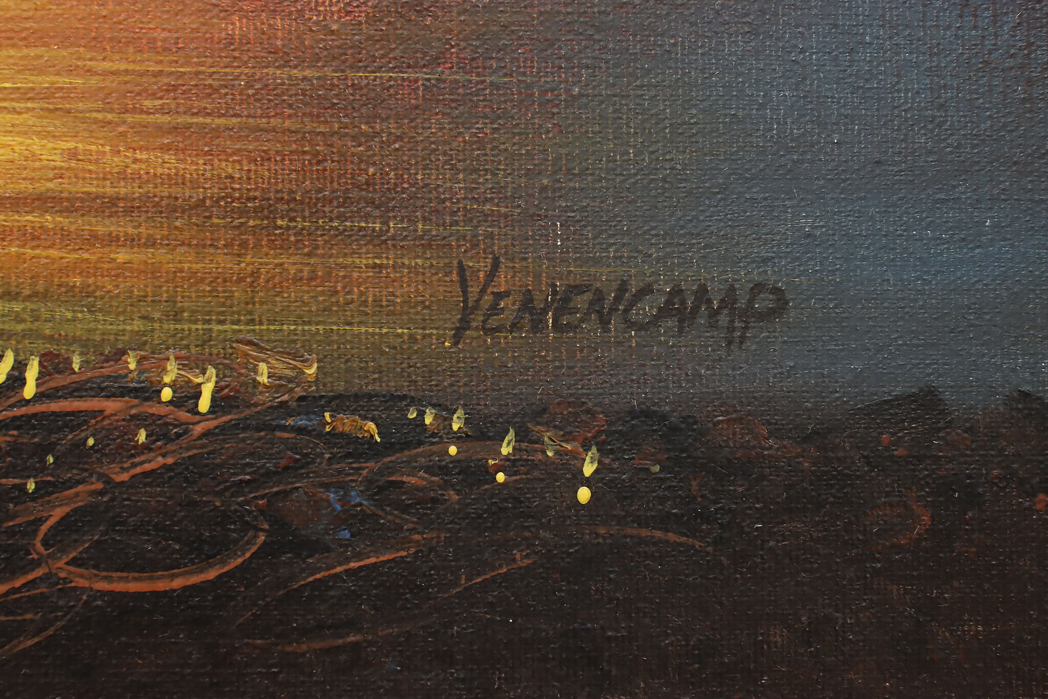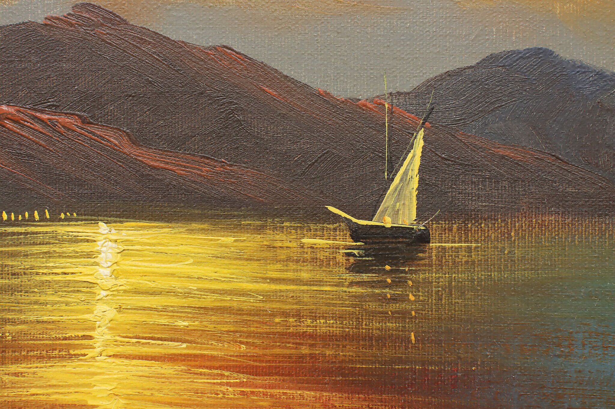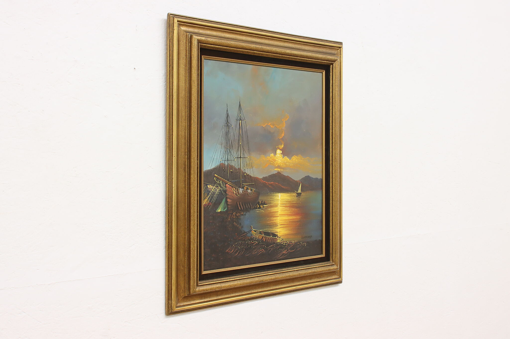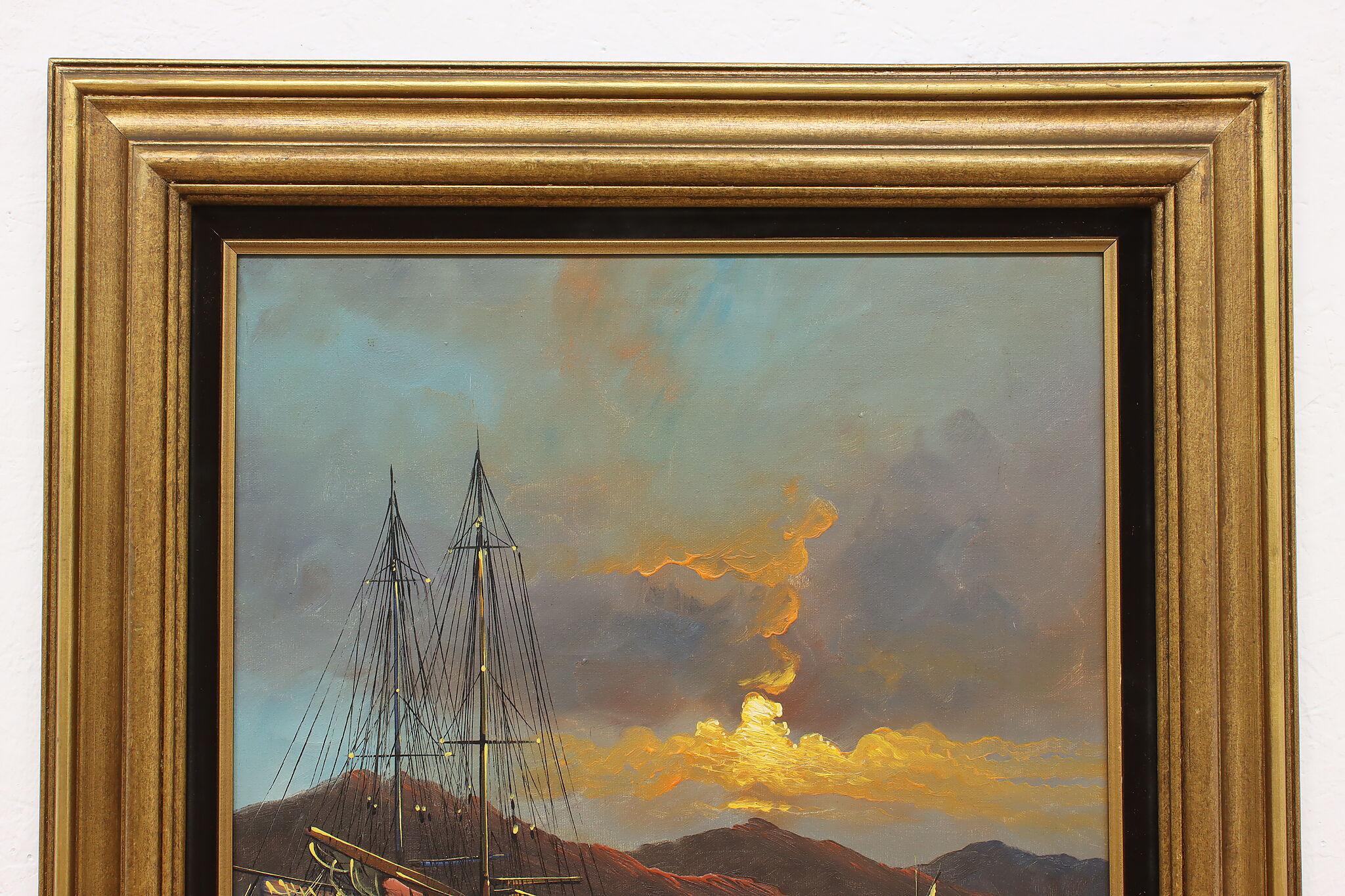The spotlight of this painting is the gorgeously painted sunset over the harbor with its vivid orange and yellow colors.