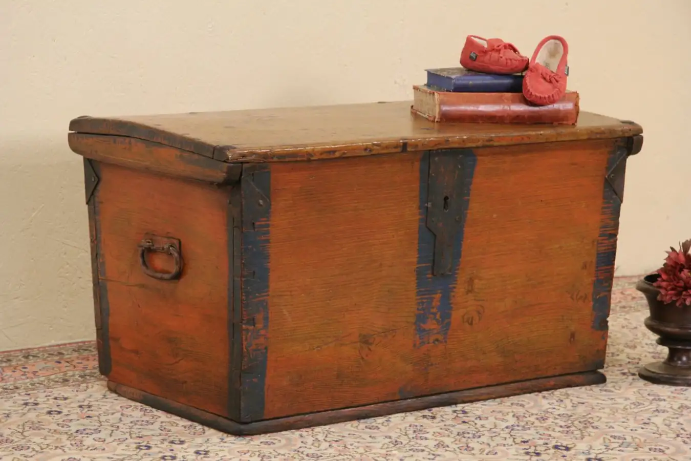 The carpenter's expertise is shown by wooden pegs instead of nails and hand cut corner dovetail joints. There is a wonderful hand wrought iron lock that still works with the key, but we have removed it because it locks automatically when the lid is closed. It is included and can be reattached if desired. Wrought iron hinges are also original.