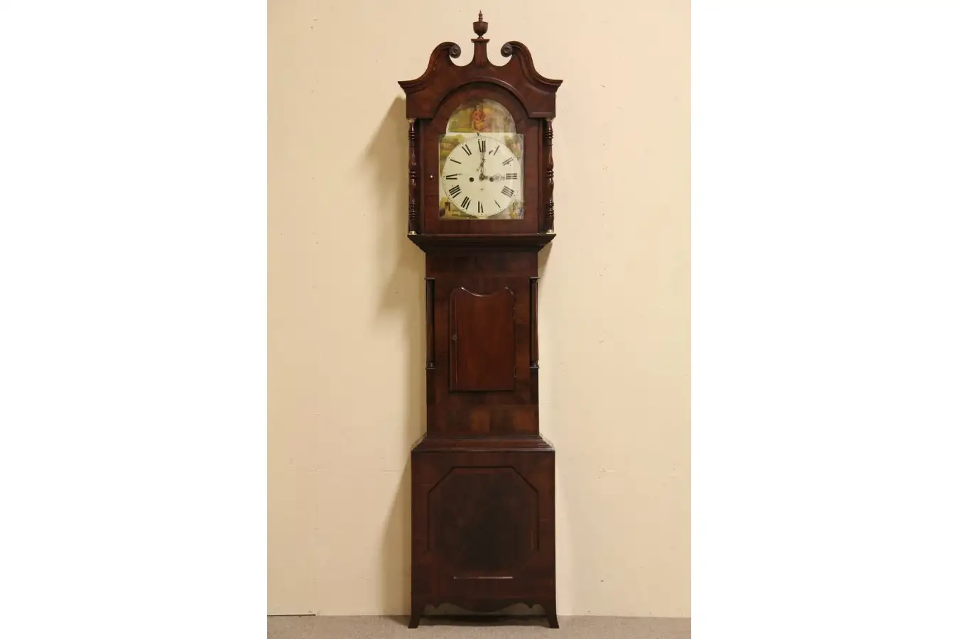 Hand made of mahogany, the case has a wonderful old hand rubbed finish with warm antique patina. In the base is an octagonal panel with beautiful flame grain. Square nails are visible on the pine backside. There is old wavy glass in the door, turned columns have brass capitals. Original hand painting on the iron dial depicts a prophet or poet in a bucolic setting with sheep and a local castle in charming ruins.