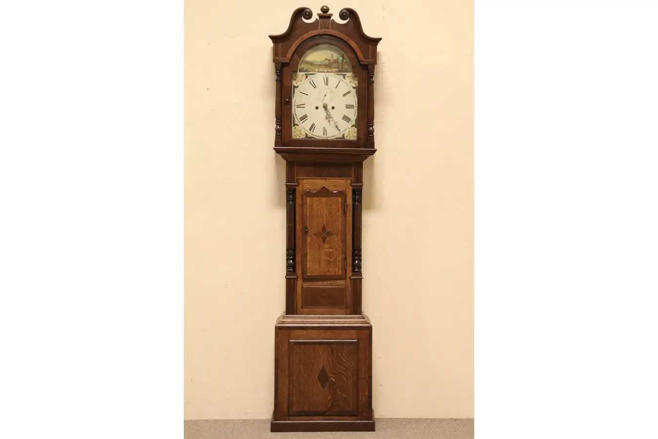Stately and elegant in a English country manor, a tall case or grandfather clock dates from about 1800. The exquisite case is quarter sawn oak, inlaid with rosewood, mahogany and satinwood, the old finish is very well preserved and has warm antique patina.