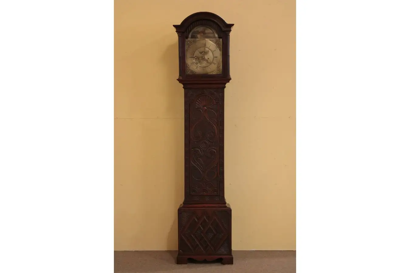 This wonderful English tall case or grandfather clock dates from the early 1800's, and has a carved oak case with traditional Celtic designs.