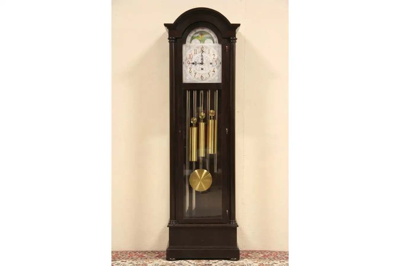 Tattered original instructions are included with this historic hall furniture. Measurements of this historic clock are 23" wide, 14" deep and 77 1/2" tall.