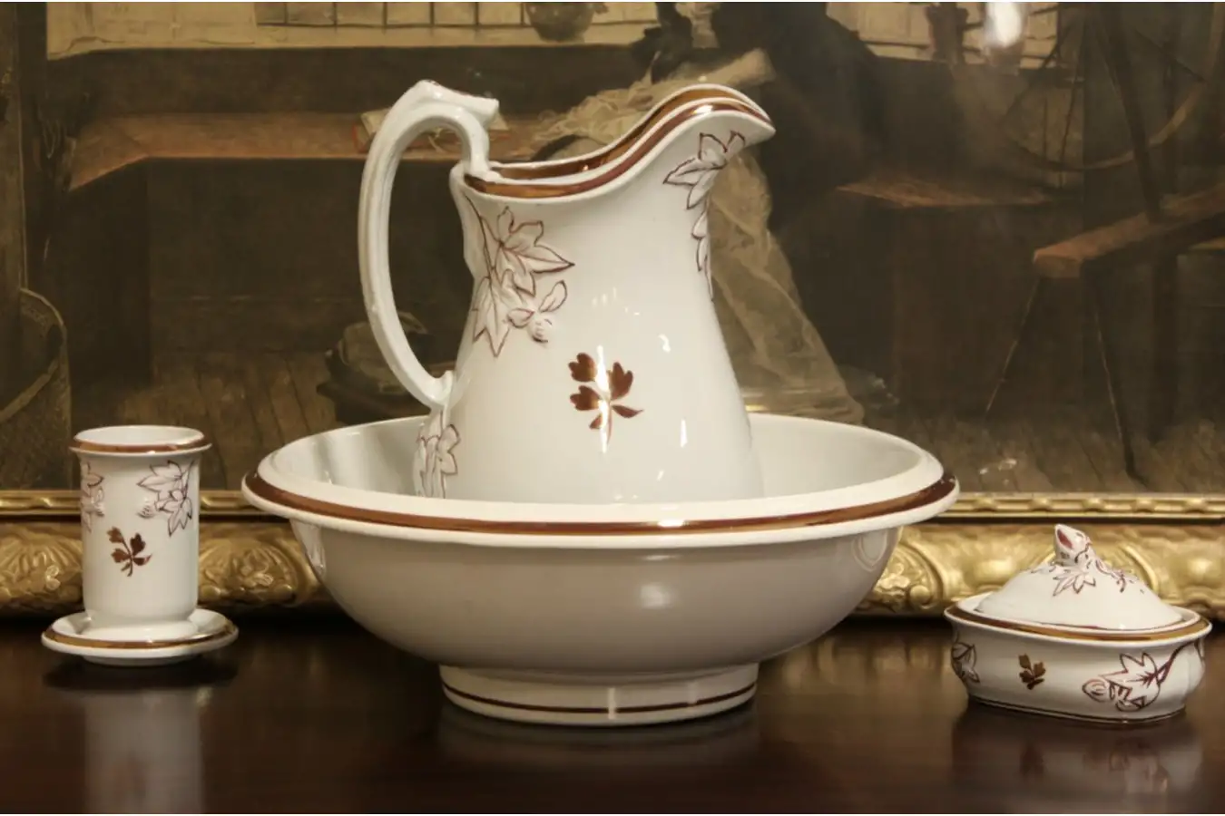 An 1870's era bowl and pitcher set in the famous Tea Leaf pattern is signed "Ironstone Davenport" and includes a toothbrush holder and soap dish.