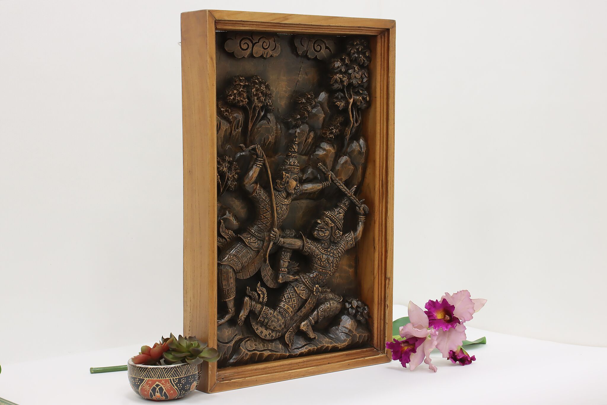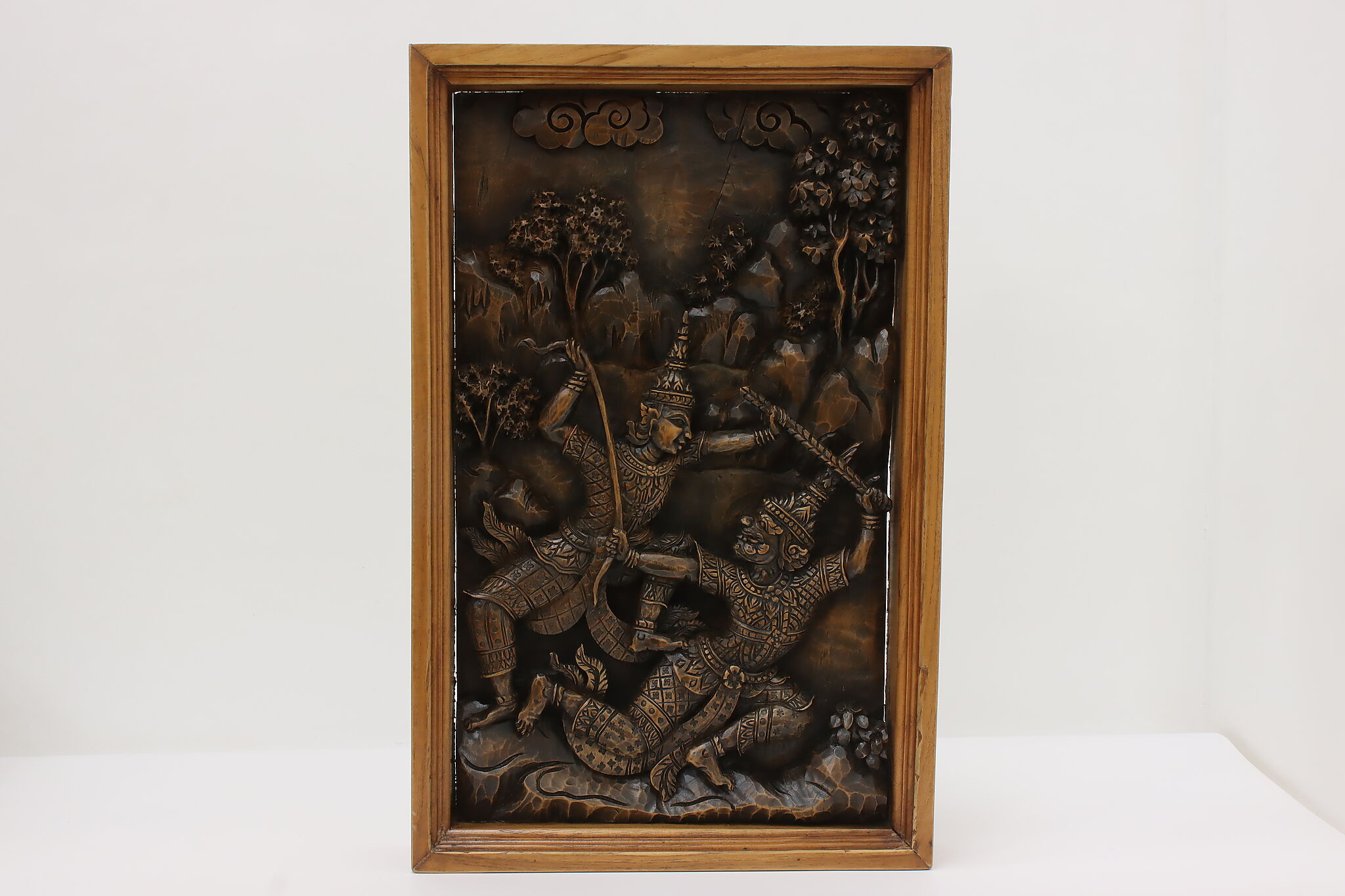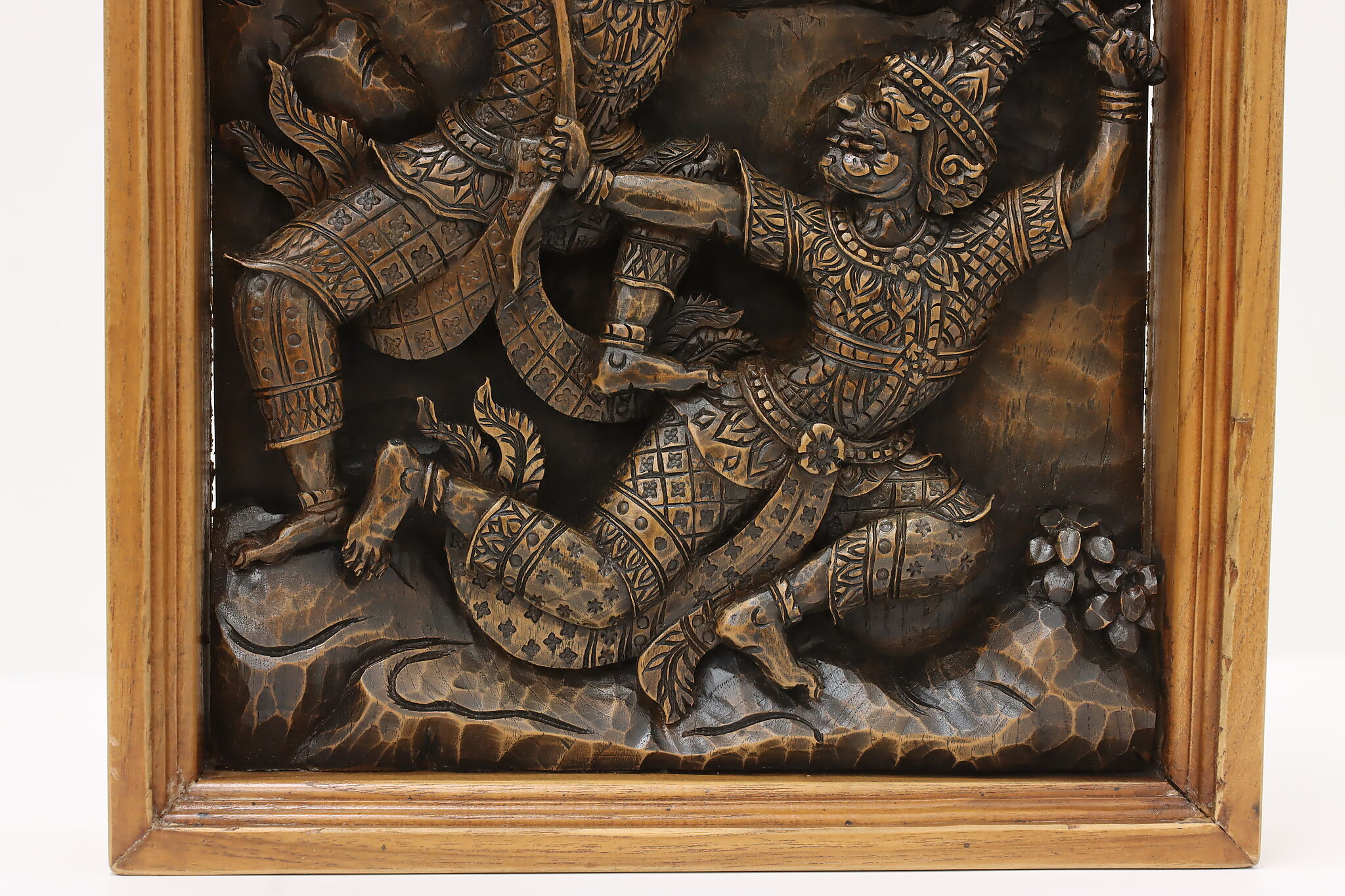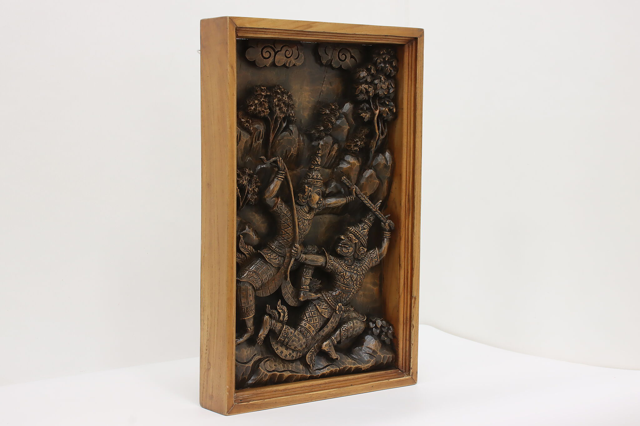 This wall hanging plaque depicts a fantastically detailed battle between a god and demon.