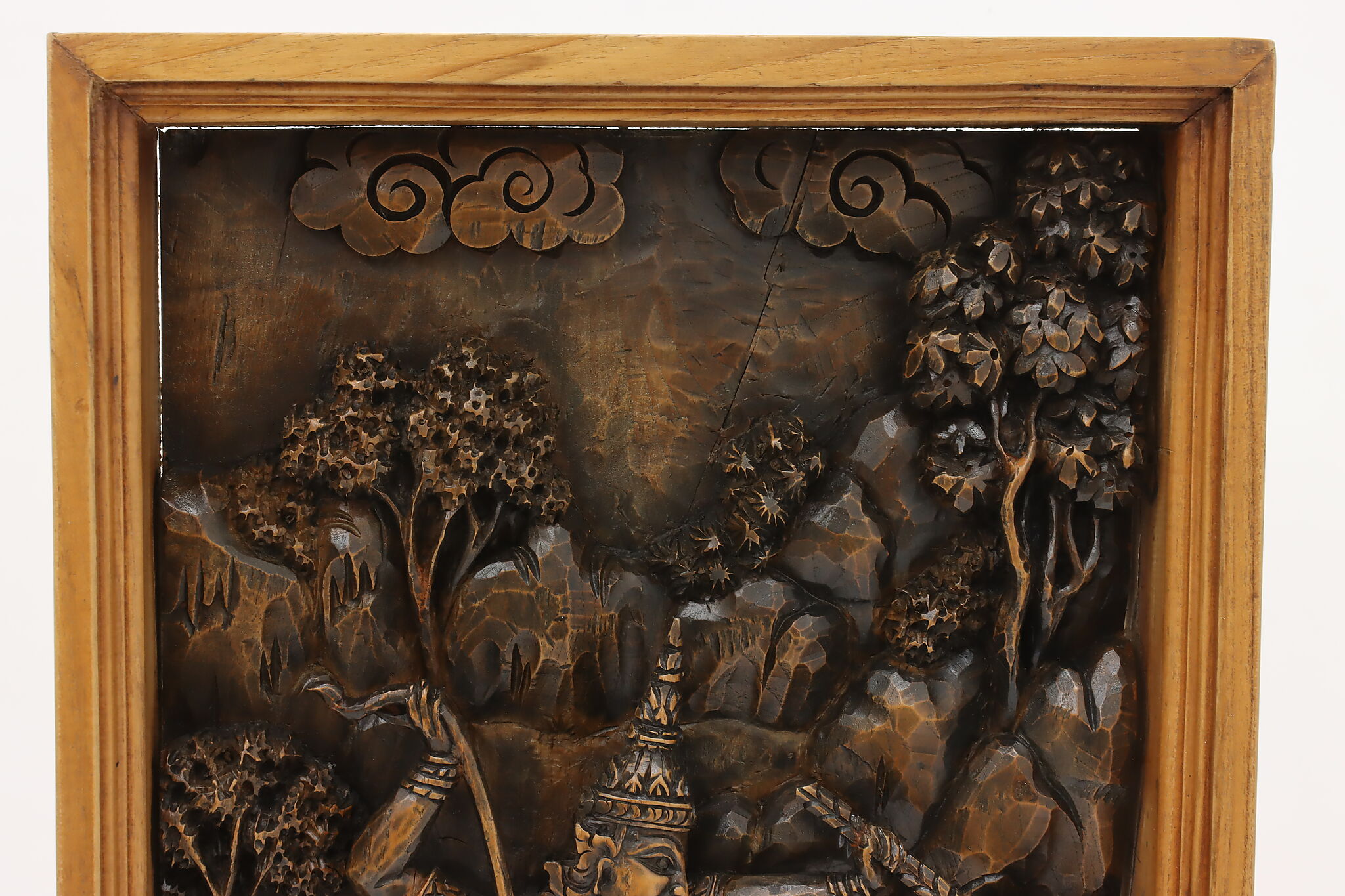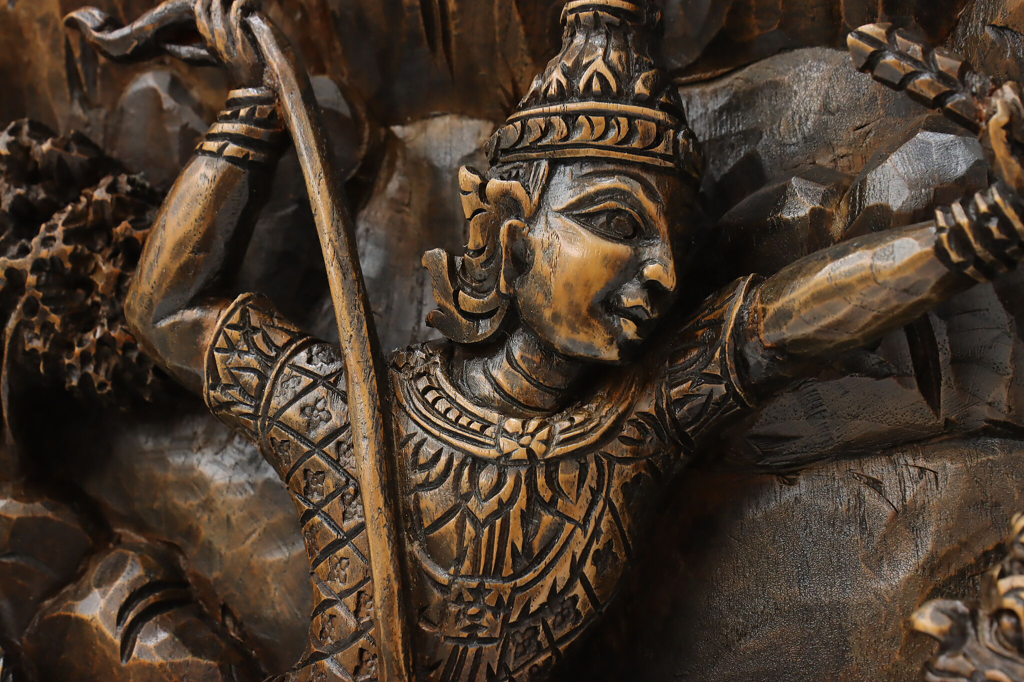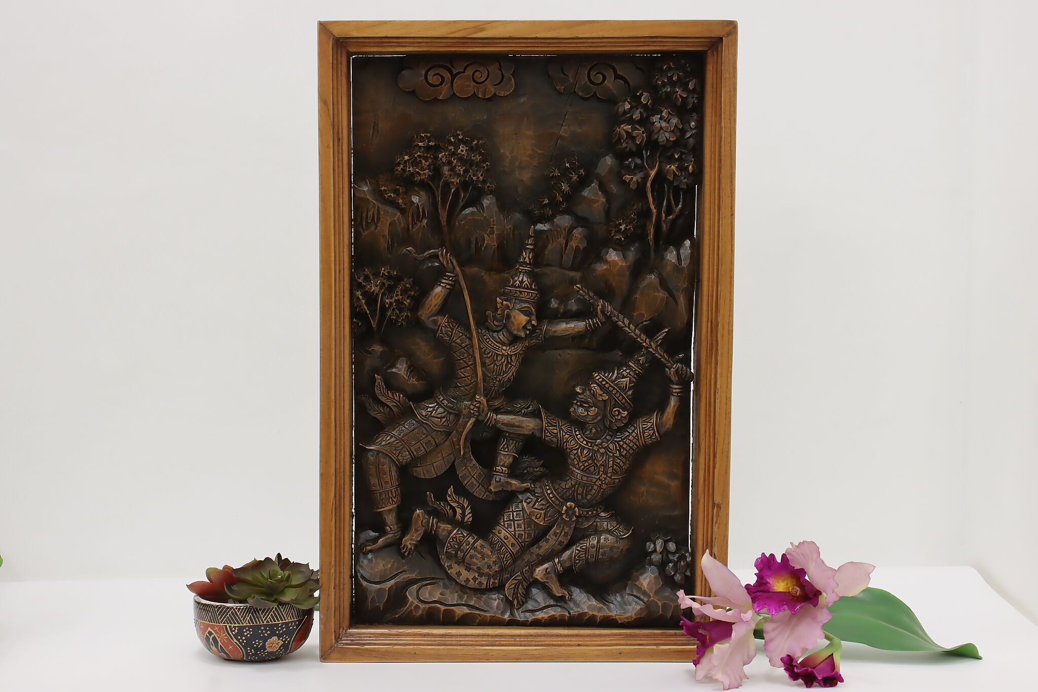 This wall hanging plaque depicts a fantastically detailed battle between a god and demon.