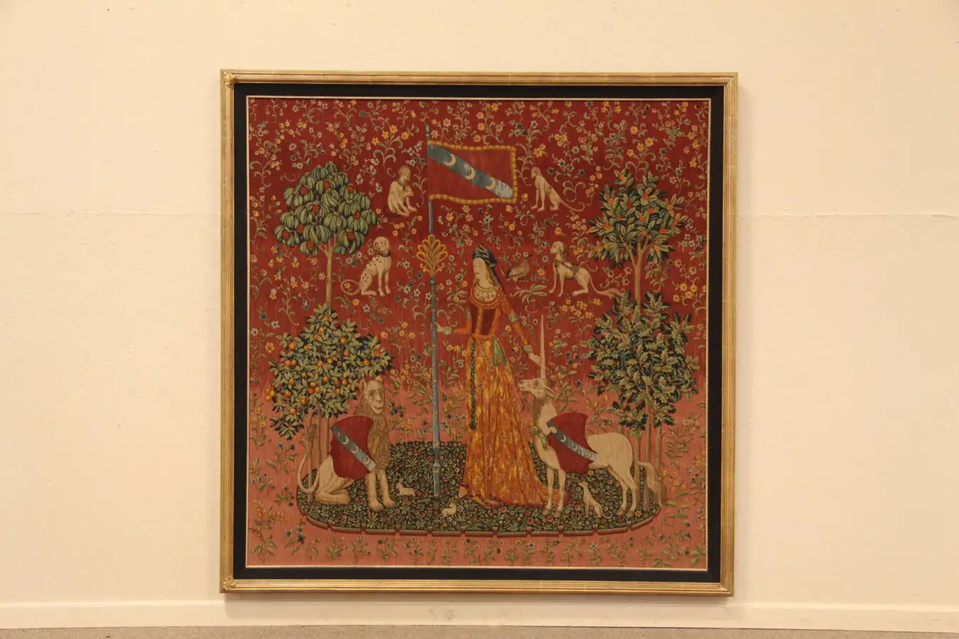 A stunning tapestry is a modern replica of the world famous Lady and the Unicorn in Paris, the sense of Touch.