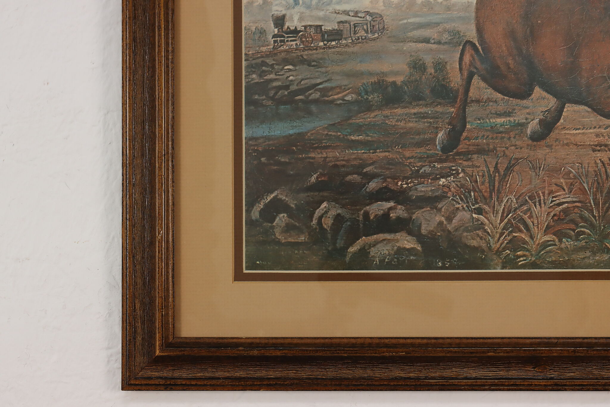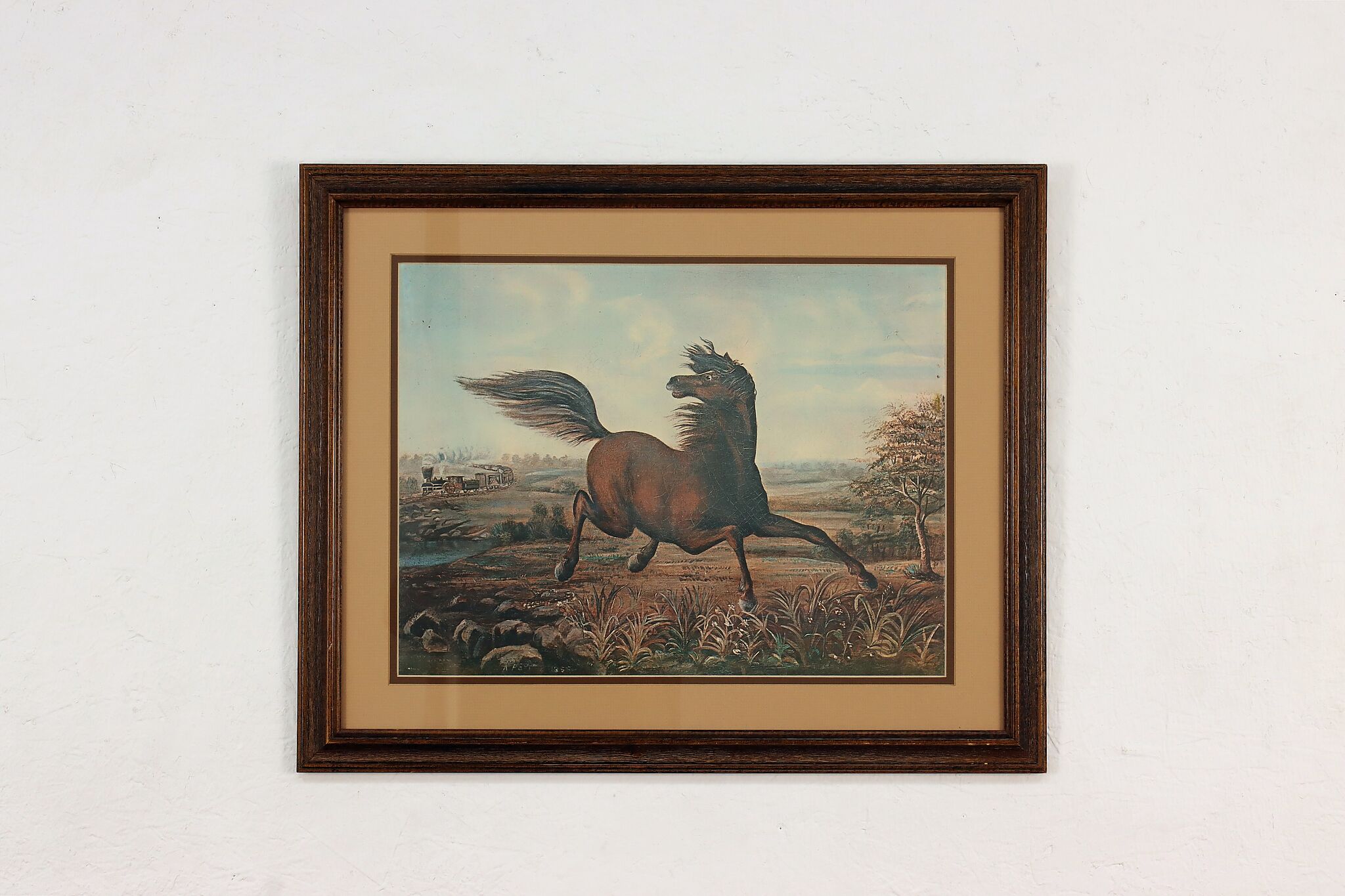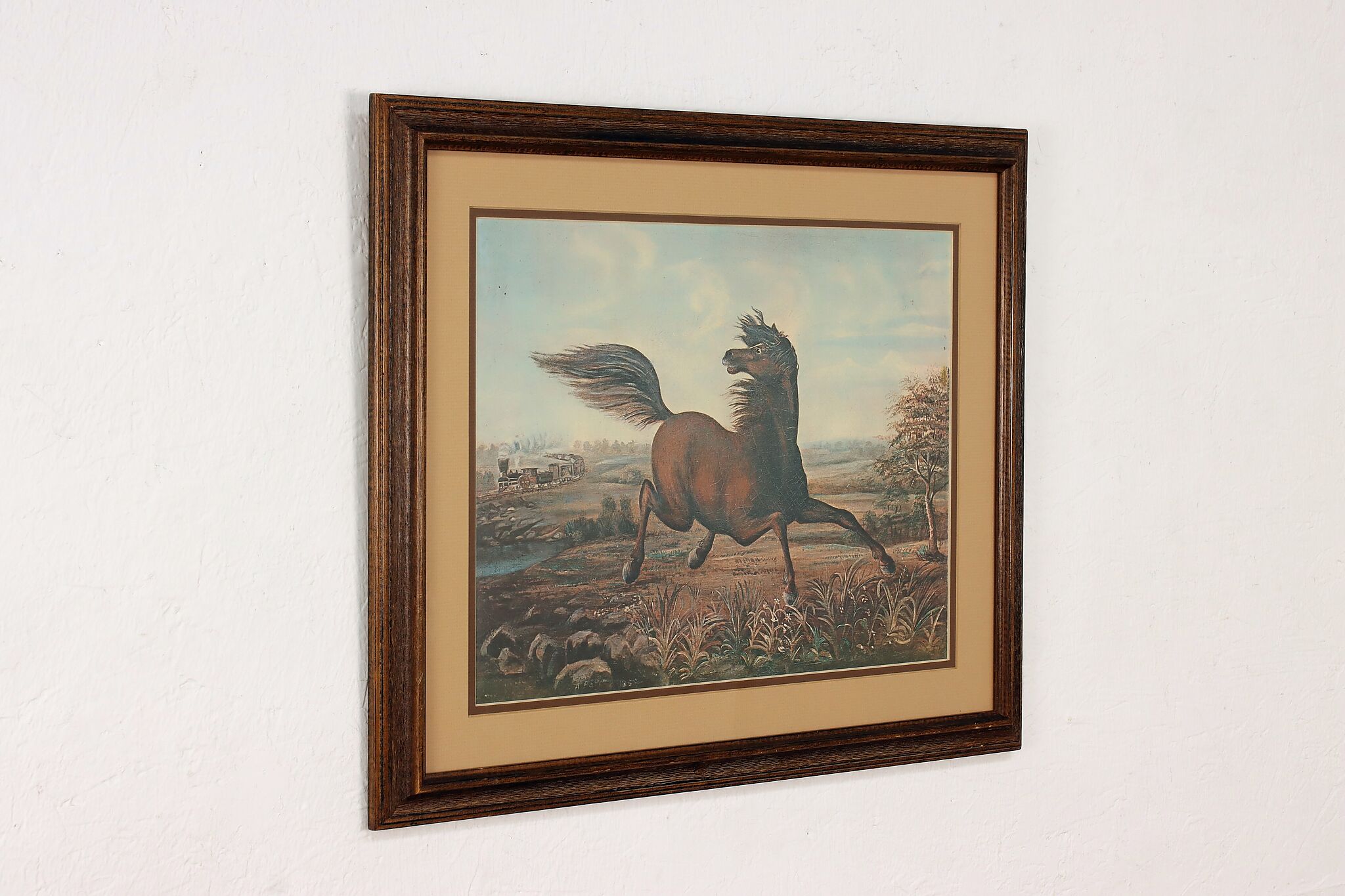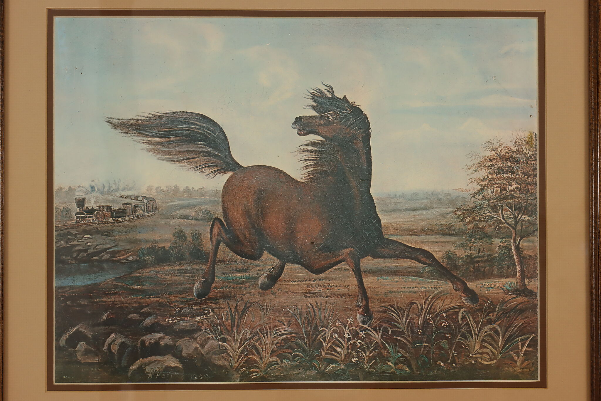 This charming print is after Joseph Anderson Faris's original 1860s painting titled "The Neigh of an Iron Horse", where a wild mustang is spooked by a train.
