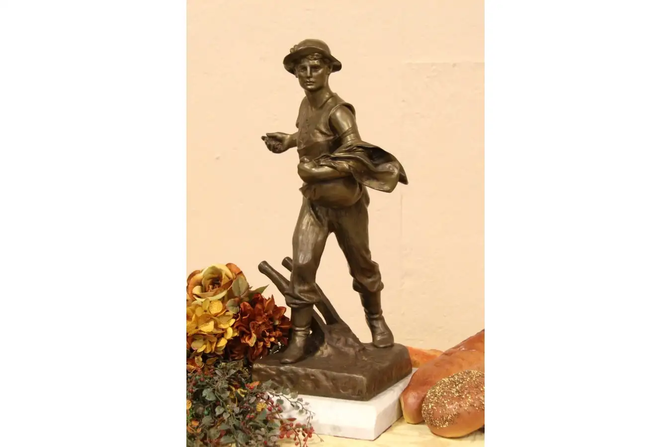 "The Sower," a bronze sculpture of a farmer sowing seeds, is signed by noted artist, "H. Levasseur." A late work by French sculptor, Henri Louis Levasseur (1853-1915), he won the first award at the Paris Salon in 1882. This naturalistic work of art captures the farmer in mid-stride, with his sweeping motion to scatter the seeds.