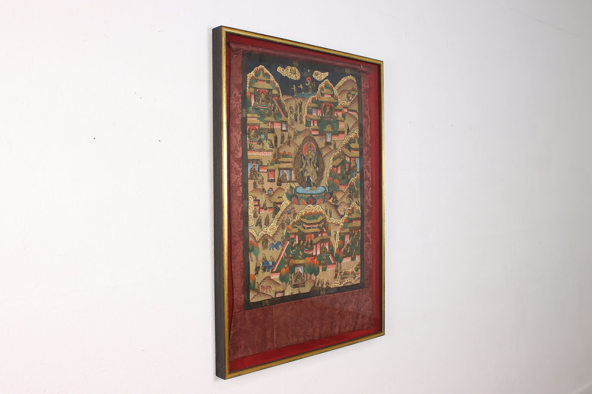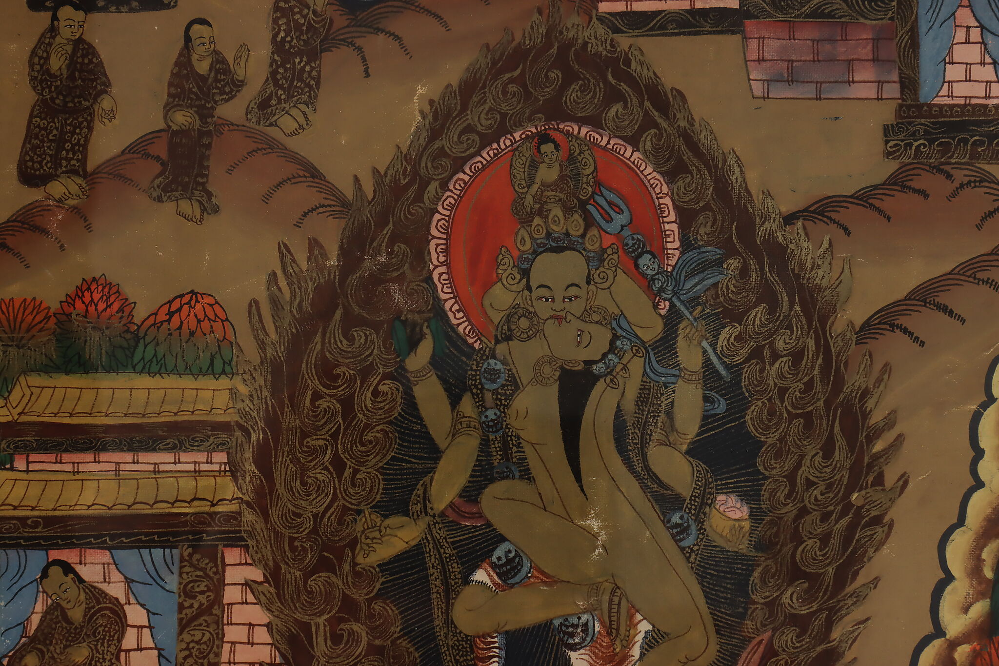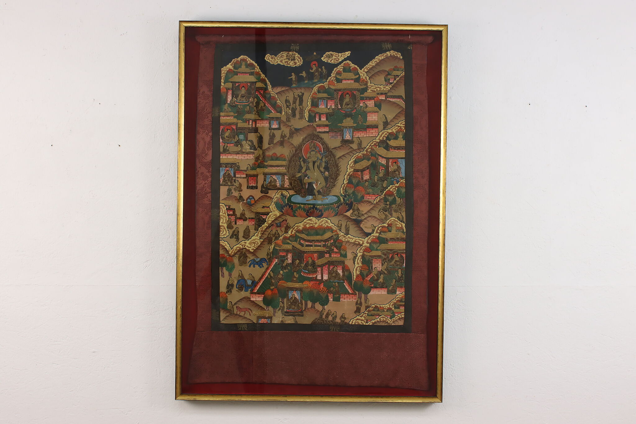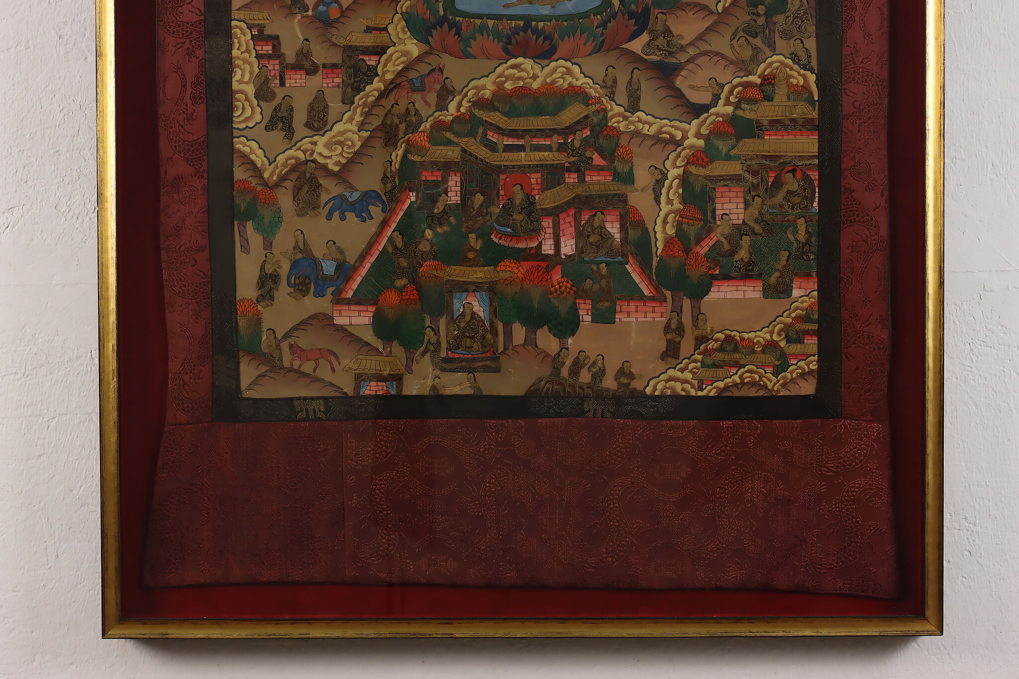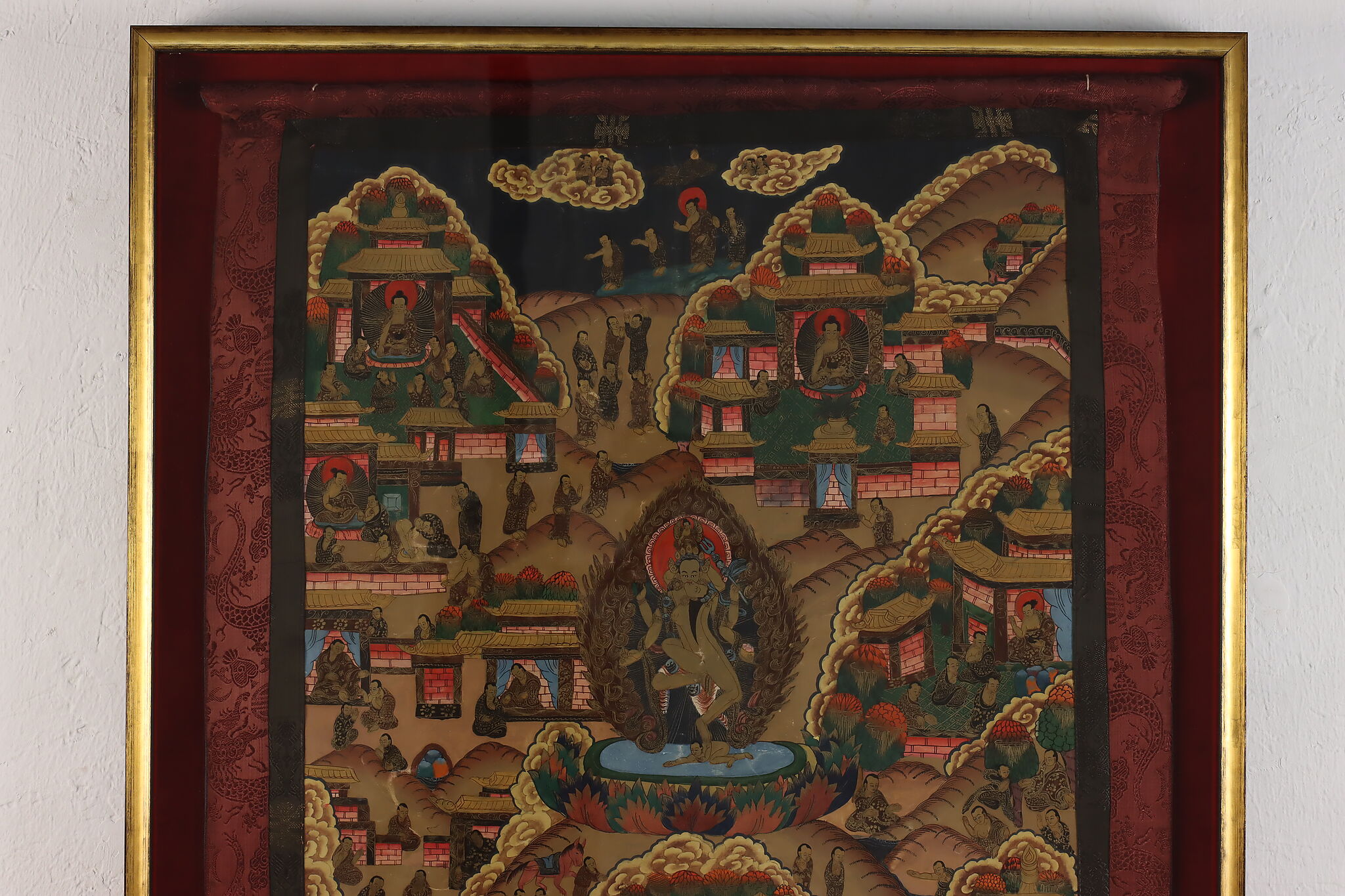 This beautiful framed thangka possibly portrays Kalachakra, a cosmic deity of wisdom and time.