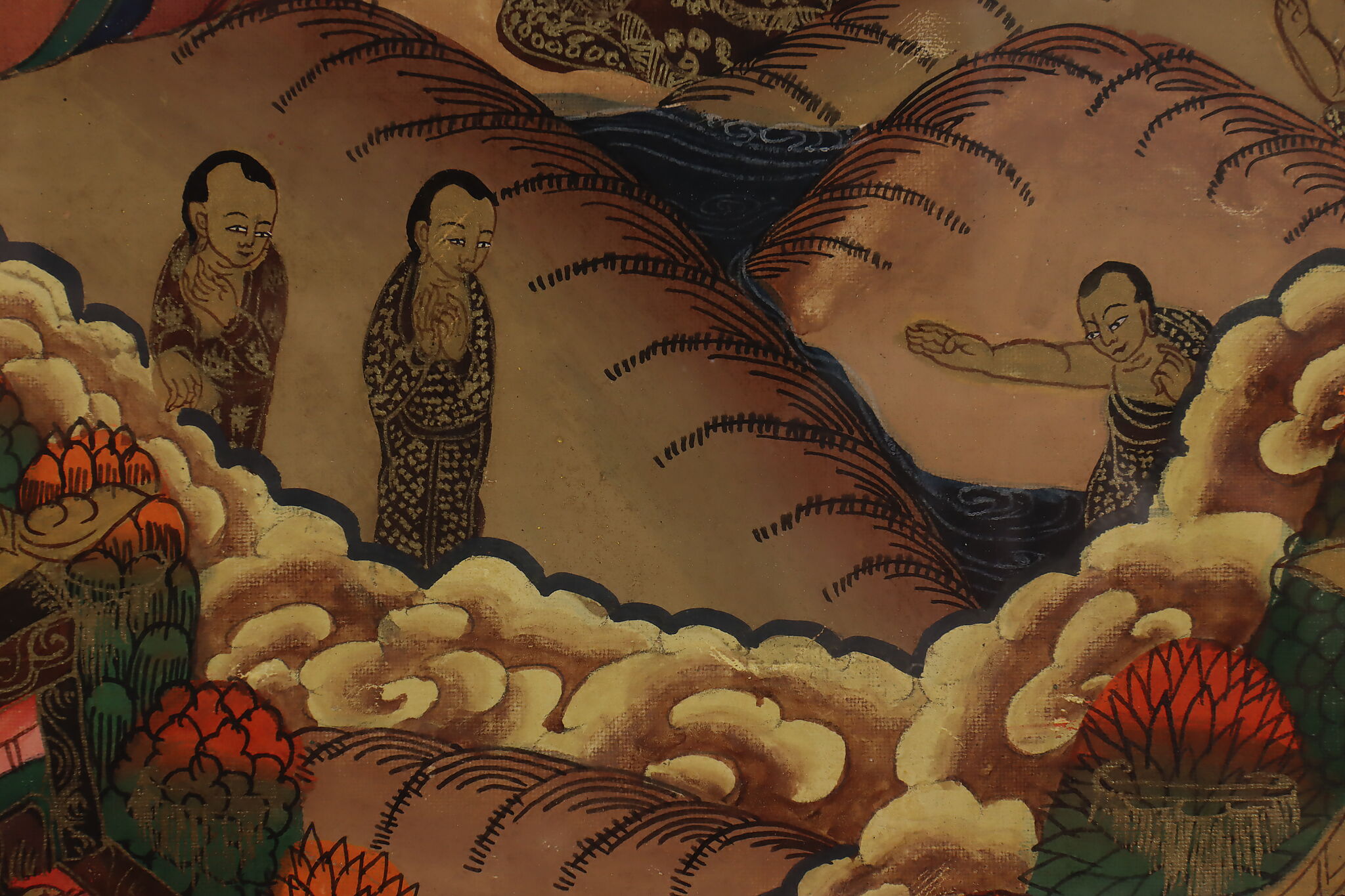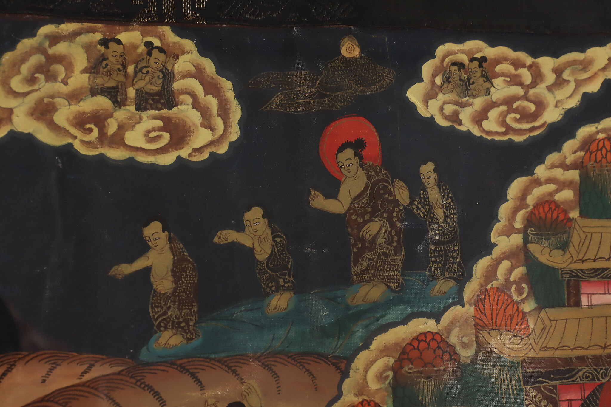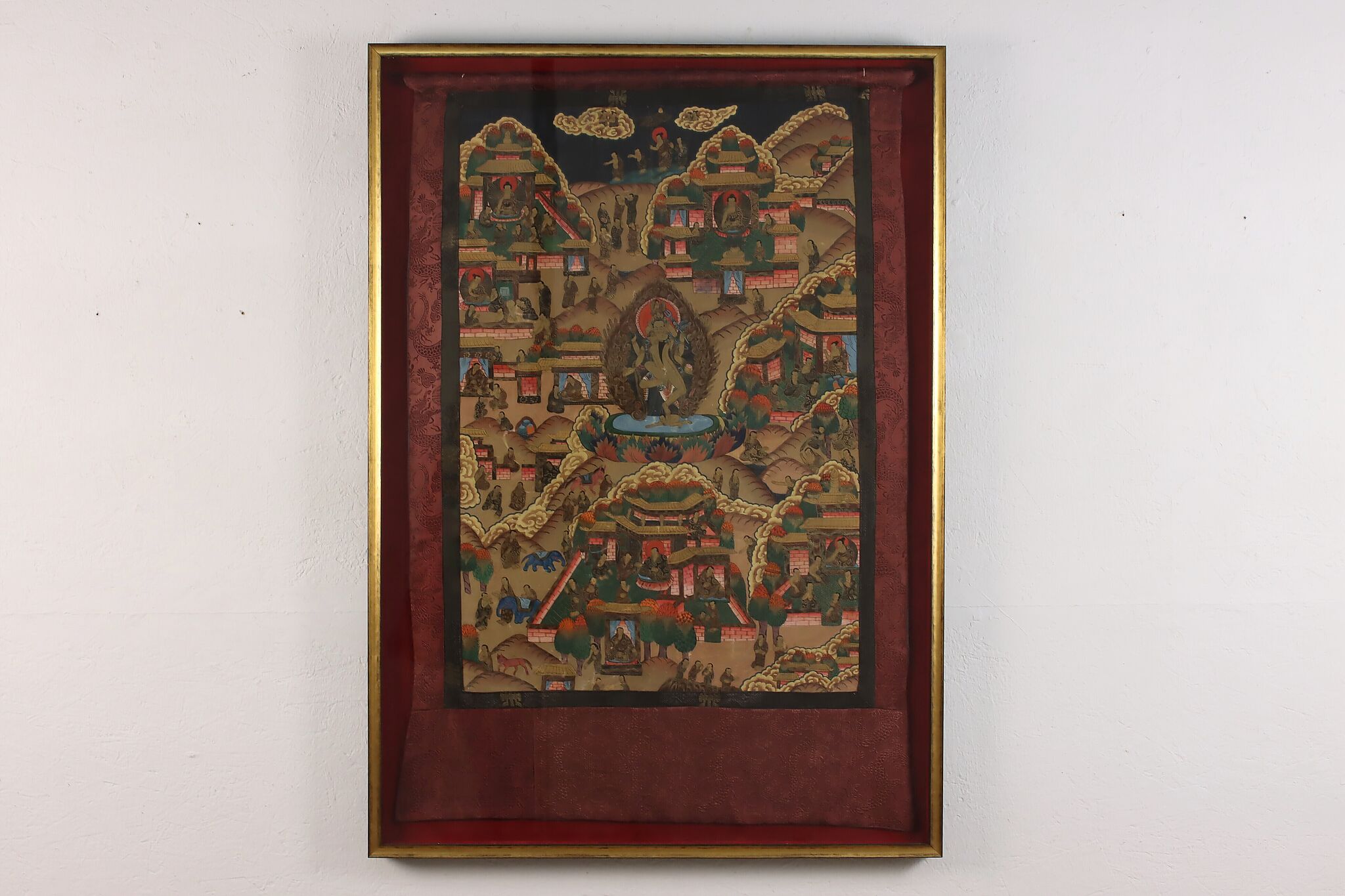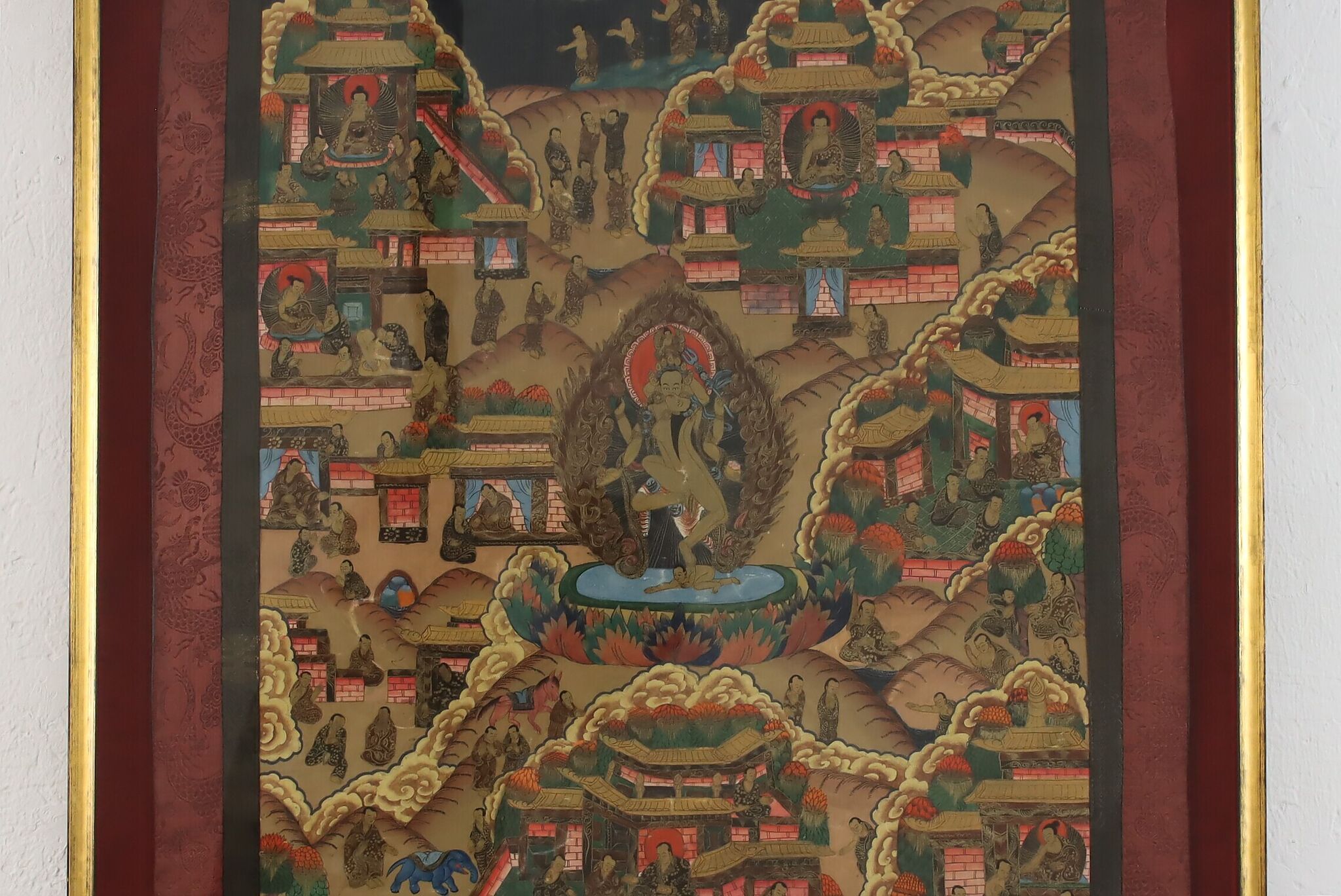 This beautiful framed thangka possibly portrays Kalachakra, a cosmic deity of wisdom and time.
