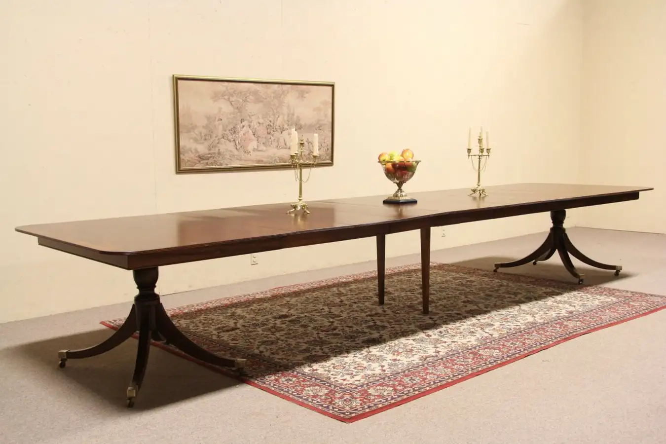 A palace scaled mahogany dining table has inlaid banding and seven leaves, stretching to an amazing 15' 7" long.