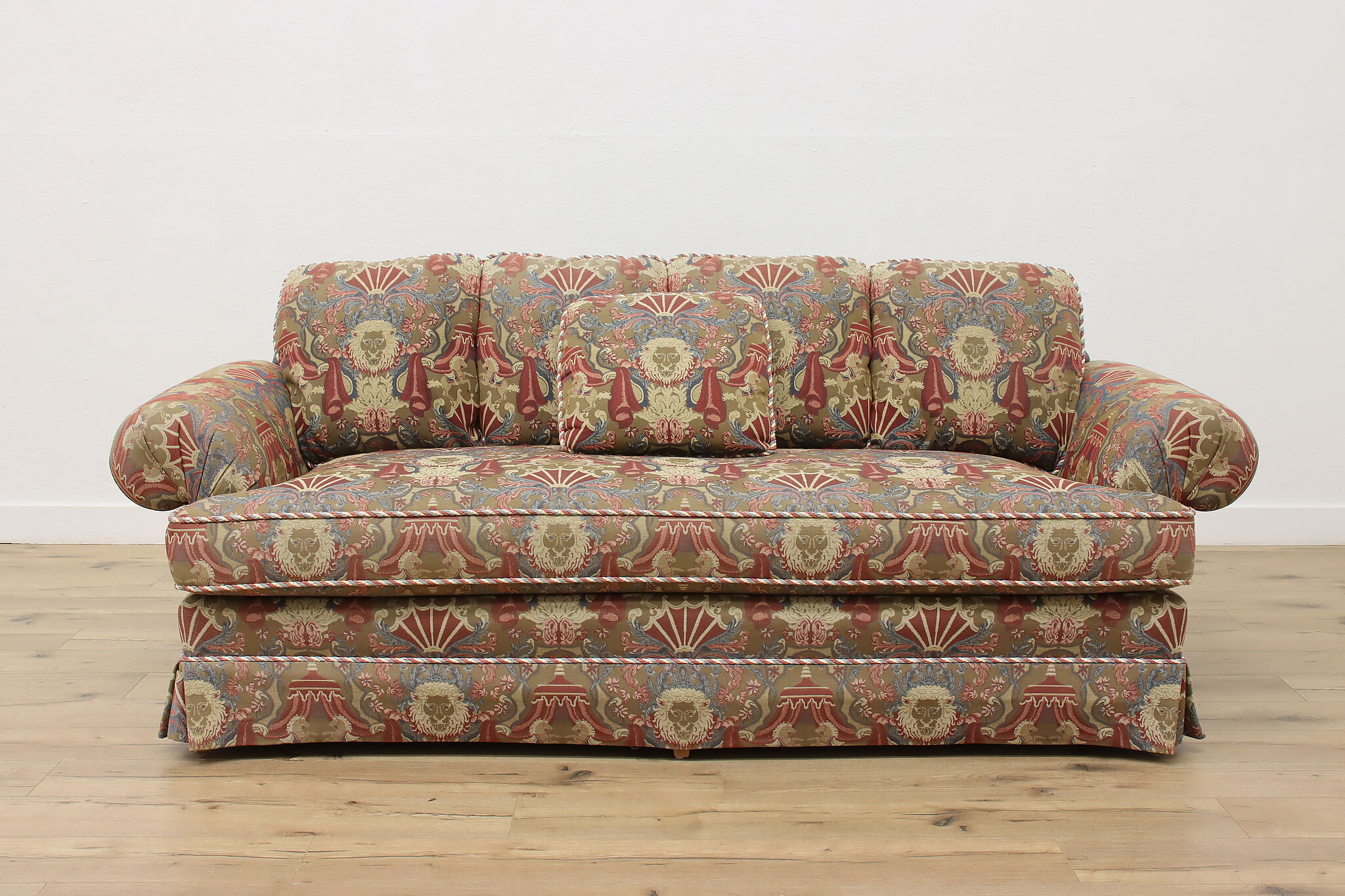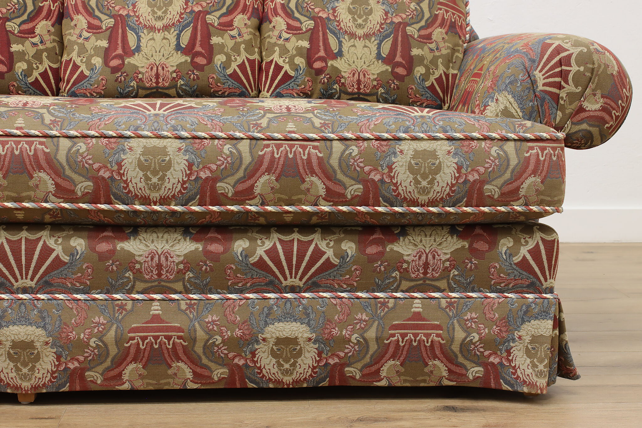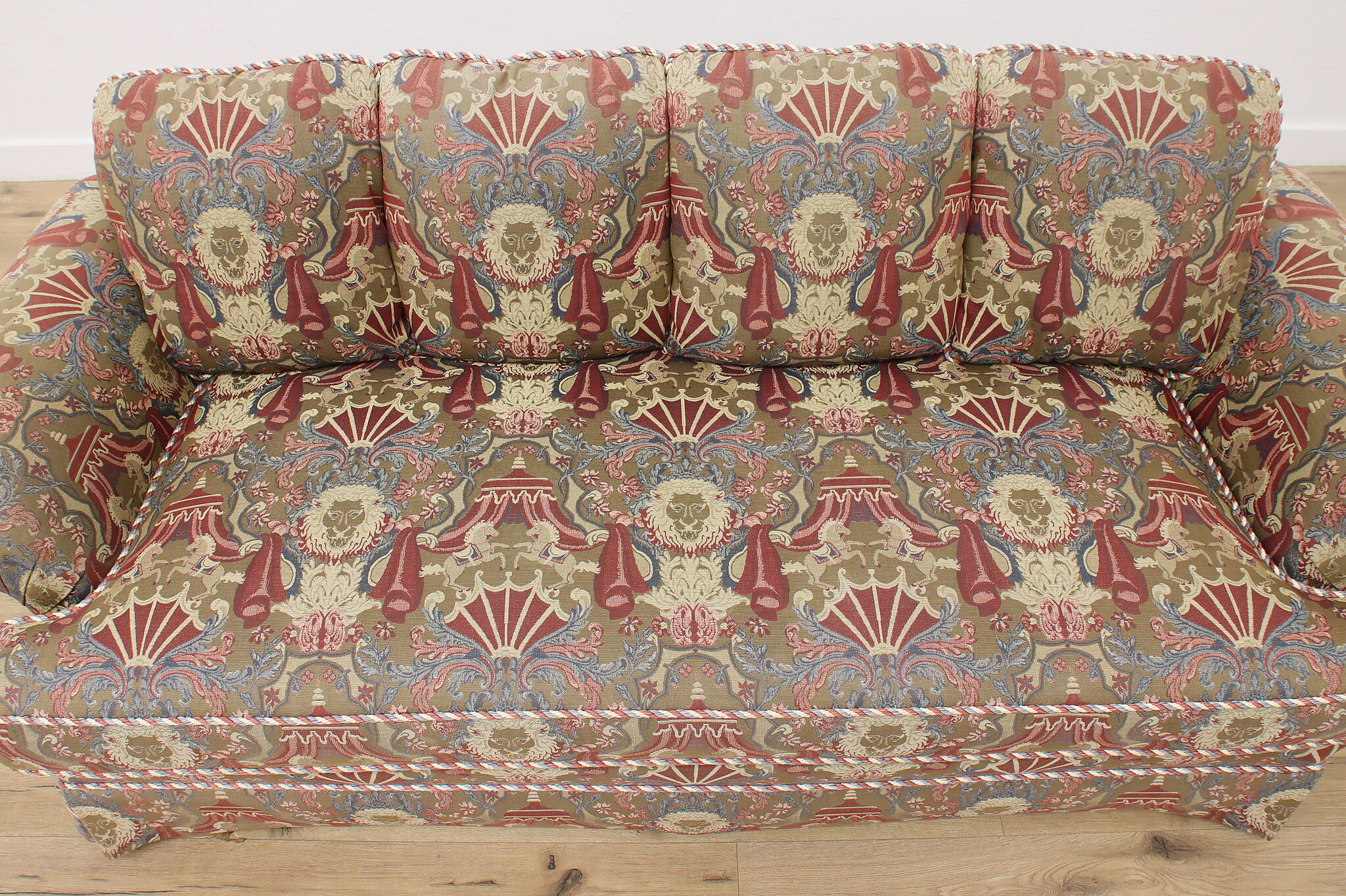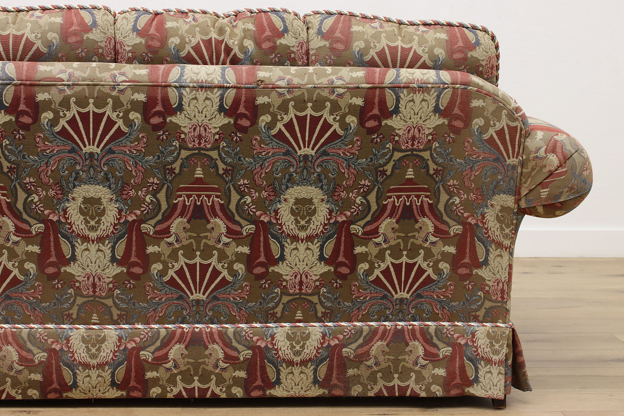 This traditional design sofa or couch has unique upholstery with circus tents, lions, and horses!