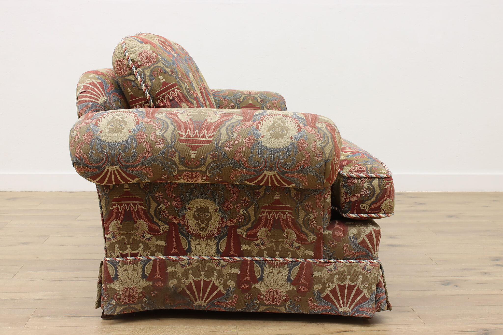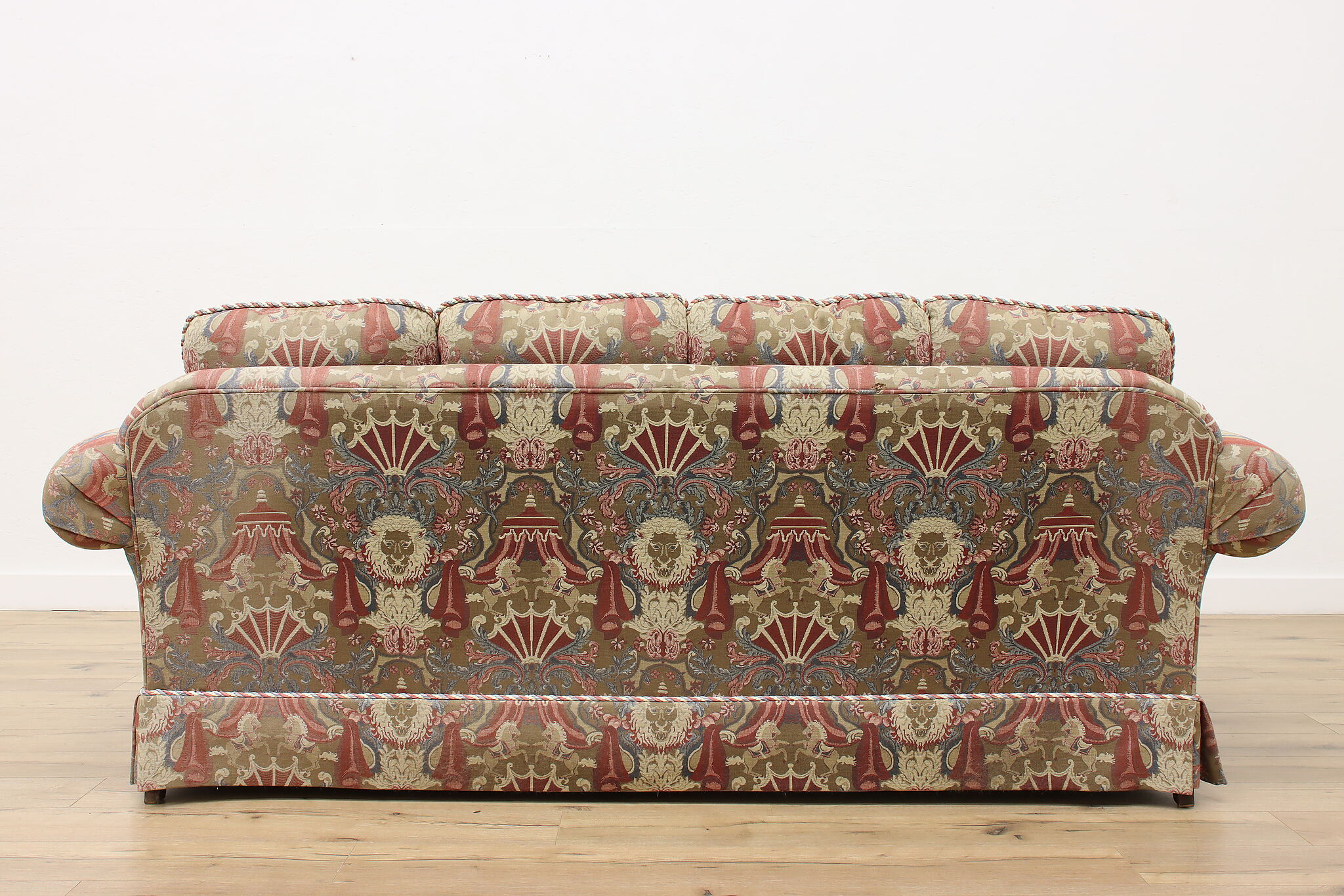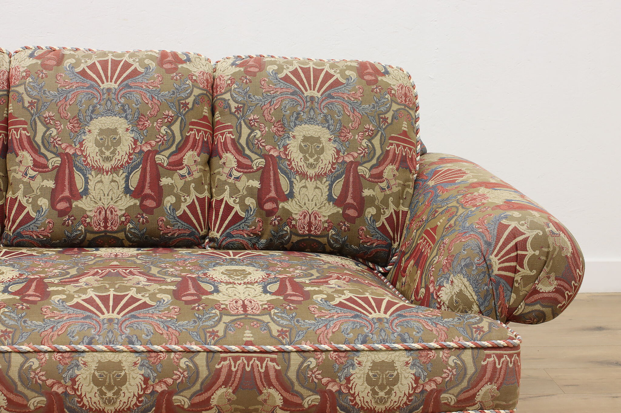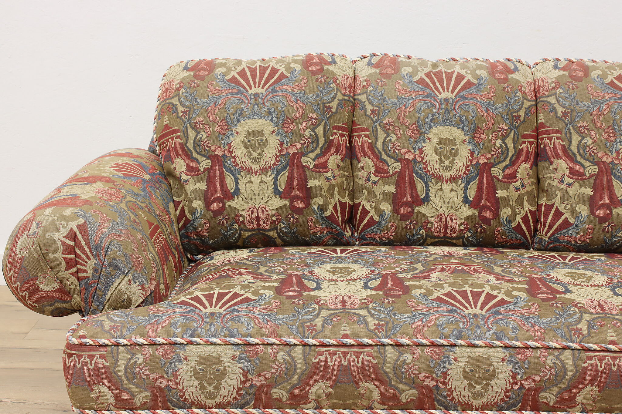 This traditional design sofa or couch has unique upholstery with circus tents, lions, and horses!