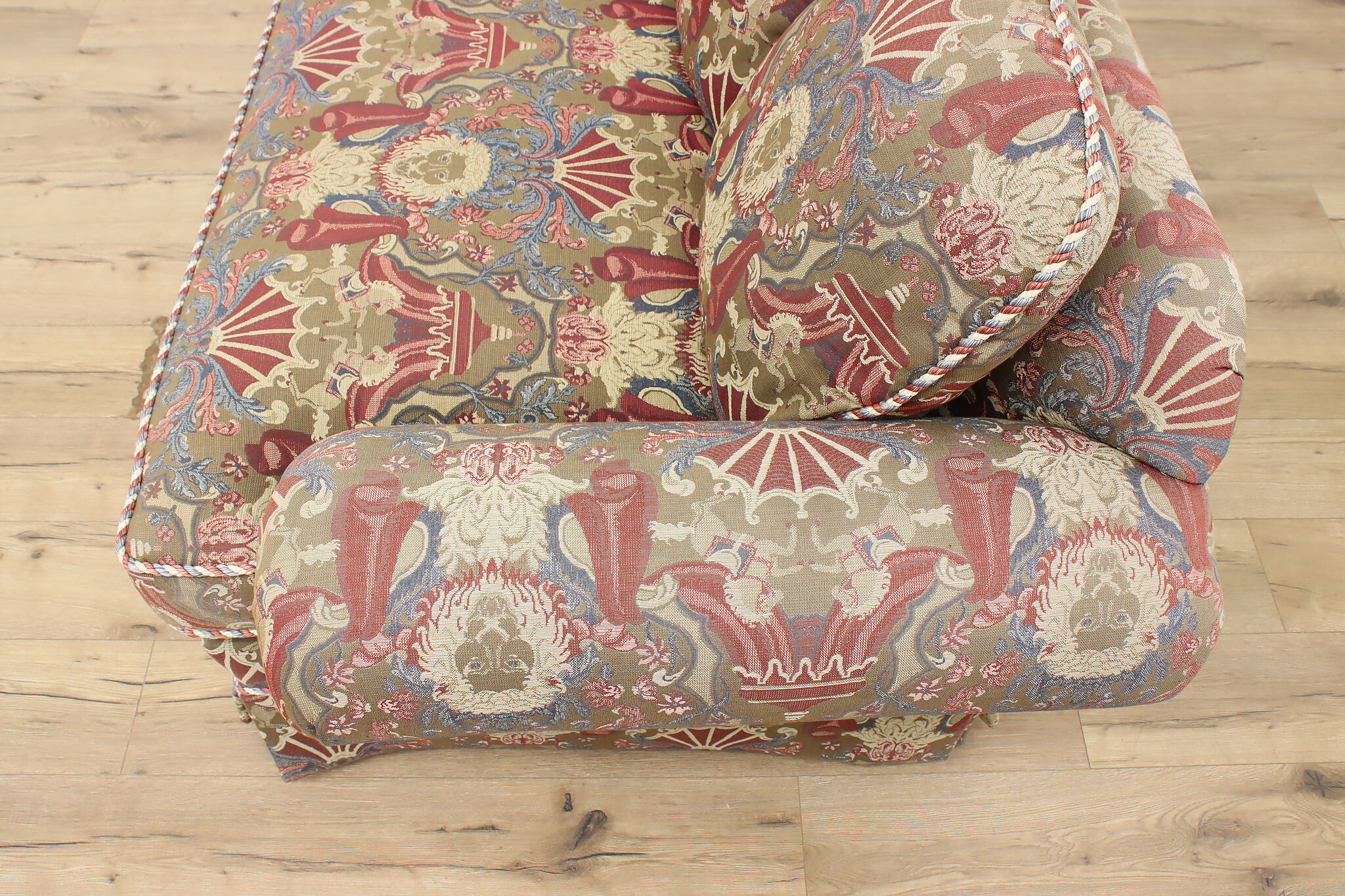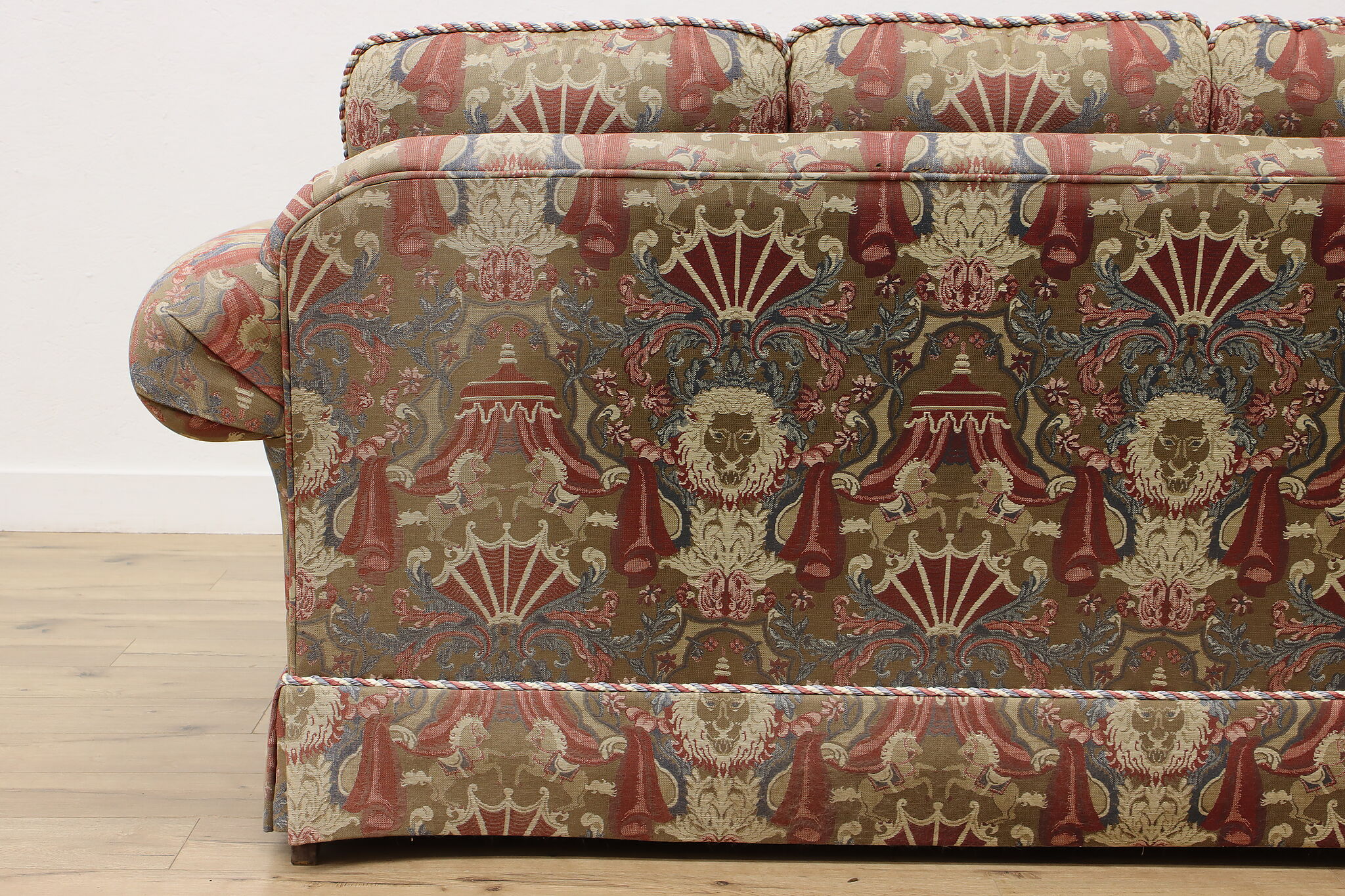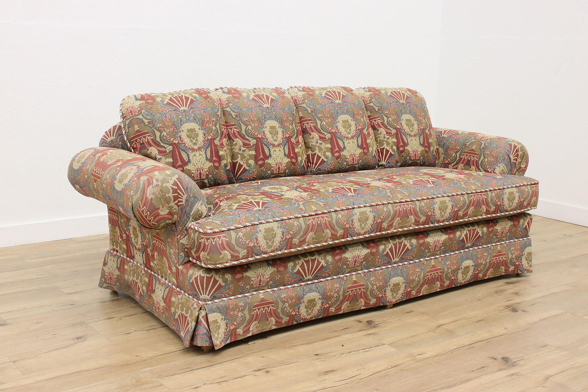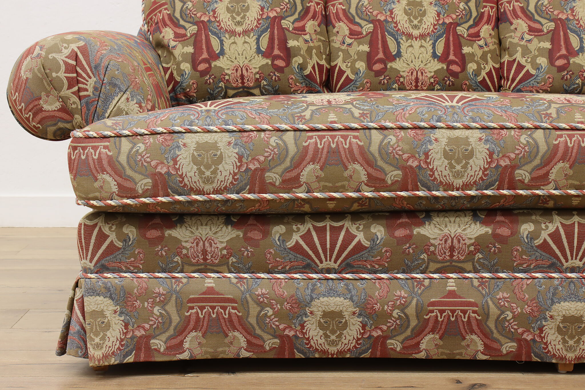 This traditional design sofa or couch has unique upholstery with circus tents, lions, and horses!
